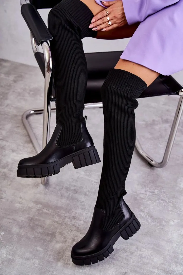 Modne damskie kozaki zostały wykonane z połączenia eko skóry oraz prążkowanej tkaniny. Cholewka za kolano. Model osadzony na płaskim obcasie i delikatnej platformie ze żłobieniami. Buty te posiadają ocieplaną wkładkę. Nosek zaokrąglony. Model wsuwany. Świetnie będą prezentować się z sukienkami lub spódniczkami mini. Przy wyborze rozmiaru prosimy kierować tabelą rozmiarów.