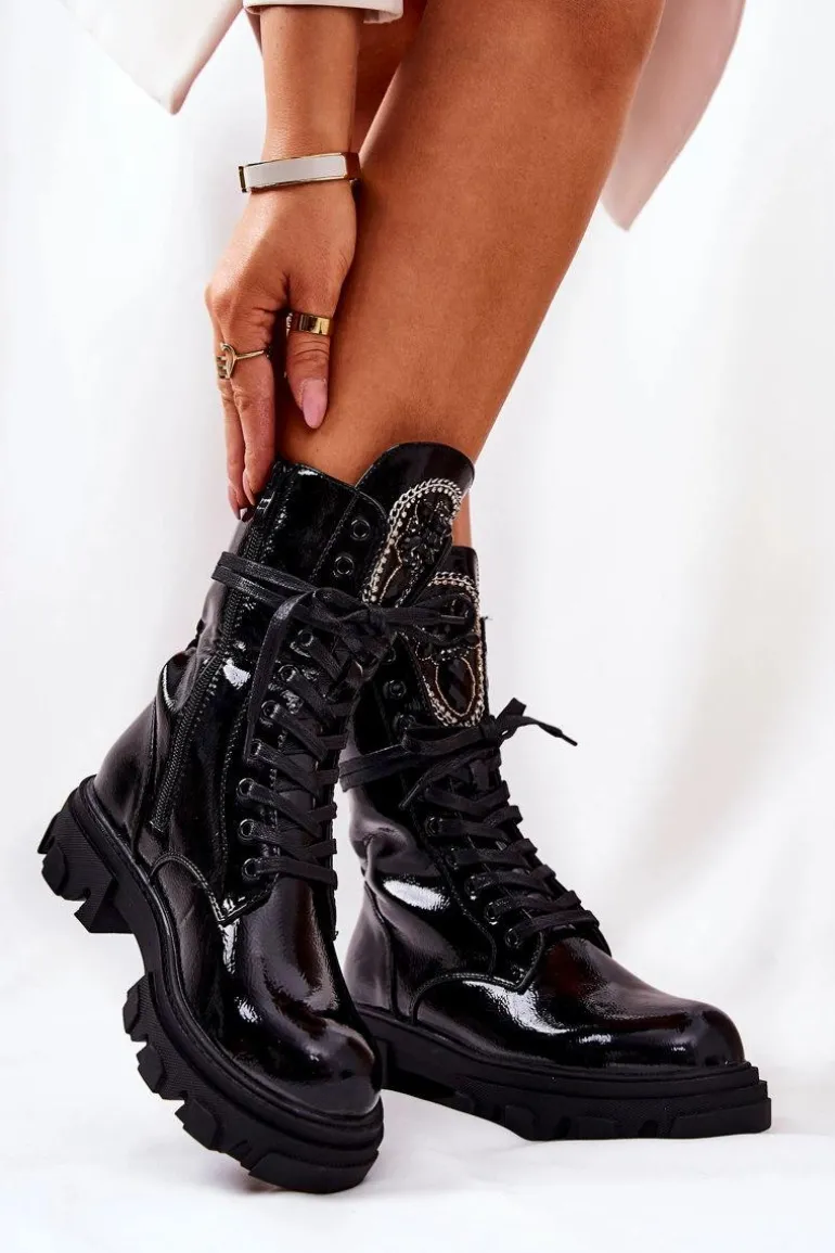 Świetne, wysokie botki posiadają na języku zdobienie w postaci koralików, cyrkonii oraz łańcuszka. Wykonane z lakierowanej eko skóry. Posiadają wiązanie oraz suwak ułatwiający zakładanie obuwia. Masywna, traperowa podeszwa zapewnia stabilność na każdym kroku. W środku posiadają ocieplenie w postaci delikatnego futerka. Przy wyborze rozmiaru prosimy sugerować się tabelą rozmiarów.