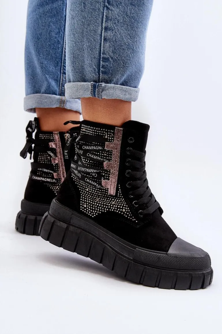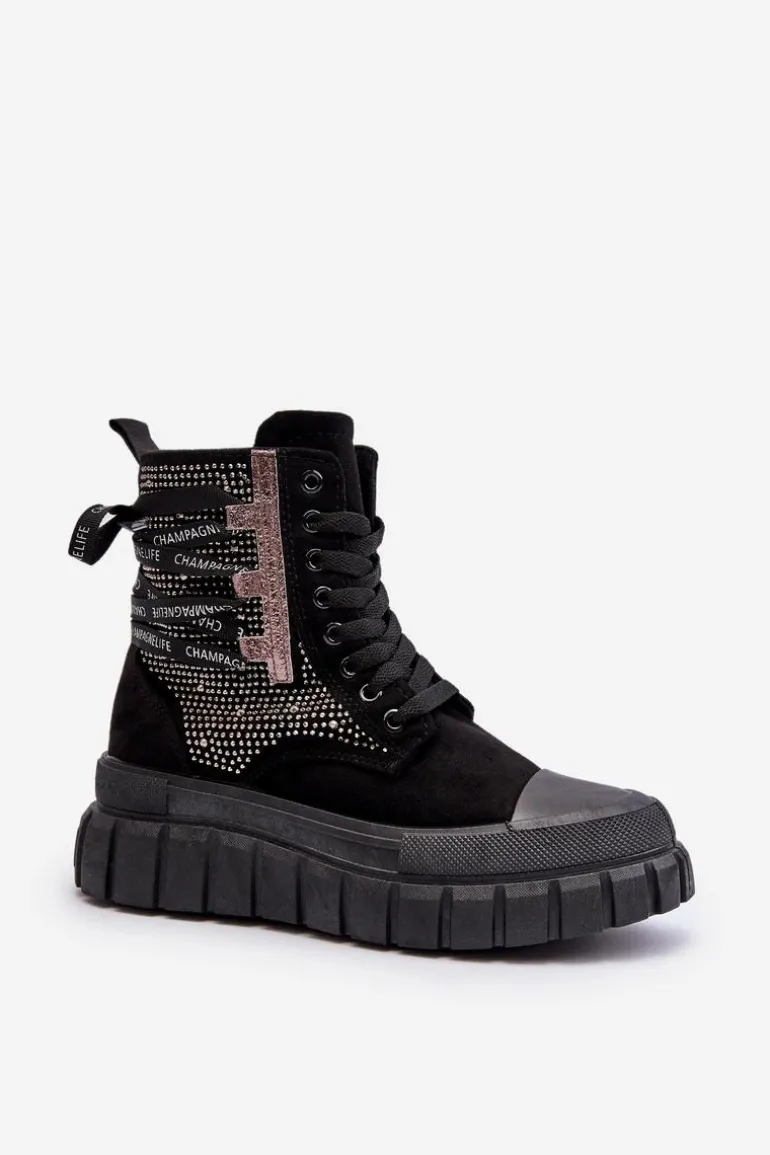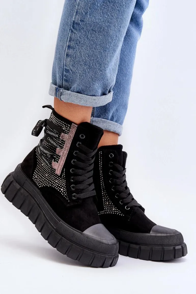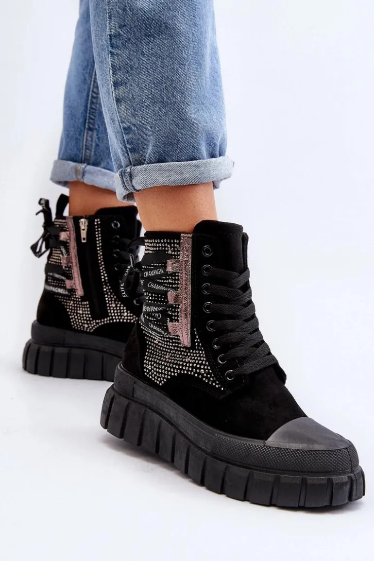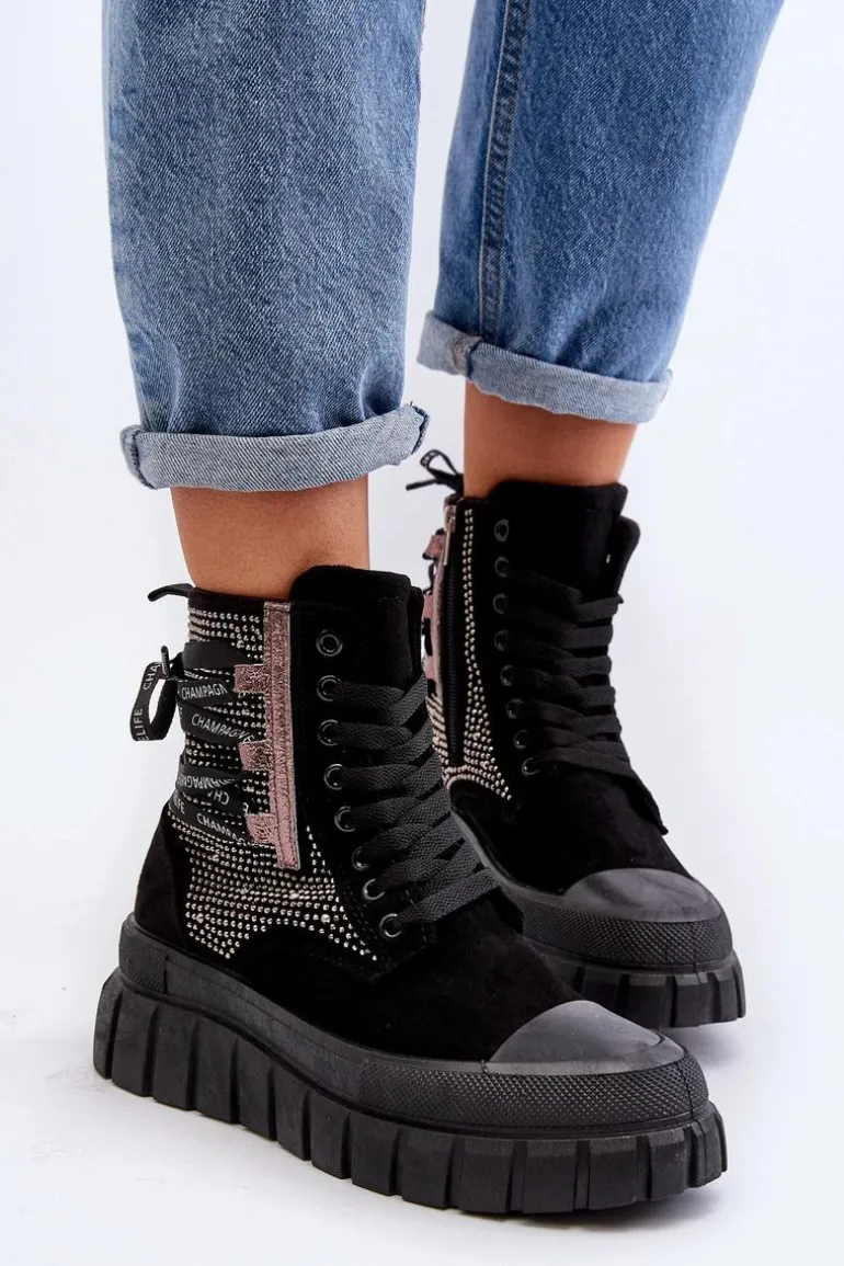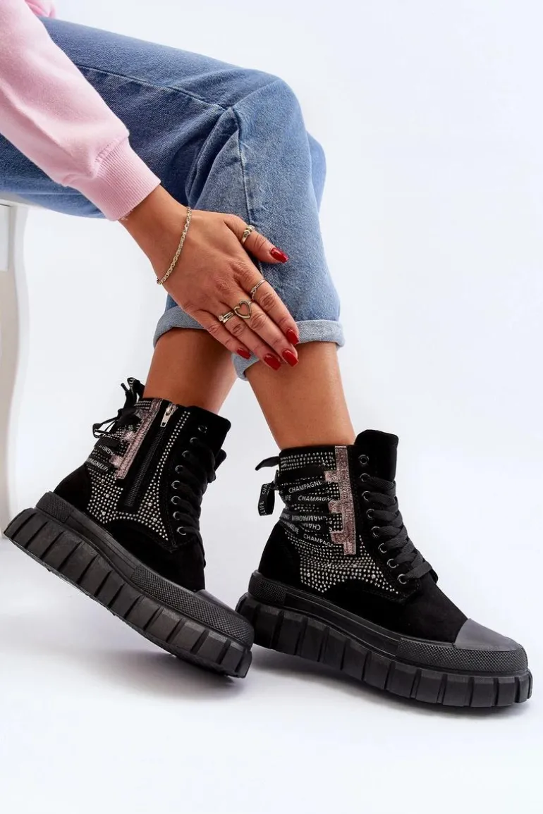 Wysokie trampki damskie wykonane z połączenia eko zamszu i materiału tekstylnego. Ich masywna platforma i podwójne sznurowanie nadają im nowoczesny wygląd, który świetnie komponuje się w różnych stylizacjach. Dodatkowe zapięcie na zamek ułatwi zakładanie obuwia. To absolutny must-have w Twojej garderobie! Przy wyborze rozmiaru prosimy sugerować się tabelą rozmiarów.