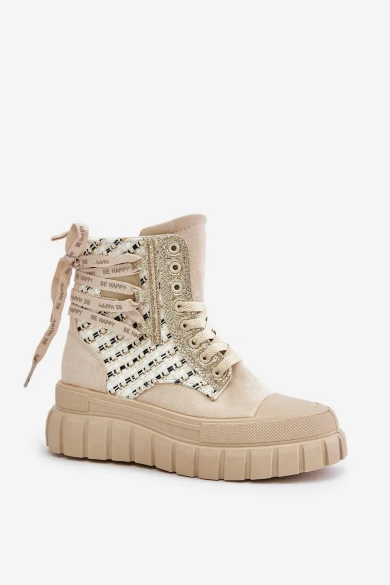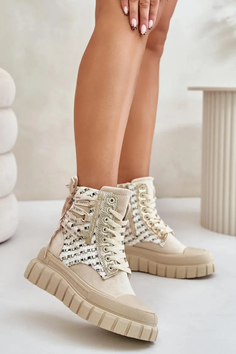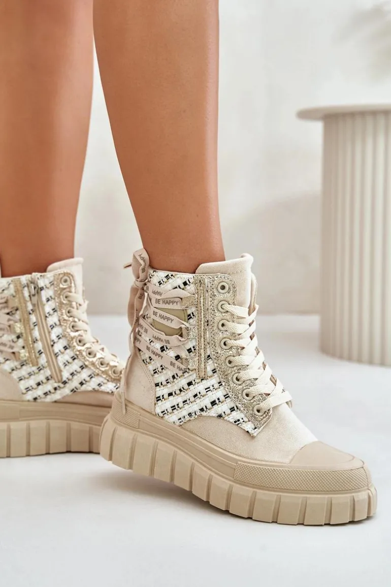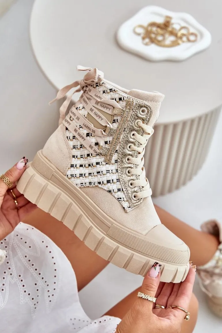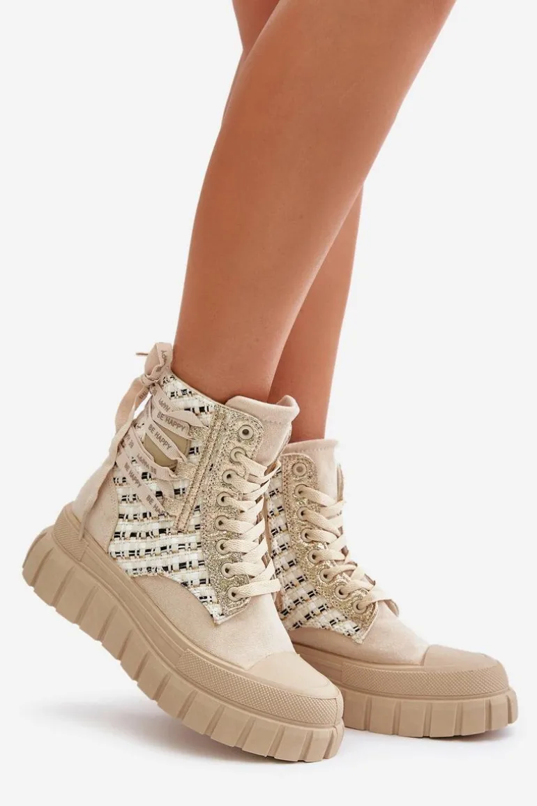Wysokie trampki damskie wykonane z połączenia eko zamszu i materiału tekstylnego. Ich masywna platforma i podwójne sznurowanie nadają im nowoczesny wygląd, który świetnie komponuje się w różnych stylizacjach. Dodatkowe zapięcie na zamek ułatwi zakładanie obuwia. To absolutny must-have w Twojej garderobie! Przy wyborze rozmiaru prosimy sugerować się tabelą rozmiarów.