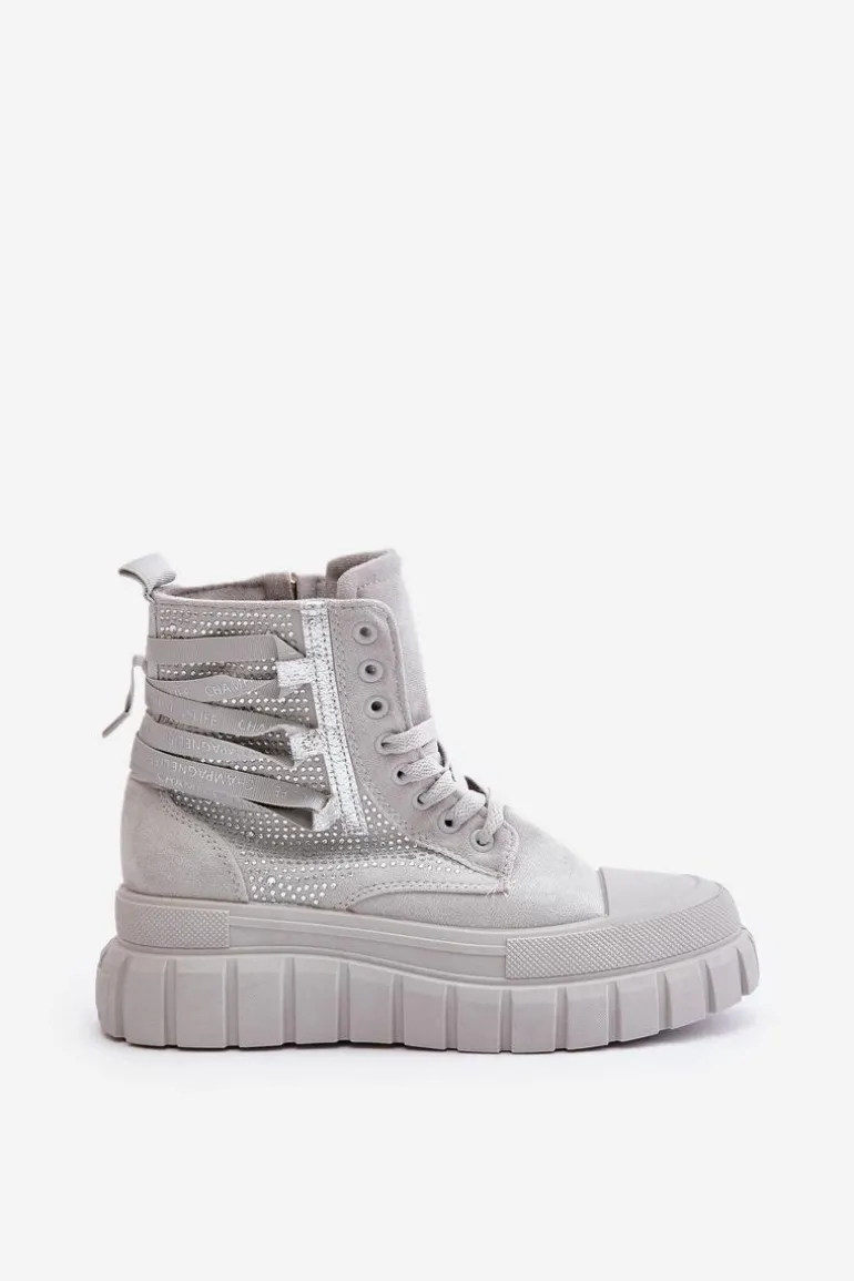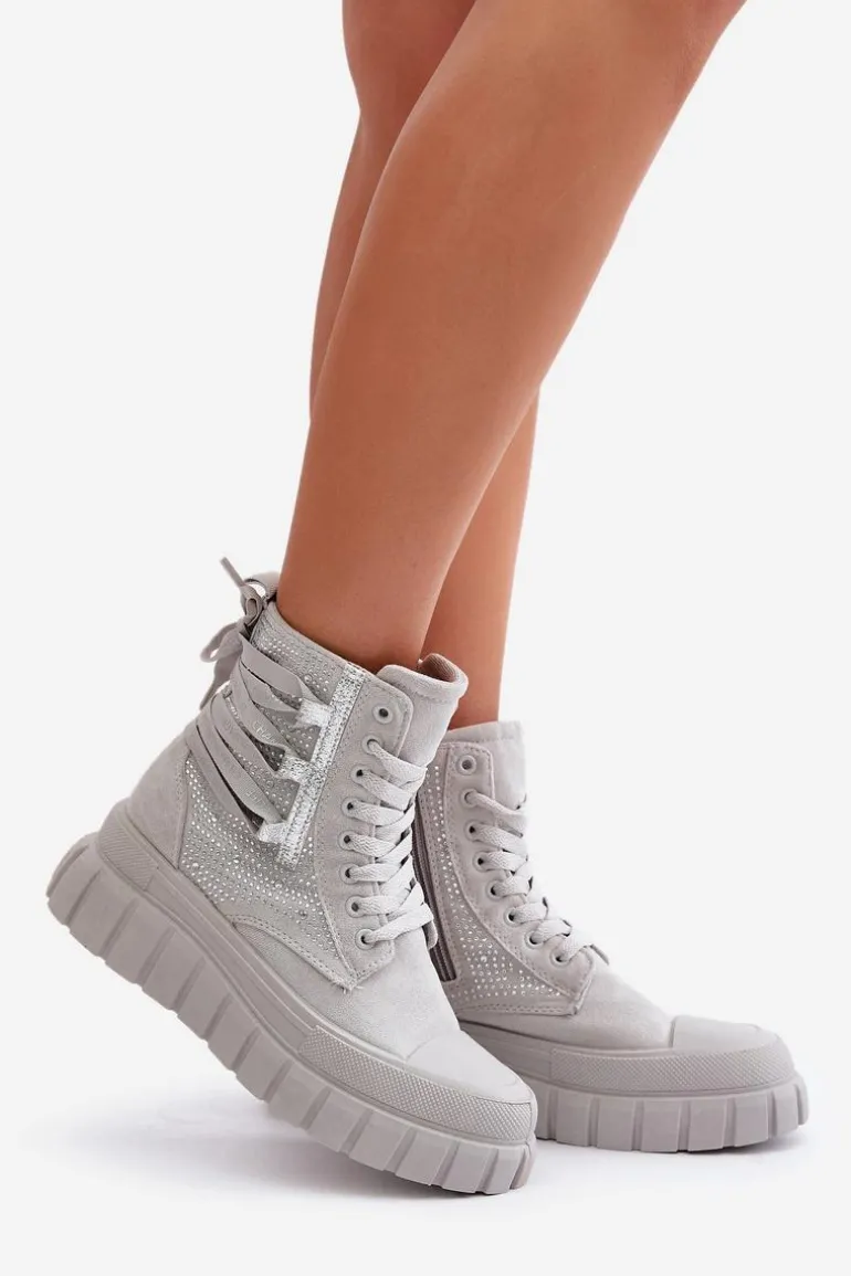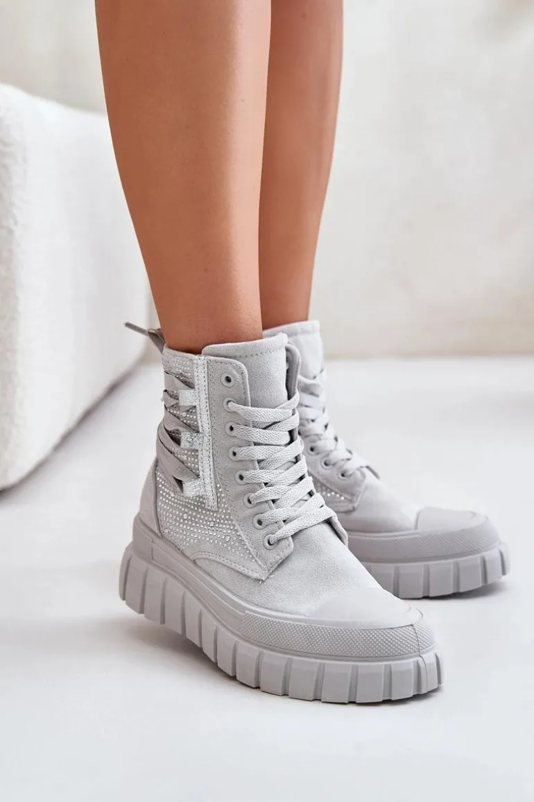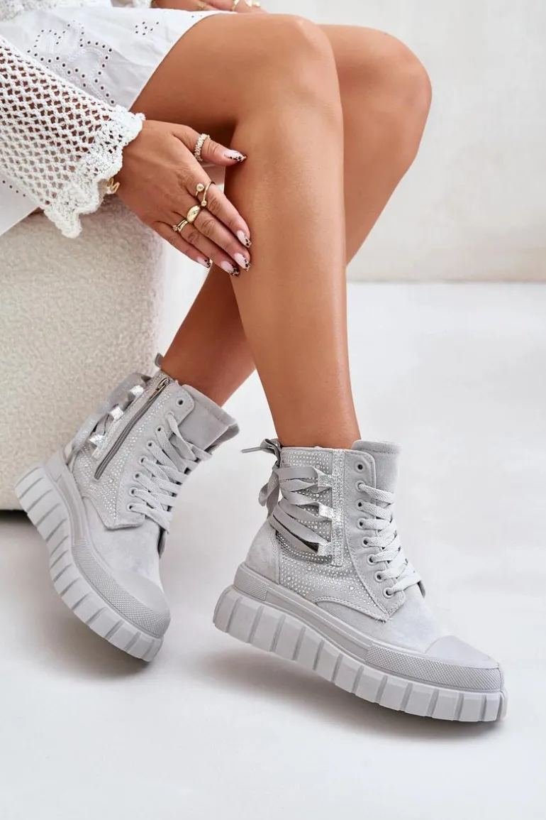 Wysokie trampki damskie wykonane z połączenia eko zamszu i materiału tekstylnego. Ich masywna platforma i podwójne sznurowanie nadają im nowoczesny wygląd, który świetnie komponuje się w różnych stylizacjach. Dodatkowe zapięcie na zamek ułatwi zakładanie obuwia. To absolutny must-have w Twojej garderobie! Przy wyborze rozmiaru prosimy sugerować się tabelą rozmiarów.