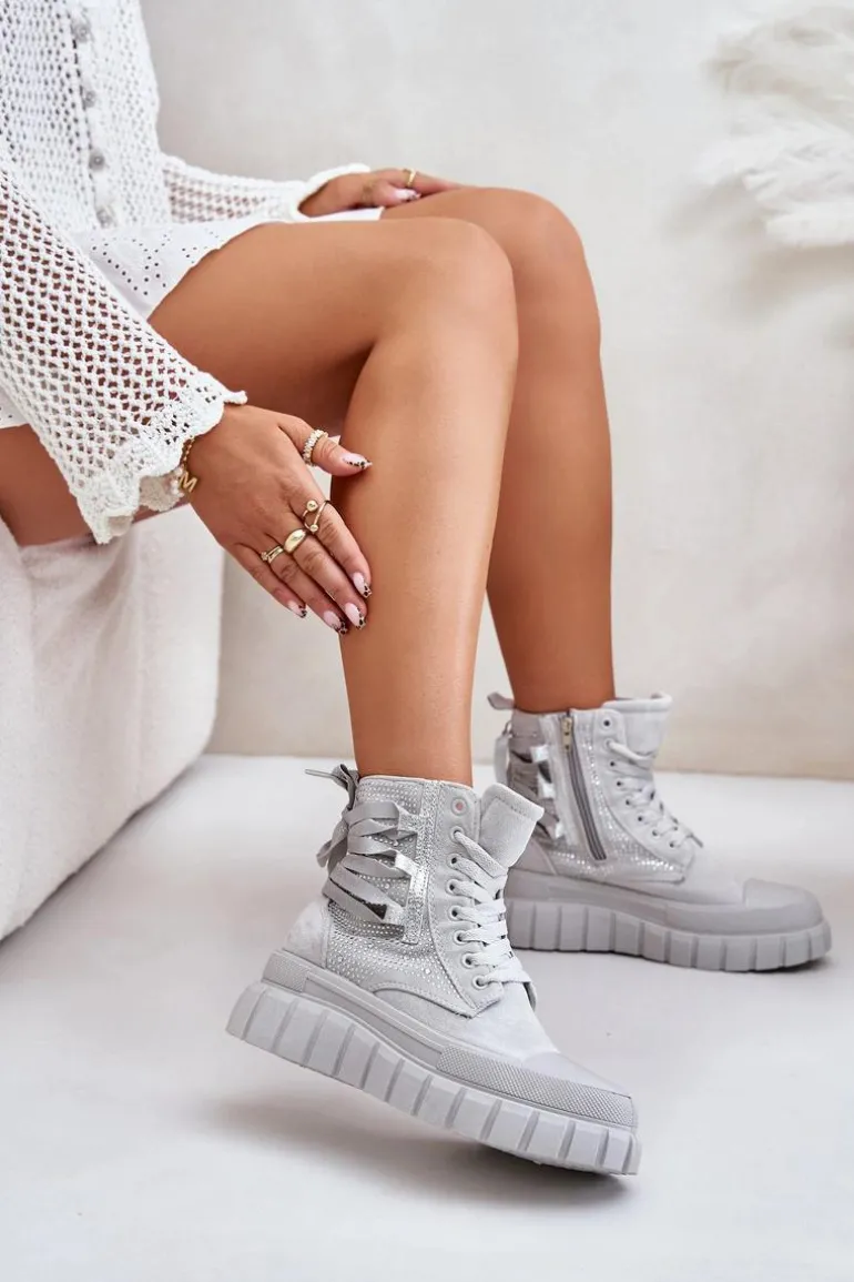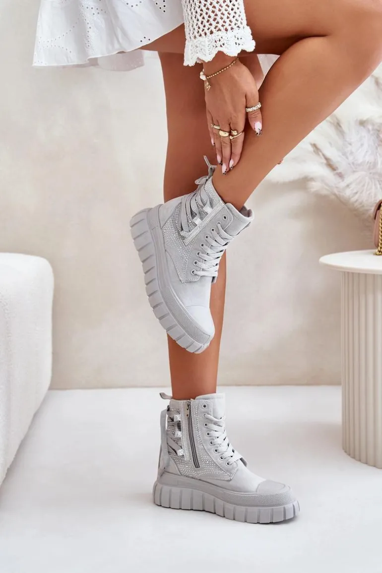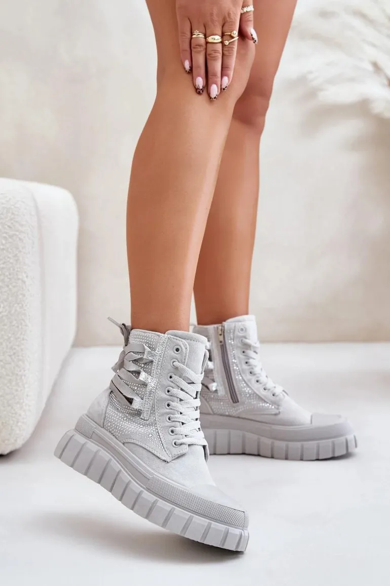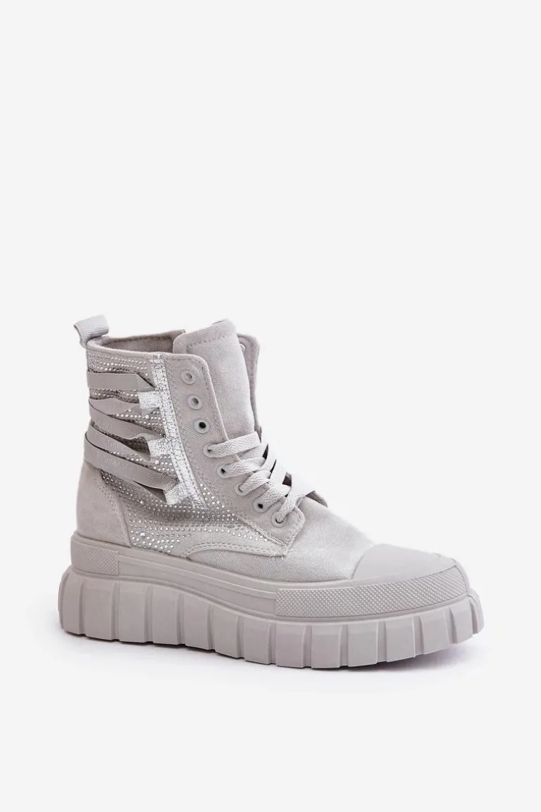 Wysokie trampki damskie wykonane z połączenia eko zamszu i materiału tekstylnego. Ich masywna platforma i podwójne sznurowanie nadają im nowoczesny wygląd, który świetnie komponuje się w różnych stylizacjach. Dodatkowe zapięcie na zamek ułatwi zakładanie obuwia. To absolutny must-have w Twojej garderobie! Przy wyborze rozmiaru prosimy sugerować się tabelą rozmiarów.