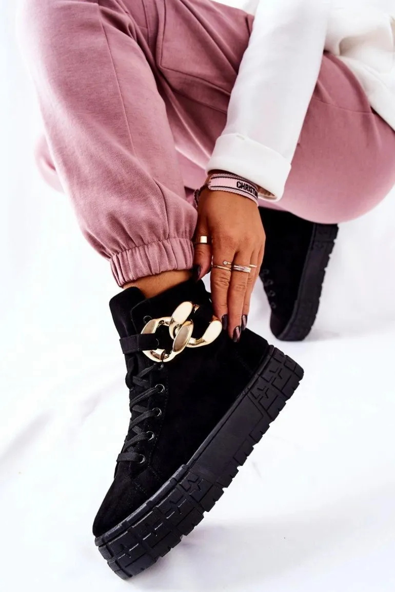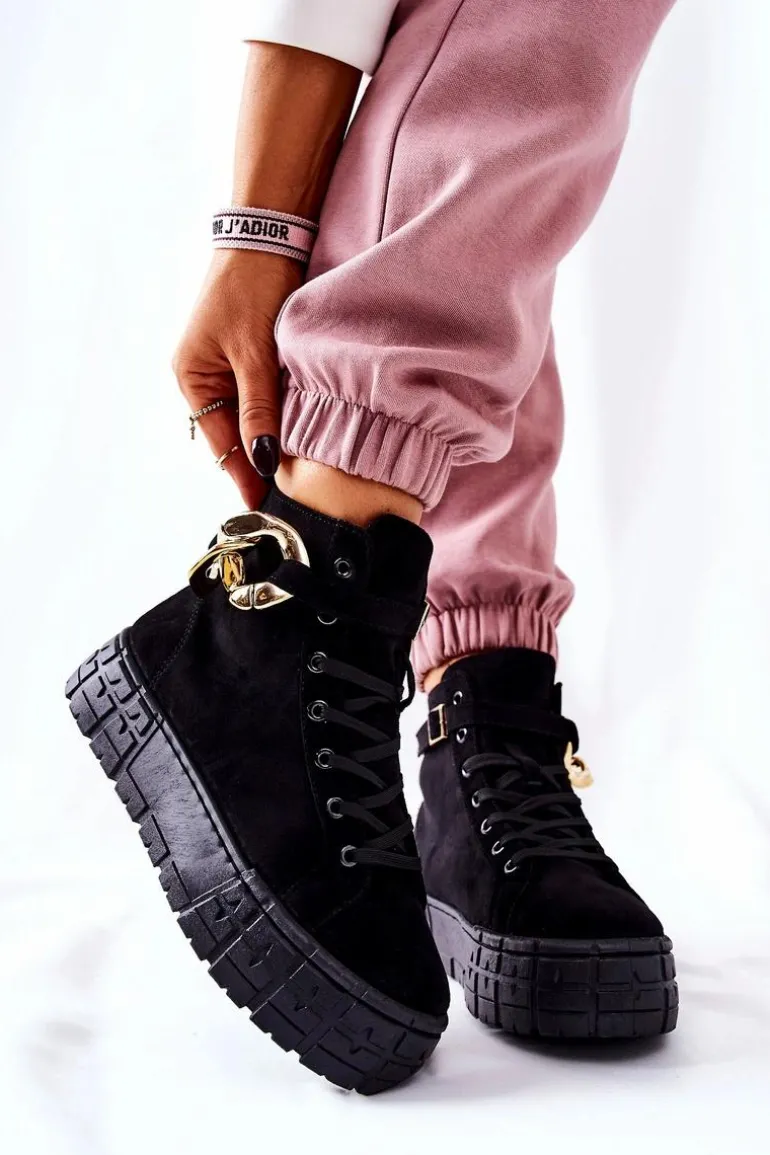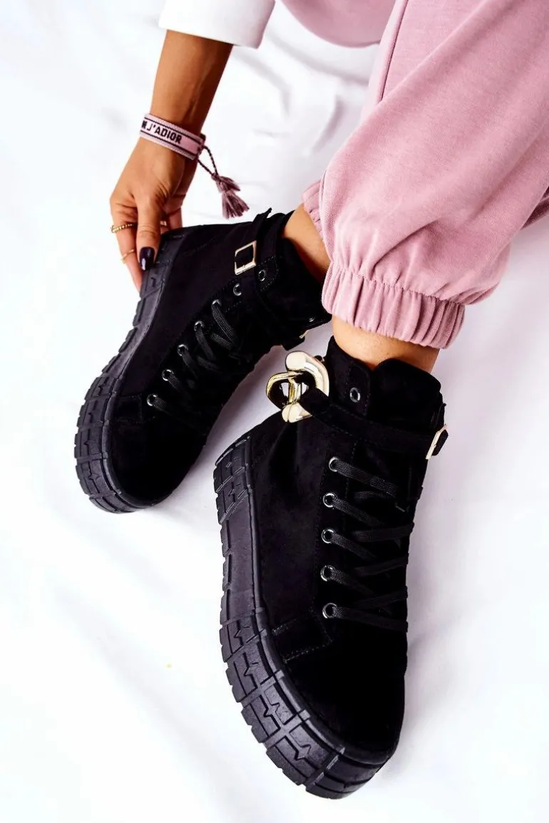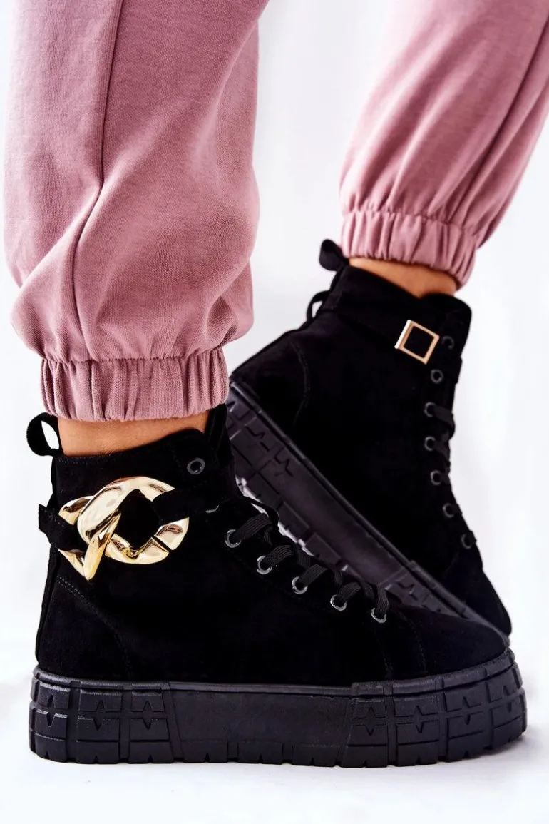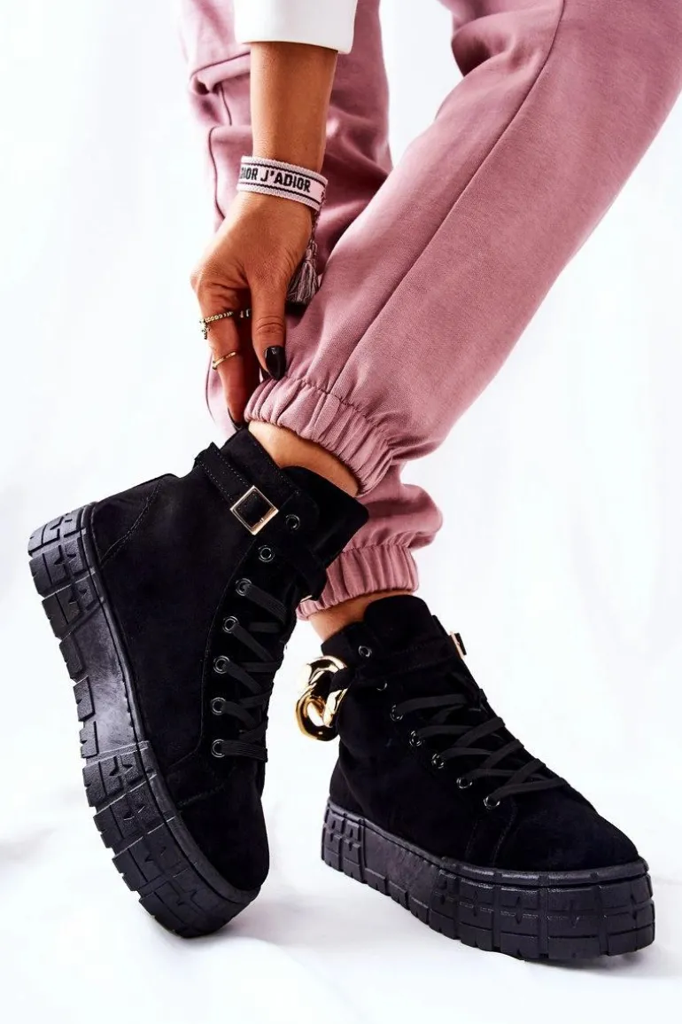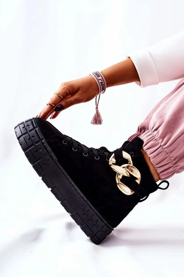 Buty zostały wykonane z zamszowej eko skóry. Wysokie trampki posiadają ozdobny łańcuch na pasku, który jest zapinany na sprzączkę. Można go także całkowicie zdjąć. Buty posiadają wysoką, stabilną platformę. Wśrodku znajduje się materiałowa wkładka. Koniecznie sprawdź także pozostałą naszą ofertę trampek na platformie! Przy wyborze rozmiaru prosimy sugerować się tabelą rozmiarów.