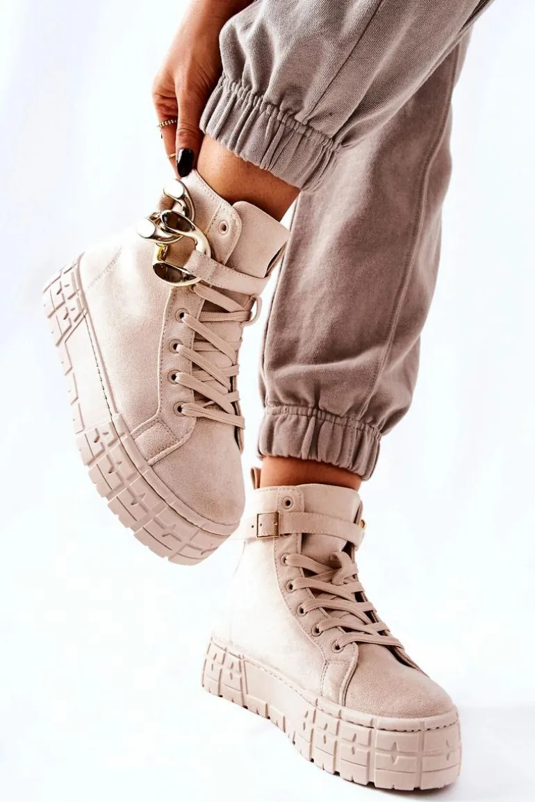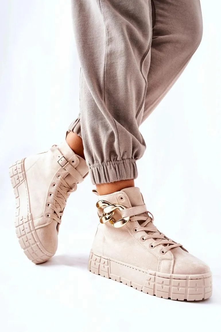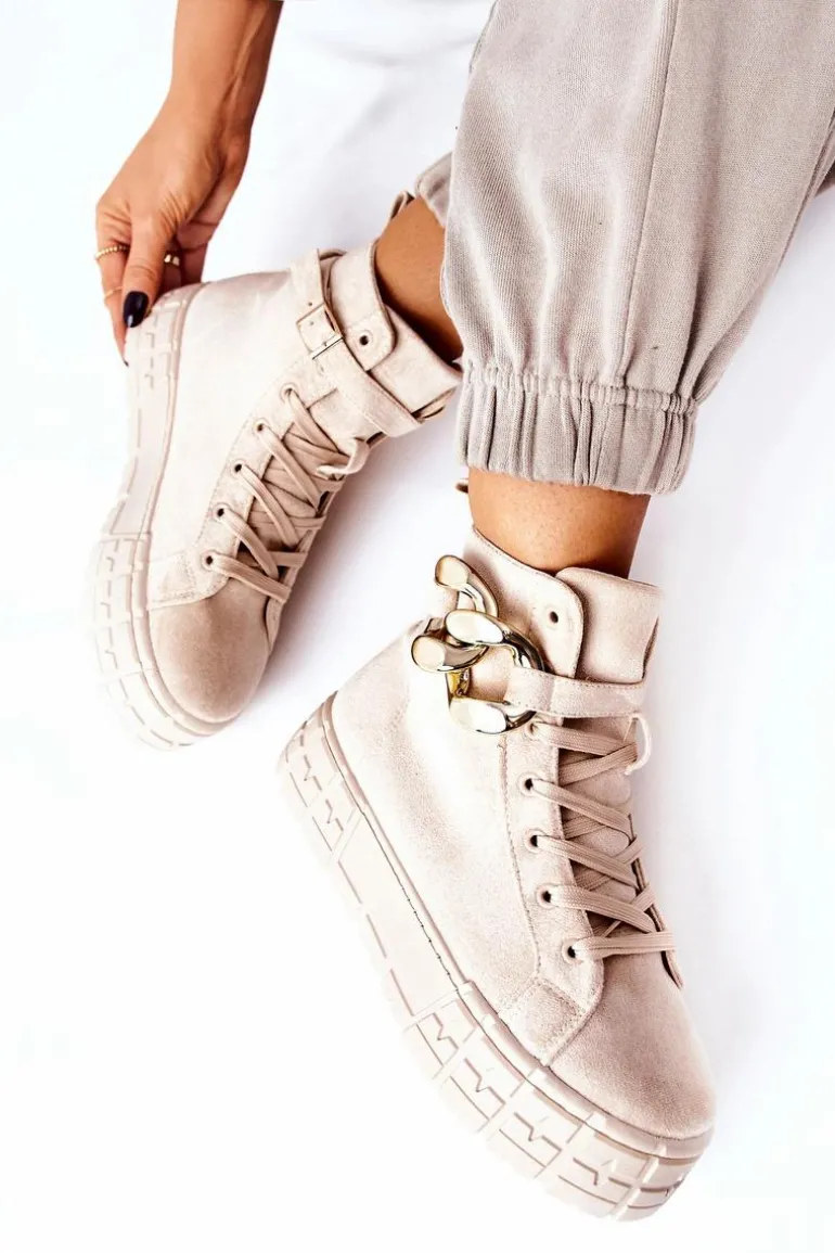 Buty zostały wykonane z zamszowej eko skóry. Wysokie trampki posiadają ozdobny łańcuch na pasku, który jest zapinany na sprzączkę. Można go także całkowicie zdjąć. Buty posiadają wysoką, stabilną platformę. Wśrodku znajduje się materiałowa wkładka. Koniecznie sprawdź także pozostałą naszą ofertę trampek na platformie! Przy wyborze rozmiaru prosimy sugerować się tabelą rozmiarów.