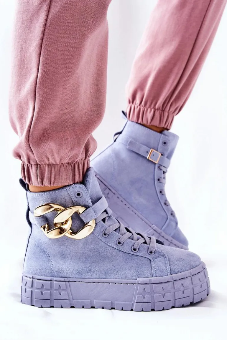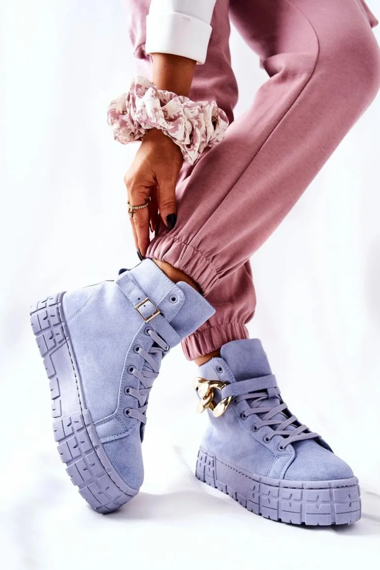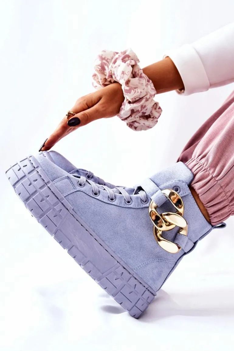 Buty zostały wykonane z zamszowej eko skóry. Wysokie trampki posiadają ozdobny łańcuch na pasku, który jest zapinany na sprzączkę. Można go także całkowicie zdjąć. Buty posiadają wysoką, stabilną platformę. Wśrodku znajduje się materiałowa wkładka. Koniecznie sprawdź także pozostałą naszą ofertę trampek na platformie! Przy wyborze rozmiaru prosimy sugerować się tabelą rozmiarów.