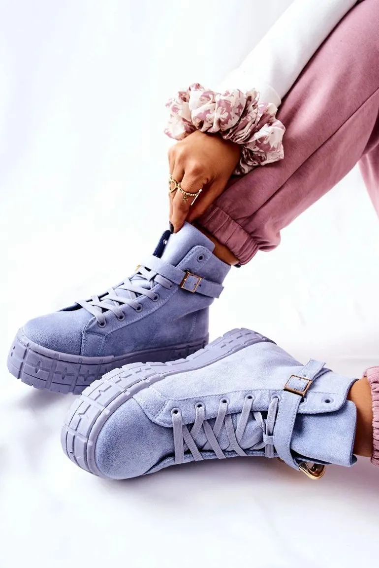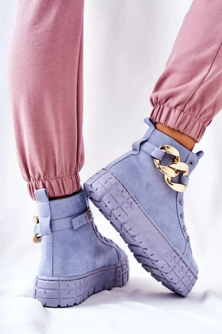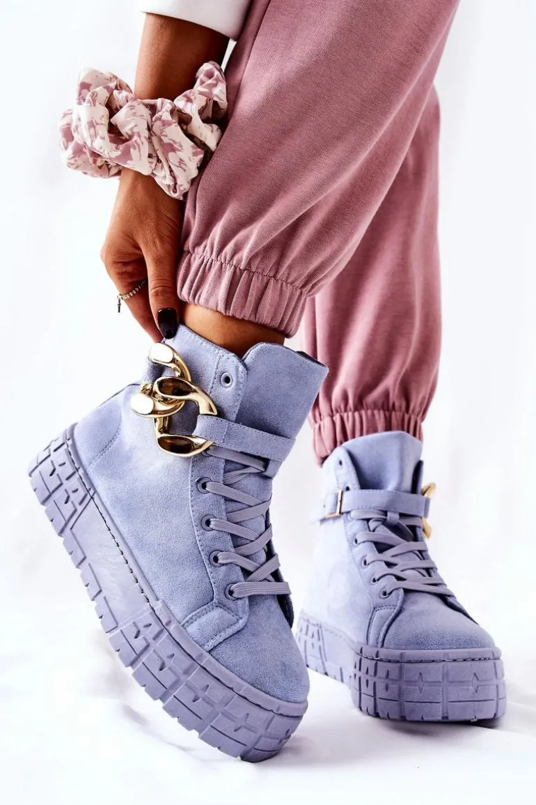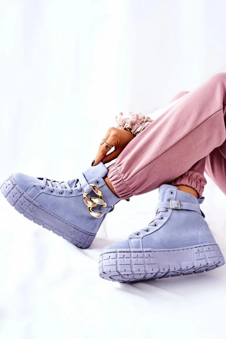 Buty zostały wykonane z zamszowej eko skóry. Wysokie trampki posiadają ozdobny łańcuch na pasku, który jest zapinany na sprzączkę. Można go także całkowicie zdjąć. Buty posiadają wysoką, stabilną platformę. Wśrodku znajduje się materiałowa wkładka. Koniecznie sprawdź także pozostałą naszą ofertę trampek na platformie! Przy wyborze rozmiaru prosimy sugerować się tabelą rozmiarów.