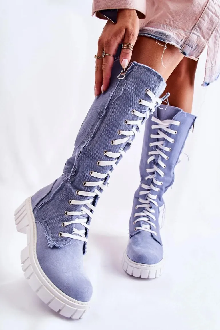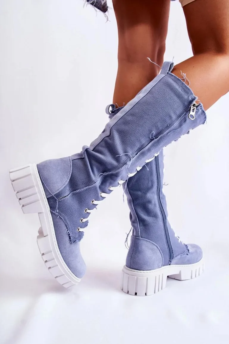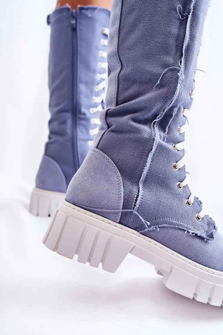 Wspaniałe kozaki w formie traperów. Wysoka cholewka została wykonana z połączenia materiału oraz eko zamszu. Zakładanie ułatwi wszyty na boku suwak, a idealne dopasowanie zapewni solidne sznurowanie na całej długości cholewki. Gruba podeszwa to dodatkowa ochrona przed zimnym podłożem. Wkładka wykonana z eko skóry. Zapiętek usztywniany. Przy wyborze rozmiaru prosimy sugerować się tabelą rozmiarów.