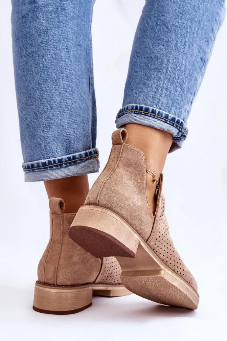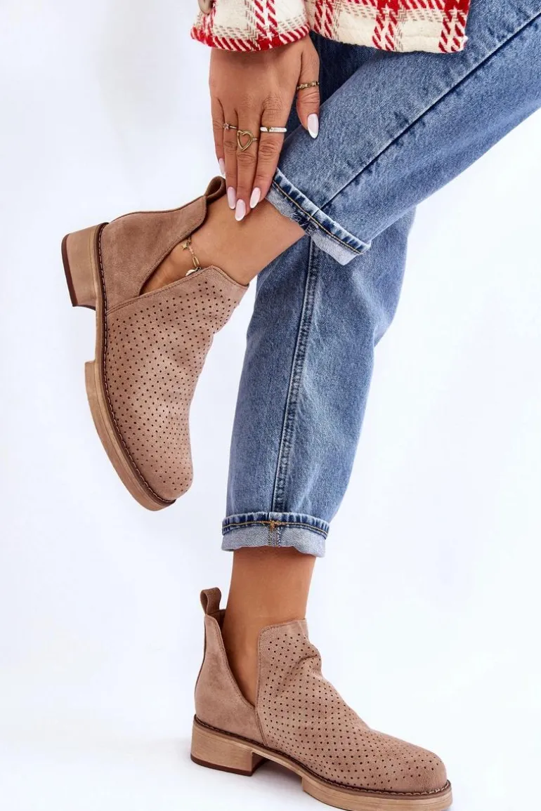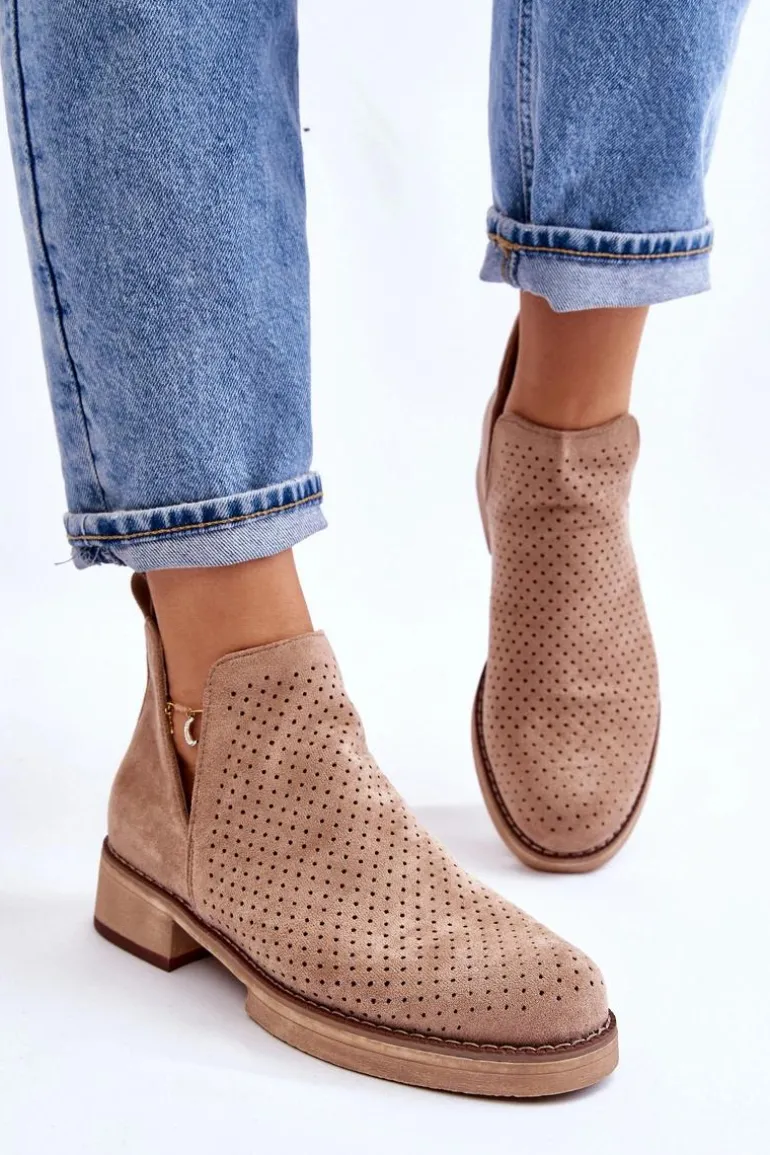 Botki zostały wykonane z eko zamszu w ażurowy wzór. Idealnie pasują do wielu kobiecych stylizacji. Miękka wkładka została wykonana z eko skóry. Model klasycznie wsuwany. Botki zostały osadzone na delikatnej platformie i płaskim obcasie. Świetnie sprawdzą się w sezonie wiosenno-letnim. Koniecznie musisz je mieć! Przy wyborze rozmiaru prosimy sugerować się tabelą rozmiarów.