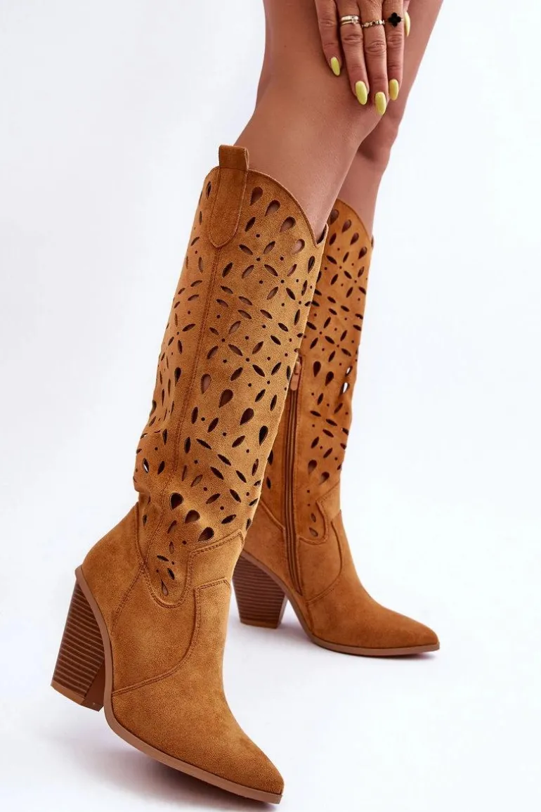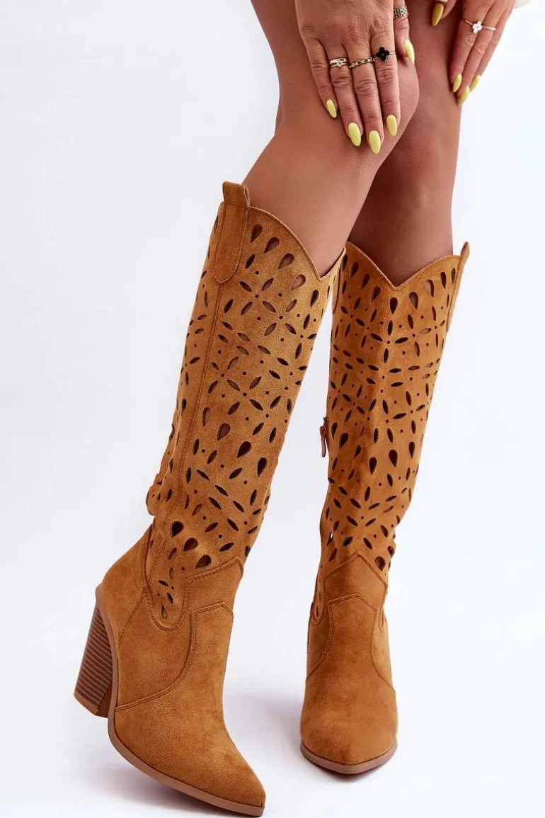 Damskie, modne kozaki zostały wykonane z eko zamszu. Ozdobione ażurowym wzorem oraz tłoczeniem. Buty te posiadają obcas w postaci niskiego słupka oraz usztywniony zapiętek. Model wsuwany i dodatkowo wzbogacony zapięciem na suwak. Przy wyborze rozmiaru prosimy sugerować się tabelą rozmiarów.