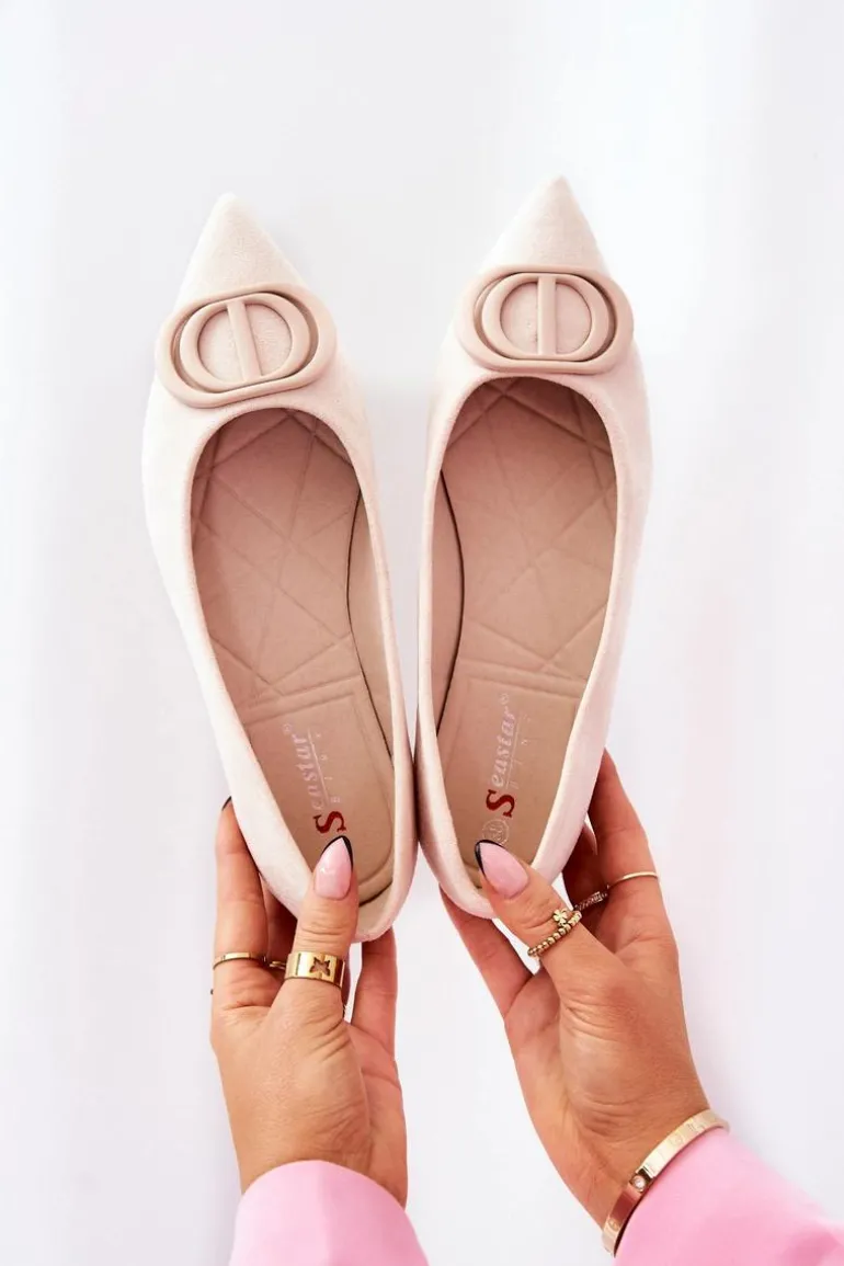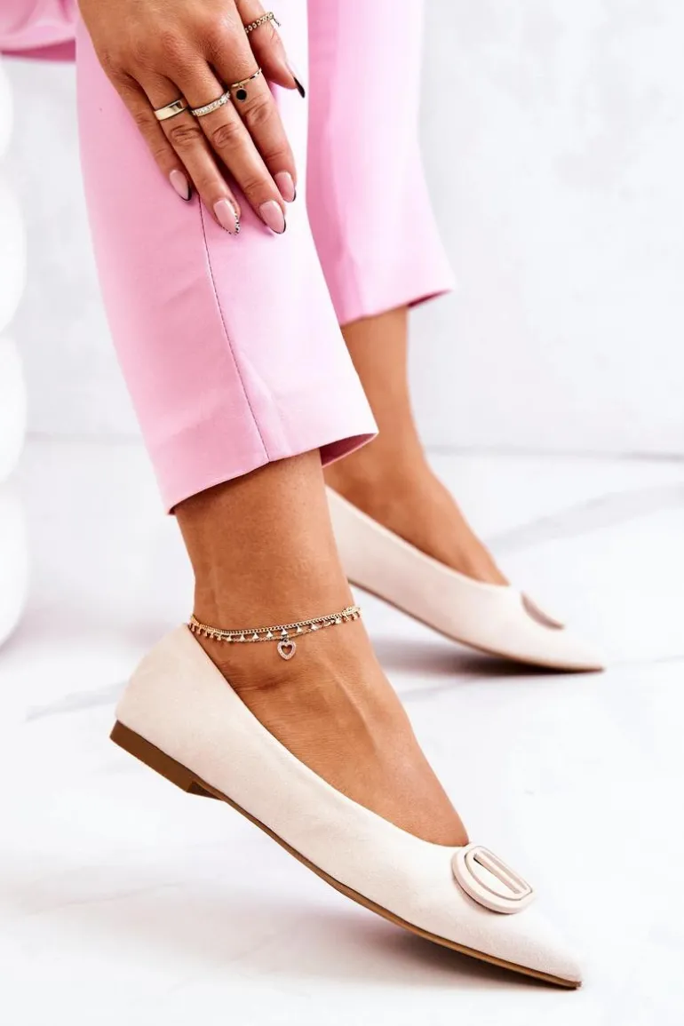 Eleganckie baleriny z ozdobnym elementem z tworzywa sztucznego. Buty wykonane są w całości z zamszowej eko skóry. Miękka wkładka zadba o Twój komfort. Nosek w szpic. Baleriny dopełnią wiele stylizacji i przydadzą się na wiele okazji. Koniecznie sprawdź całą naszą kolekcję balerinek. Przy wyborze rozmiaru prosimy sugerować się tabelą rozmiarów.