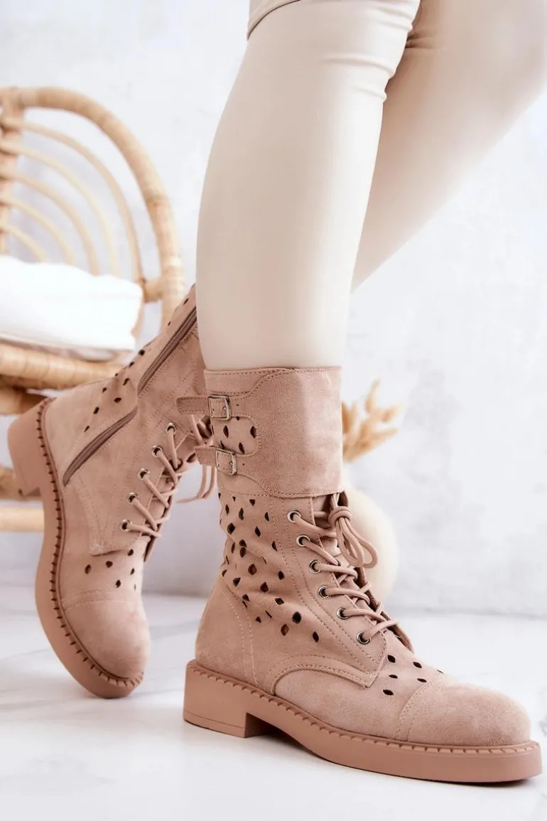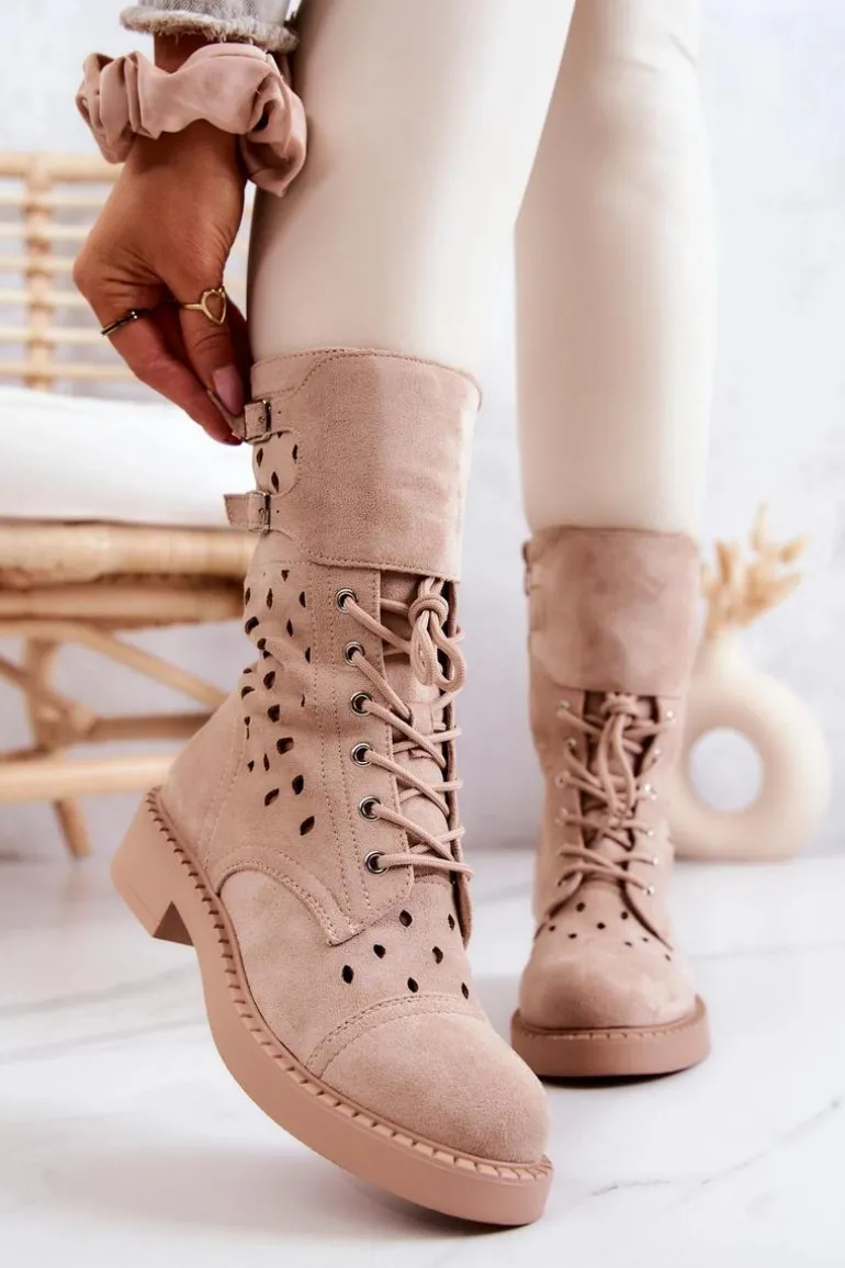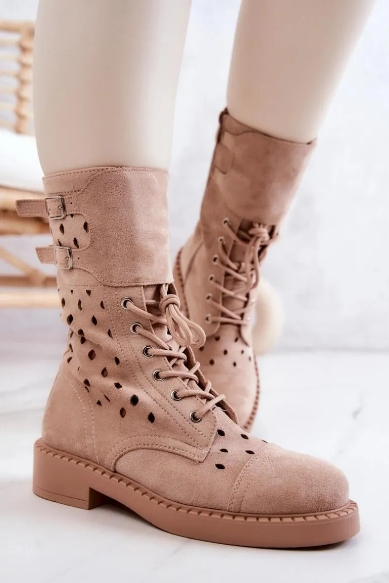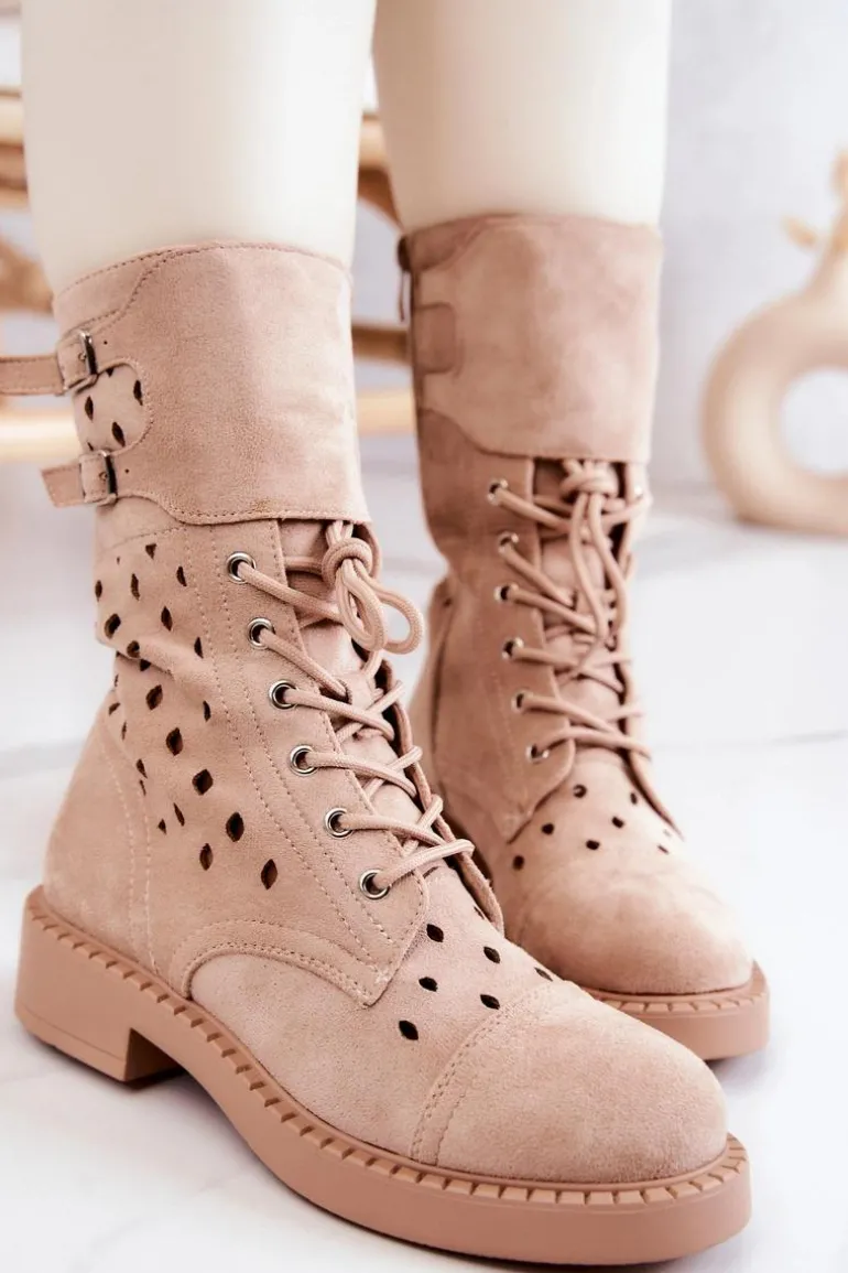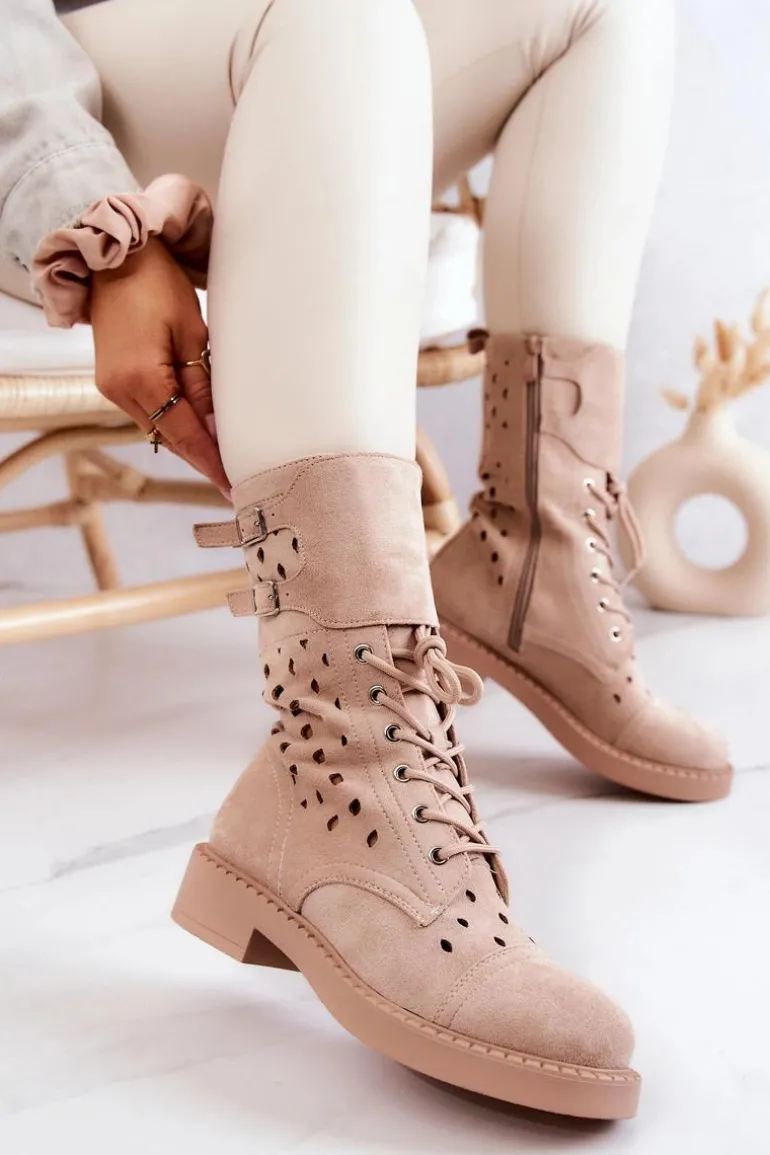 Buty zostały wykonane z eko zamszu. Wysokie botki posiadają zapinanie na suwak, wiązanie ułatwiające dopasowanie obuwia do tęgości nogi oraz regulowane paski zapinane na sprzączkę. Model ażurowy świetnie wpisze się w wiosenno-letnie stylizacje. Płaski obcas zapewni stabilność na każdym kroku.Przy wyborze rozmiaru prosimy sugerować się tabelą rozmiarów.