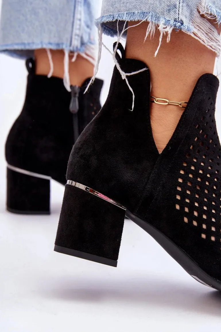 Zamszowe Botki Ażurowe Z Wycięciem Na Obcasie Czarne Blakely