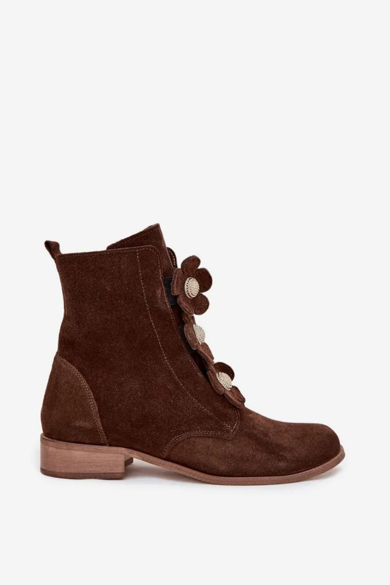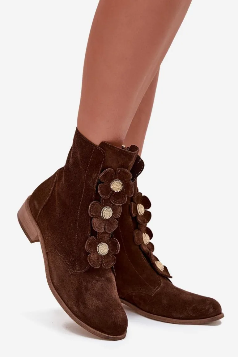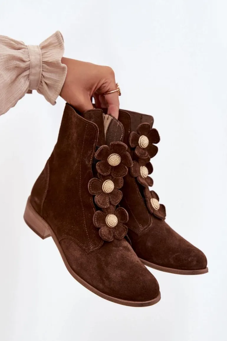 Botki damskie z naturalnego zamszu to doskonały wybór dla kobiet ceniących elegancję i subtelność. Wykonane z wysokiej jakości materiału, oferują nie tylko estetyczny wygląd, ale także komfort noszenia przez cały dzień. Zapinane na zamek błyskawiczny. Przód buta ozdobiony jest pięknymi, urokliwymi kwiatkami, które nadają im niepowtarzalnego, delikatnego charakteru. Dzięki temu stanowią doskonały dodatek do zarówno codziennych, jak i bardziej eleganckich stylizacji. Świetnie komponują się z sukienkami, spódnicami czy spodniami. Przy wyborze rozmiaru prosimy sugerować się tabelą rozmiarów.