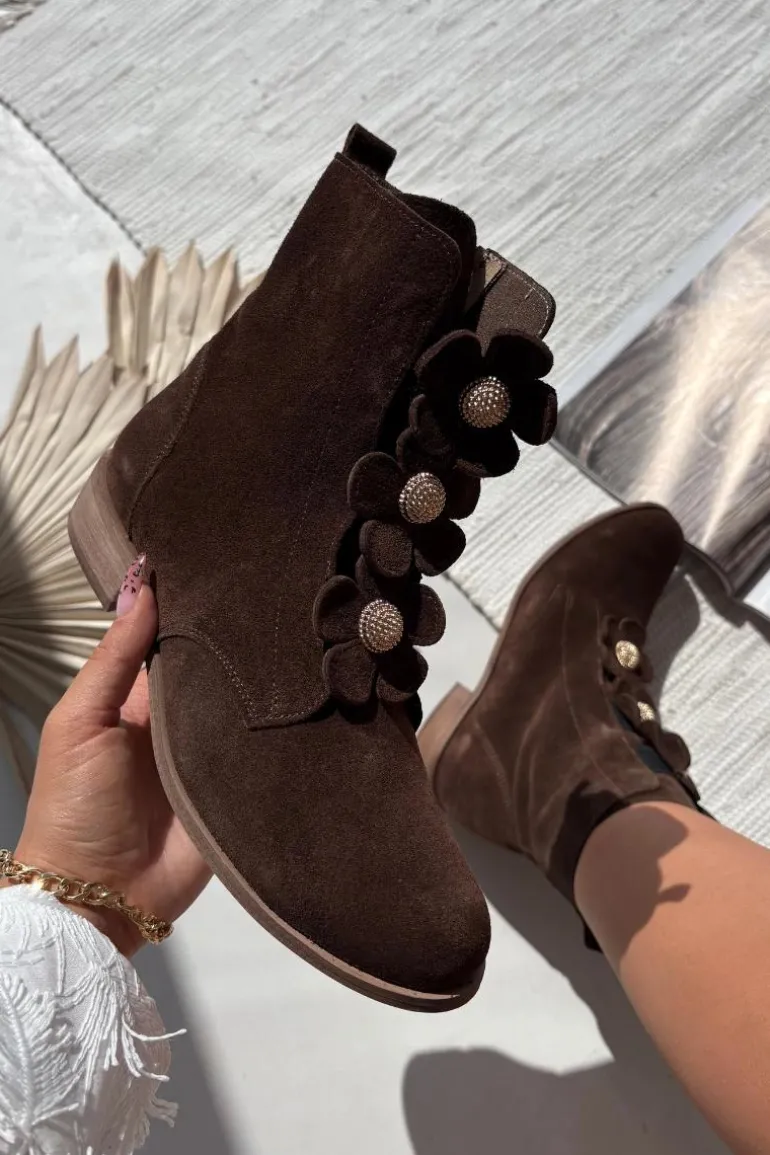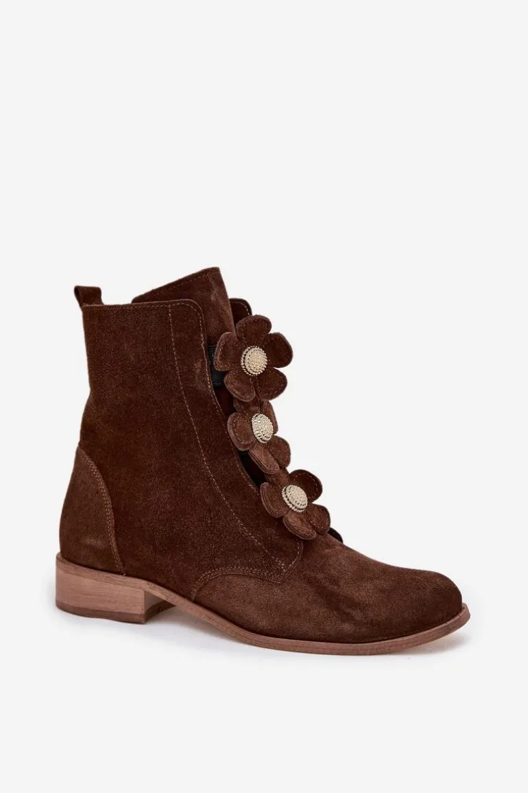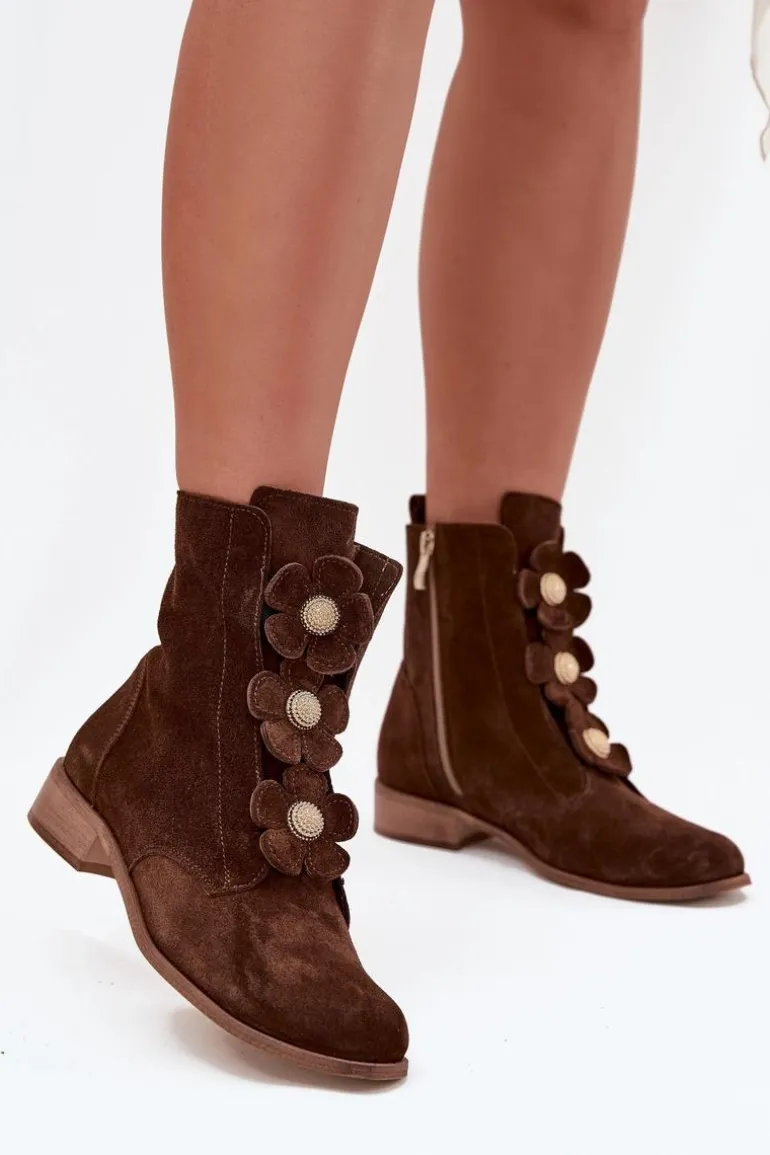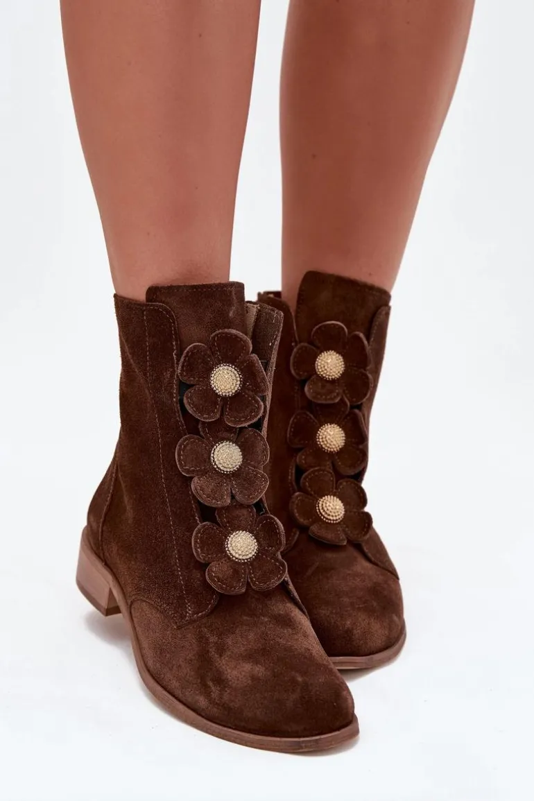 Botki damskie z naturalnego zamszu to doskonały wybór dla kobiet ceniących elegancję i subtelność. Wykonane z wysokiej jakości materiału, oferują nie tylko estetyczny wygląd, ale także komfort noszenia przez cały dzień. Zapinane na zamek błyskawiczny. Przód buta ozdobiony jest pięknymi, urokliwymi kwiatkami, które nadają im niepowtarzalnego, delikatnego charakteru. Dzięki temu stanowią doskonały dodatek do zarówno codziennych, jak i bardziej eleganckich stylizacji. Świetnie komponują się z sukienkami, spódnicami czy spodniami. Przy wyborze rozmiaru prosimy sugerować się tabelą rozmiarów.