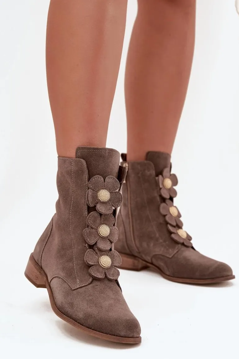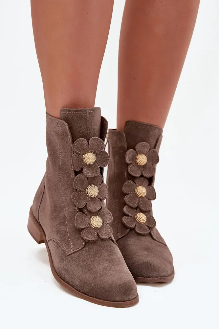 Botki damskie z naturalnego zamszu to doskonały wybór dla kobiet ceniących elegancję i subtelność. Wykonane z wysokiej jakości materiału, oferują nie tylko estetyczny wygląd, ale także komfort noszenia przez cały dzień. Zapinane na zamek błyskawiczny. Przód buta ozdobiony jest pięknymi, urokliwymi kwiatkami, które nadają im niepowtarzalnego, delikatnego charakteru. Dzięki temu stanowią doskonały dodatek do zarówno codziennych, jak i bardziej eleganckich stylizacji. Świetnie komponują się z sukienkami, spódnicami czy spodniami. Przy wyborze rozmiaru prosimy sugerować się tabelą rozmiarów.