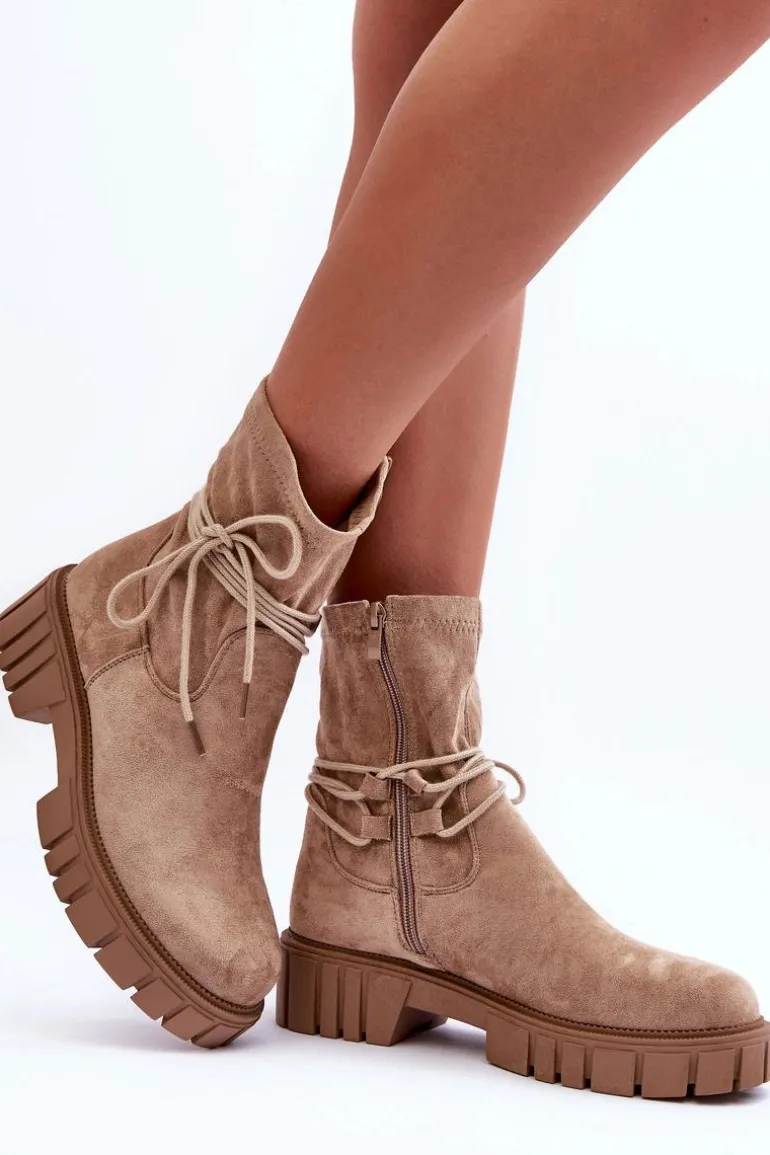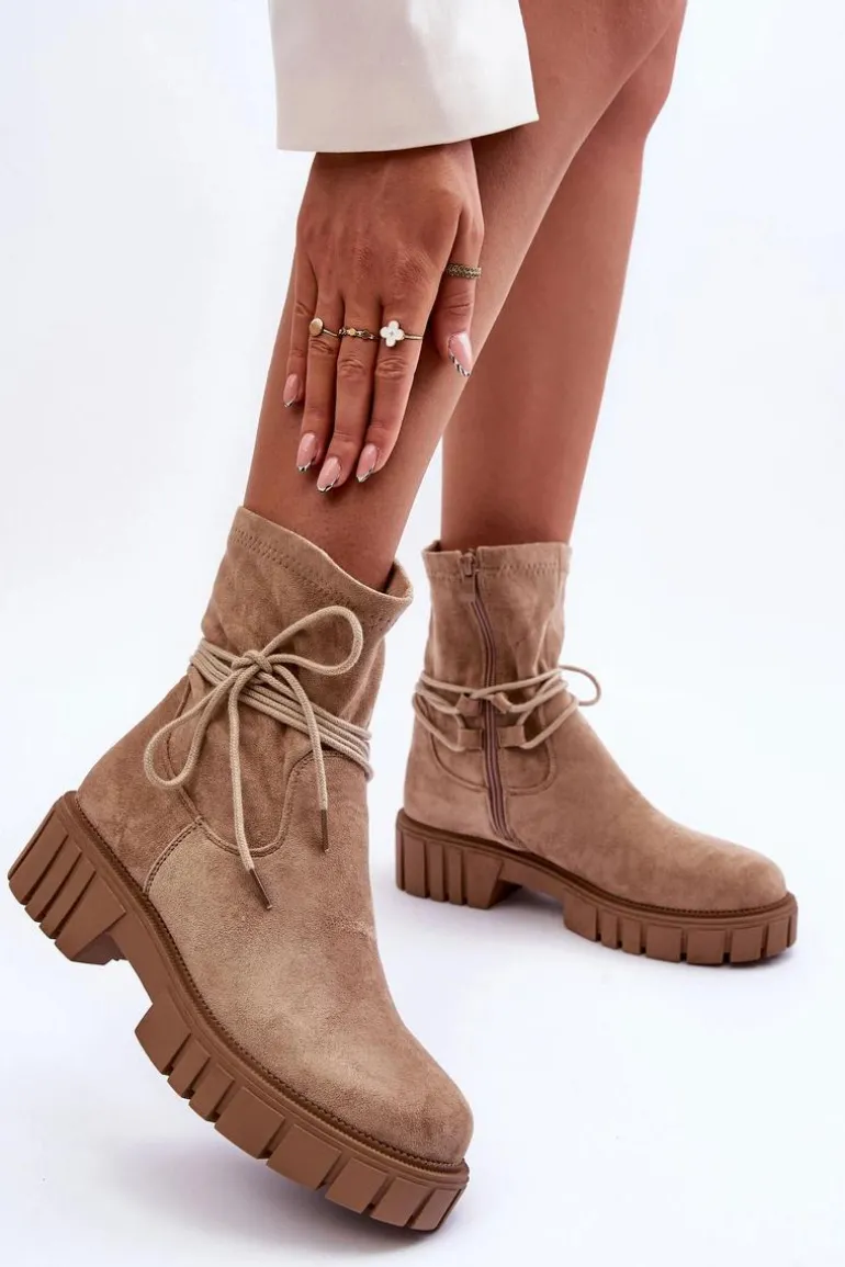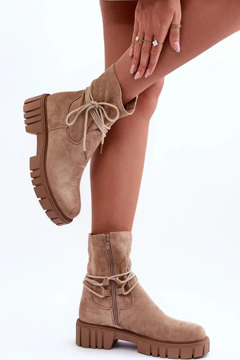 Klasyczne botki damskie zostały wykonane z miłego w dotyku eko zamszu. Zapinane są z boku cholewki na suwak. Cholewka wzbogacona została wiązaniem. Botki posiadają usztywniany zapiętek. Osadzone na platformie oraz masywnym, płaskim obcasie. Przy wyborze rozmiaru prosimy sugerować się tabelą rozmiarów.