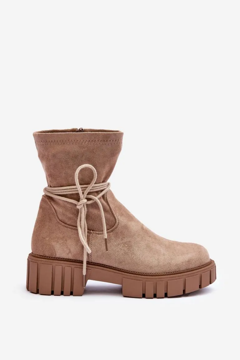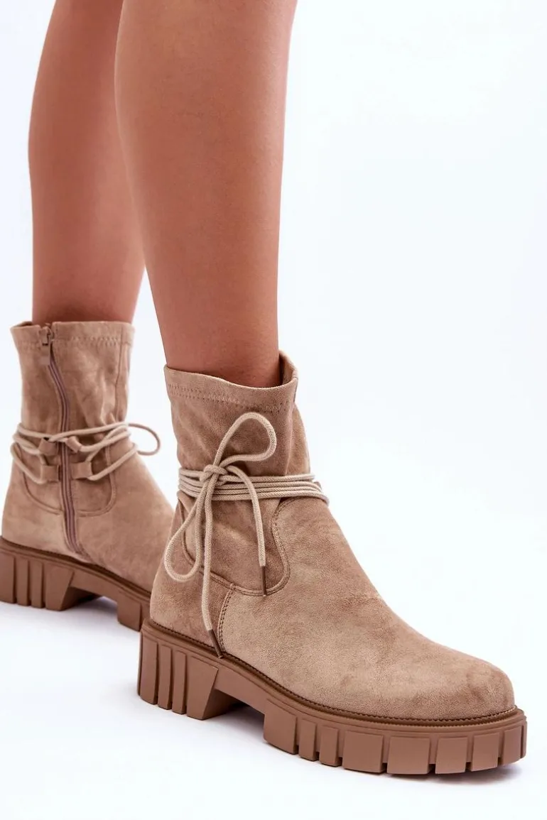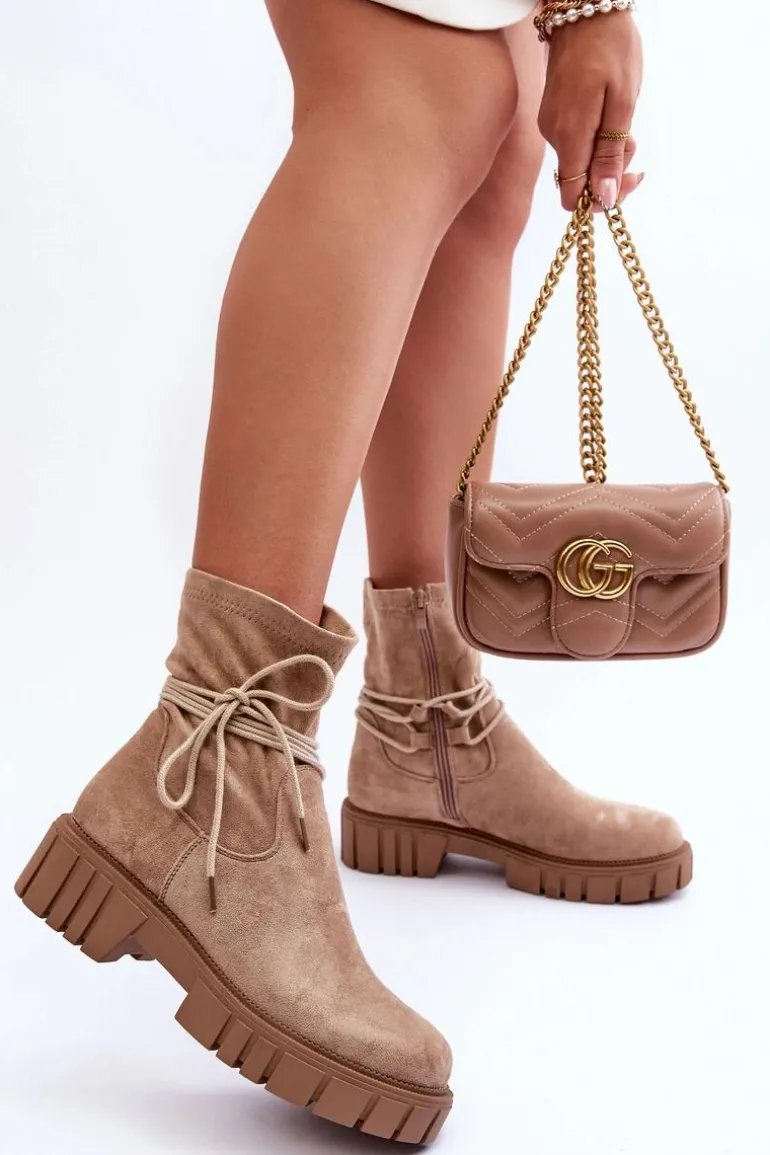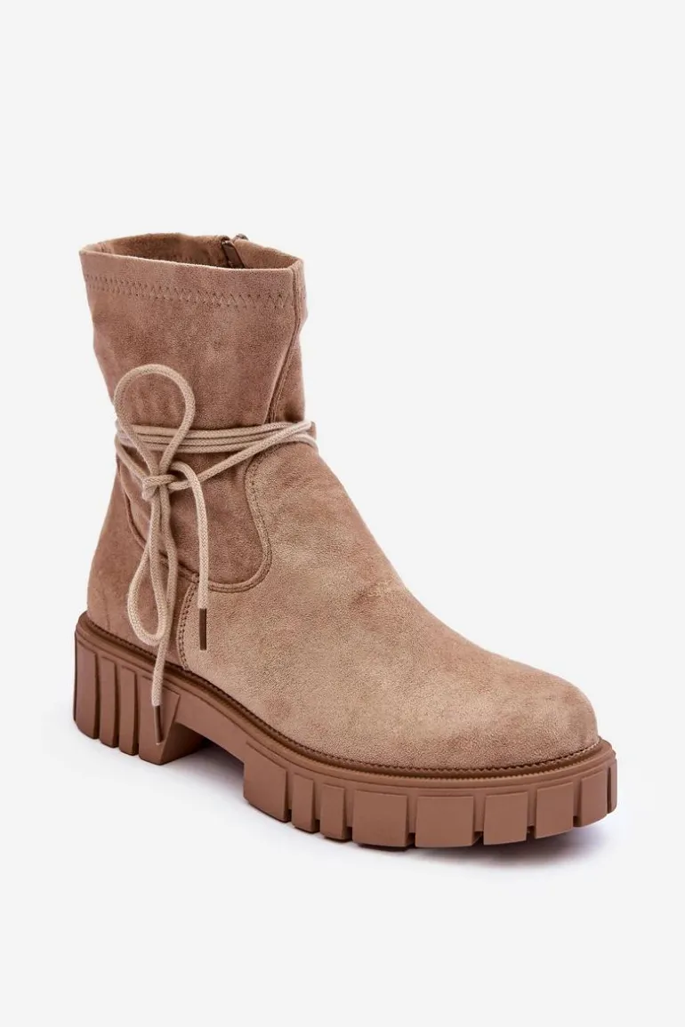 Klasyczne botki damskie zostały wykonane z miłego w dotyku eko zamszu. Zapinane są z boku cholewki na suwak. Cholewka wzbogacona została wiązaniem. Botki posiadają usztywniany zapiętek. Osadzone na platformie oraz masywnym, płaskim obcasie. Przy wyborze rozmiaru prosimy sugerować się tabelą rozmiarów.