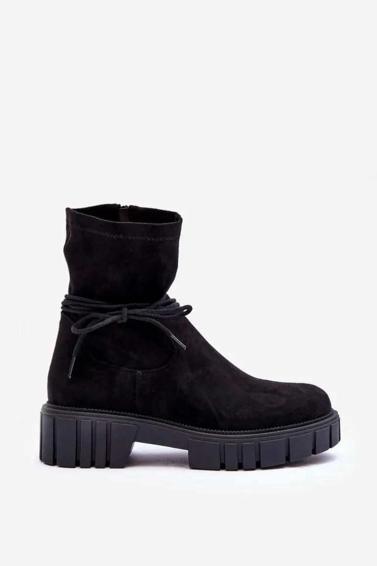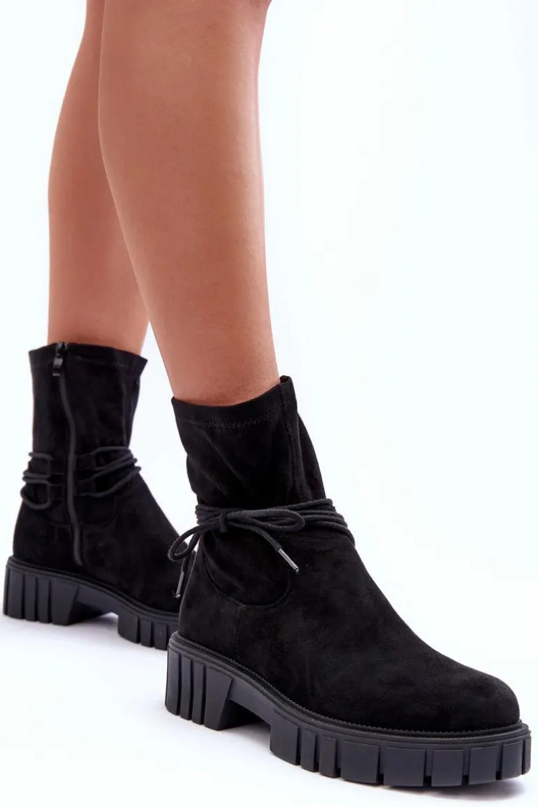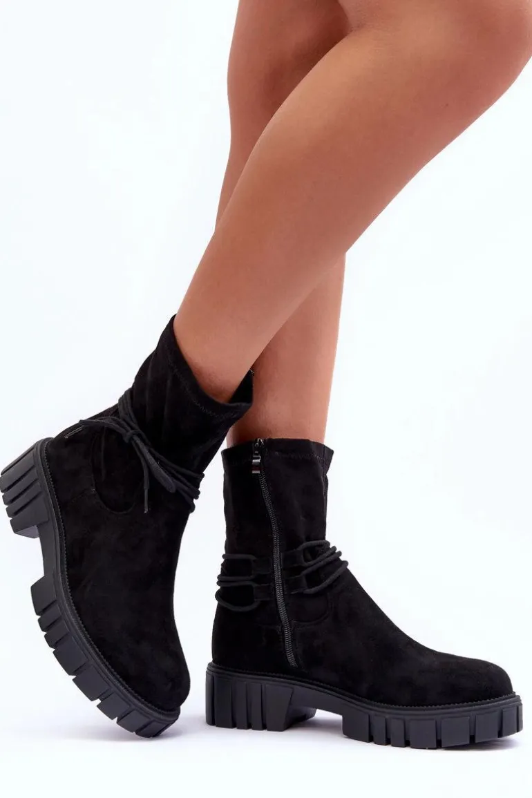 Klasyczne botki damskie zostały wykonane z miłego w dotyku eko zamszu. Zapinane są z boku cholewki na suwak. Cholewka wzbogacona została wiązaniem. Botki posiadają usztywniany zapiętek. Osadzone na platformie oraz masywnym, płaskim obcasie. Przy wyborze rozmiaru prosimy sugerować się tabelą rozmiarów.