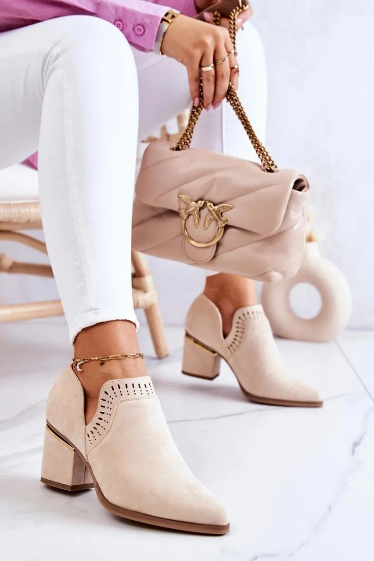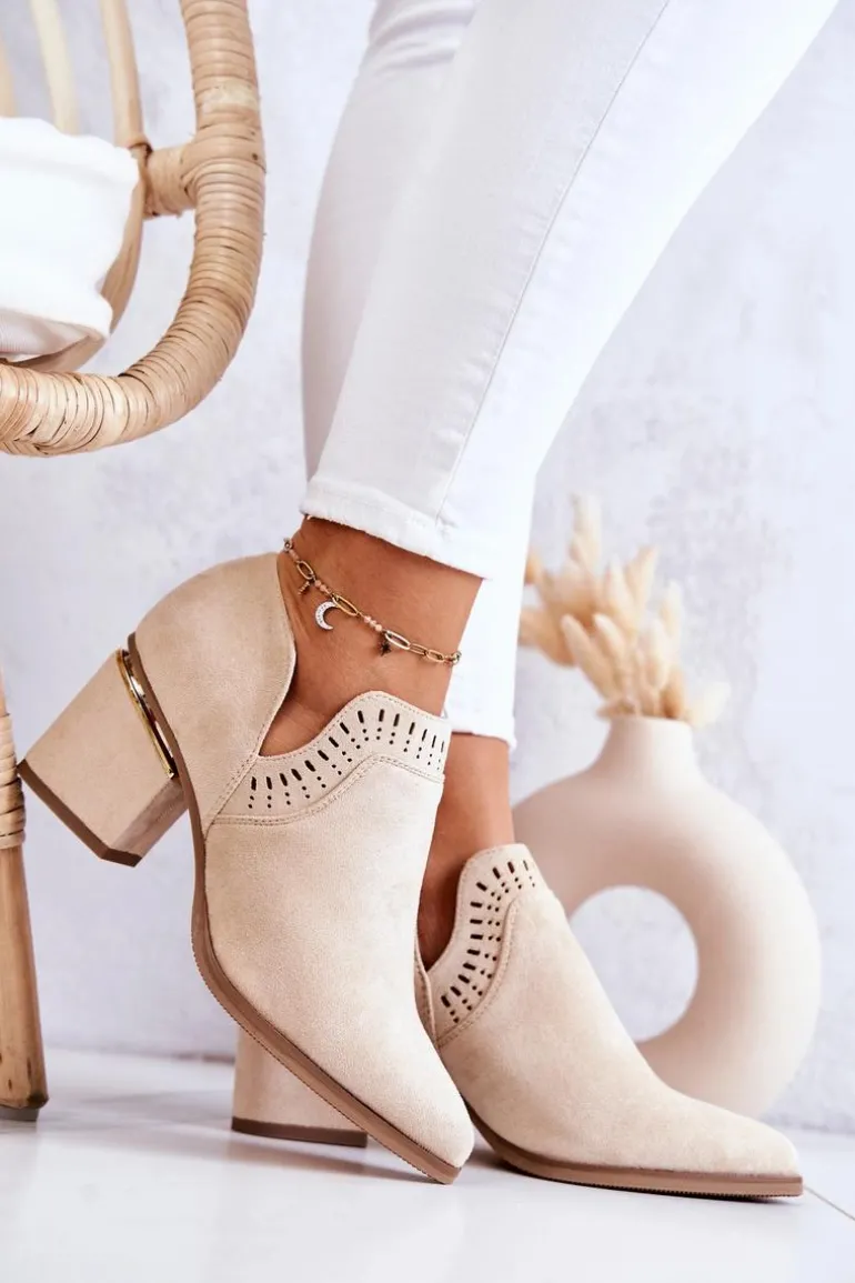 Modny fason w stylu kowbojek wykonane z eko zamszu w ażurowy wzorek. Buty posiadają nosek w szpic oraz stabilny obcas w postaci słupka. Botki idealnie wpasują się w wiosenno-letnie stylizacje. W środku posiadają eko skórzaną wkładkę. Koniecznie musisz je mieć! Przy wyborze rozmiaru prosimy sugerować się tabelą rozmiarów.