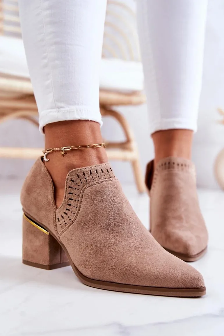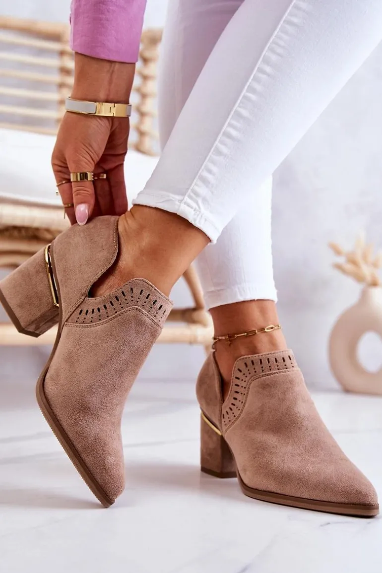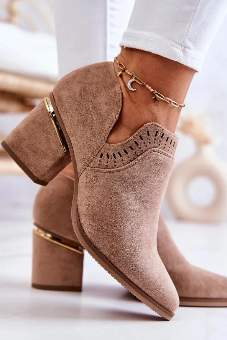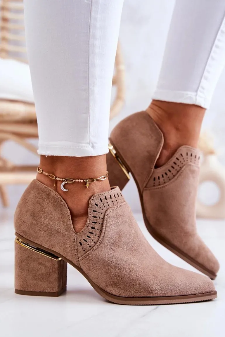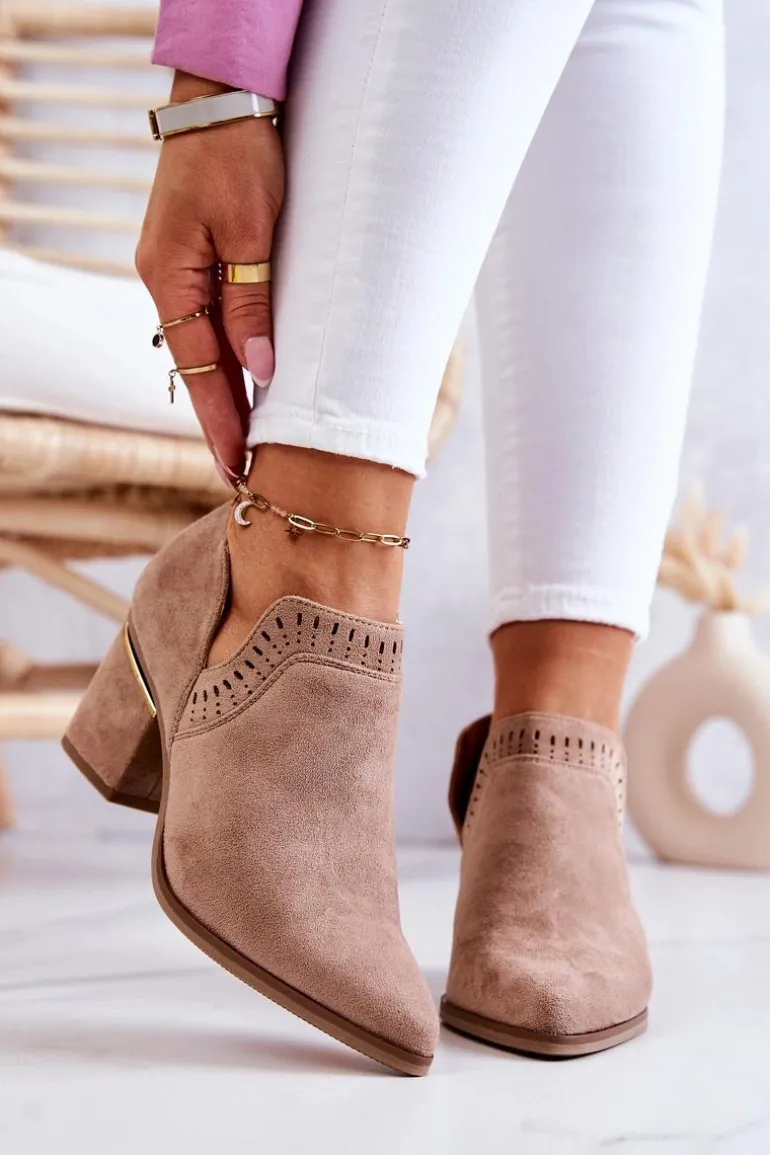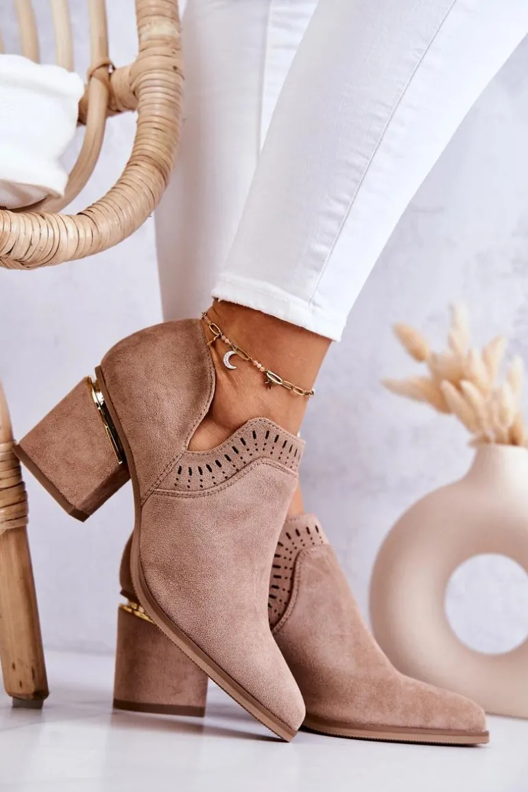 Modny fason w stylu kowbojek wykonane z eko zamszu w ażurowy wzorek. Buty posiadają nosek w szpic oraz stabilny obcas w postaci słupka. Botki idealnie wpasują się w wiosenno-letnie stylizacje. W środku posiadają eko skórzaną wkładkę. Koniecznie musisz je mieć! Przy wyborze rozmiaru prosimy sugerować się tabelą rozmiarów.