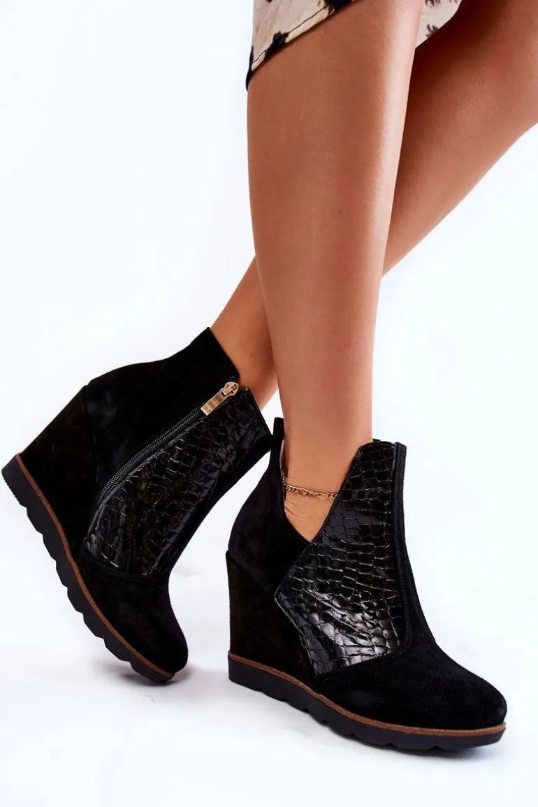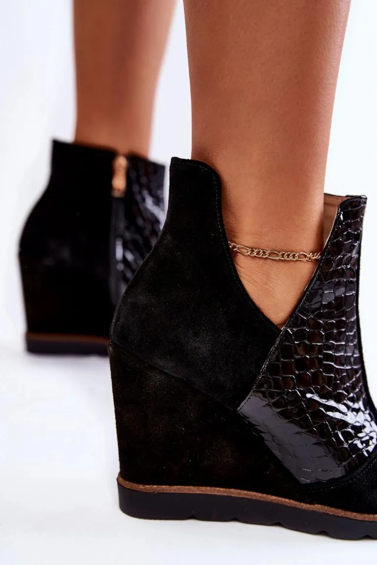 Zamszowe Botki Na Koturnie Krokodyli Wzór Czarne Alda