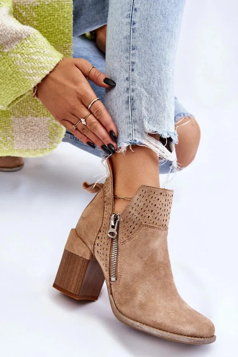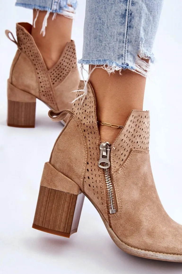 Modne botki na masywnym obcasie w postaci klocka zostały wykonane z eko zamszu z wycięciami po bokach cholewki. Dodatkowo zostały ozdobione ażurowym wzorkiem. Model ten posiada dodatkowy suwak z boku cholewki. Zapiętek w tych botkach jest usztywniany. Miękka i wygodna wkładka została wykonana z eko skóry. Powinnaś mieć ten model w swojej szafie! Przy wyborze rozmiaru prosimy sugerować się tabelą rozmiarów.
