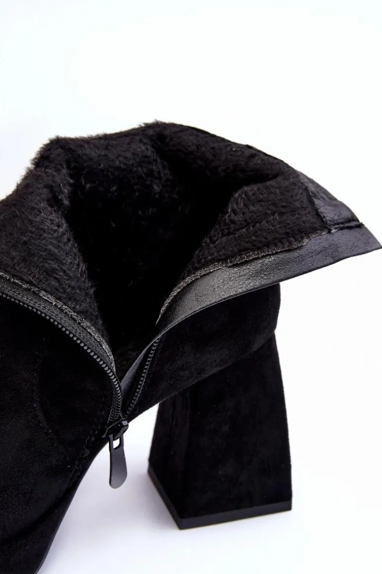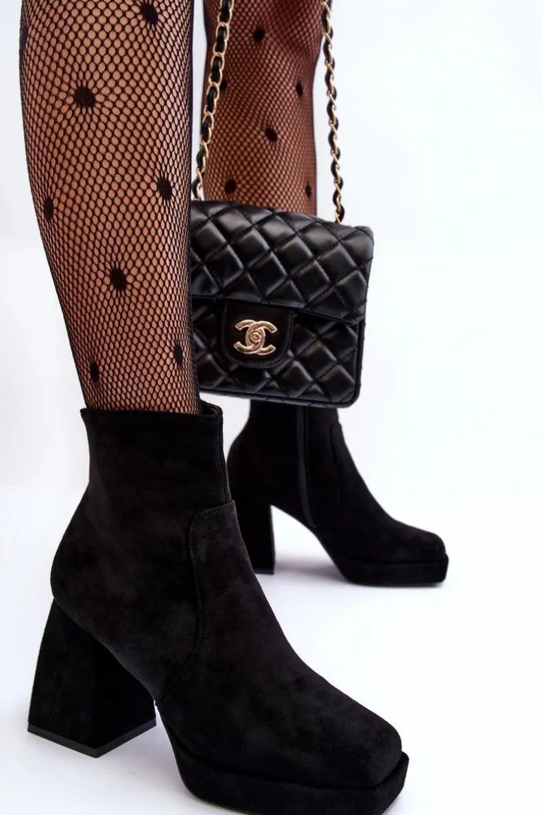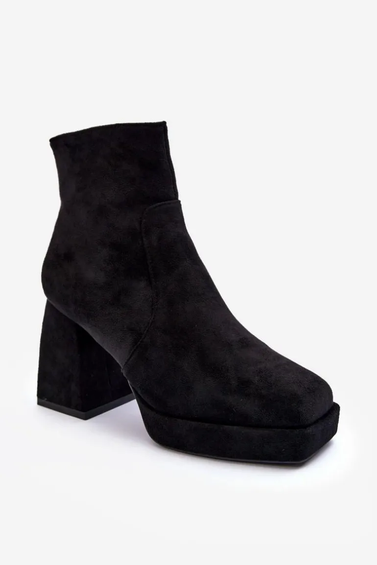 Botki Damskie osadzone na masywnym, wysokim klocku i platformie. Wykonane z eko zamszu. Zapinane na suwak po wewnętrznej stronie cholewki. Środek ocieplony kocem obuwniczym. Noski w kwadrat. Zapiętek jest usztywniony. Przy wyborze rozmiaru prosimy sugerować się tabelą rozmiarów.