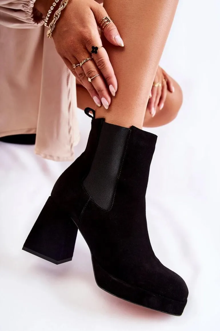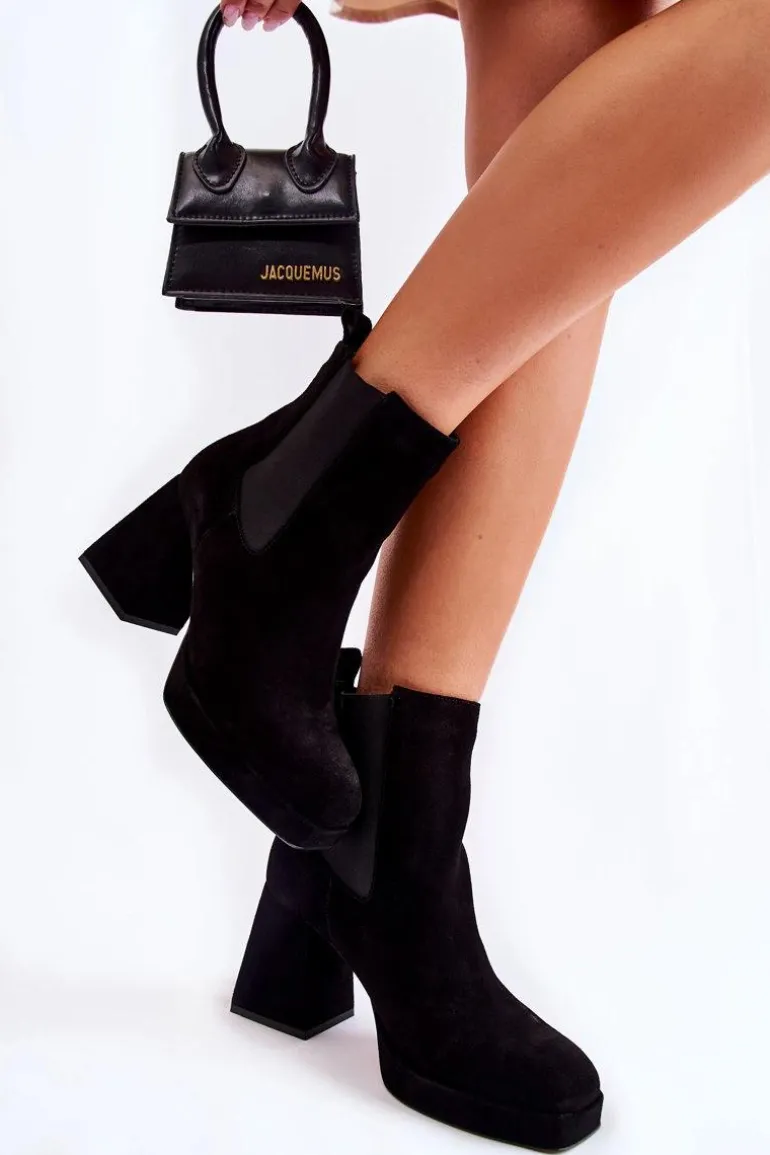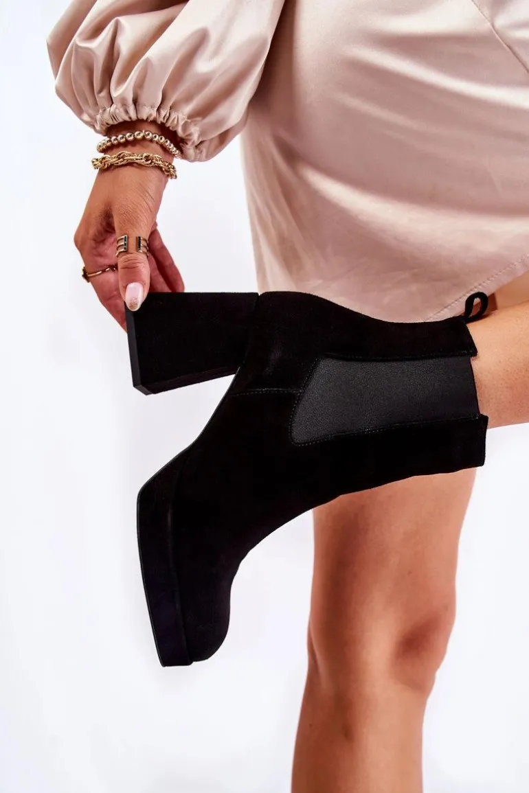 Ten cudowny model świetnie sprawdzi się podczas tworzenia stylizacji w chłodniejsze dni! Botki są wsuwane, z elastycznymi gumkami po bokach cholewki. W całości wykonane ze naturalnego zamszu. Są niezwykle komfortowe w użytkowaniu, dzięki masywnemu obcasowi w postaci klocka. Dodatkowo posiadają usztywniany zapiętek i delikatną platformę. Wnętrze ocieplone kocem obuwniczym. Przy wyborze rozmiaru prosimy sugerować się tabelą rozmiarów.