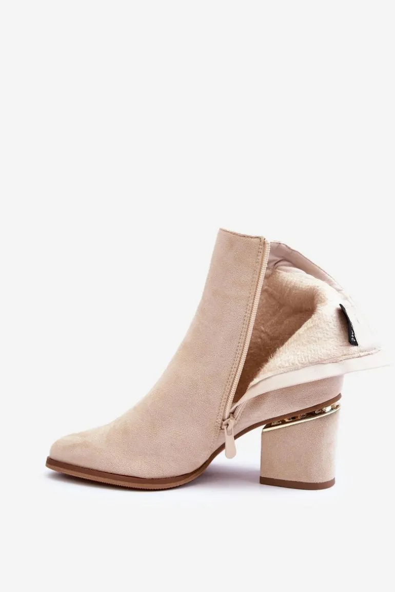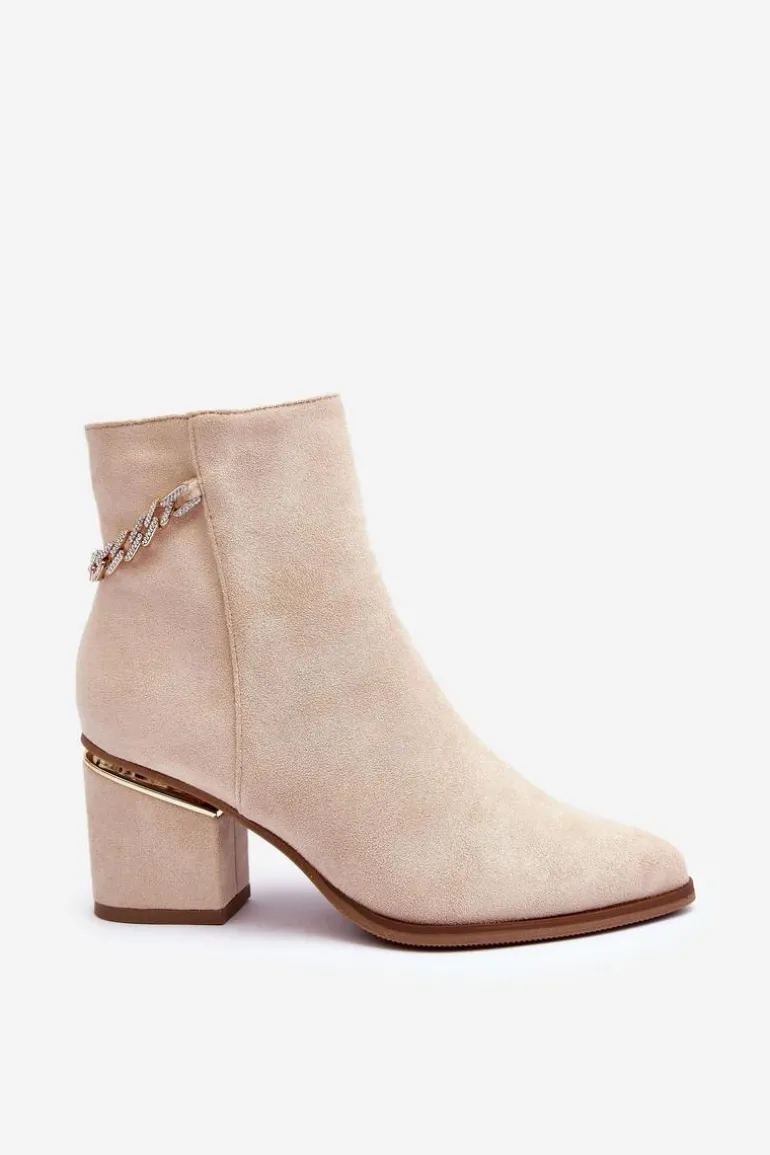 Eleganckie botki za kostkę zostały wykonane z miłego w dotyku eko zamszu. Osadzone na obcasie z lustrzanym elementem. Na cholewce biżuteryjna ozdoba. Model zapinany jest na suwak. Zapiętek usztywniony, wnętrze ocieplone kocem obuwniczym. Przy wyborze rozmiaru prosimy sugerować się tabelą rozmiarów.