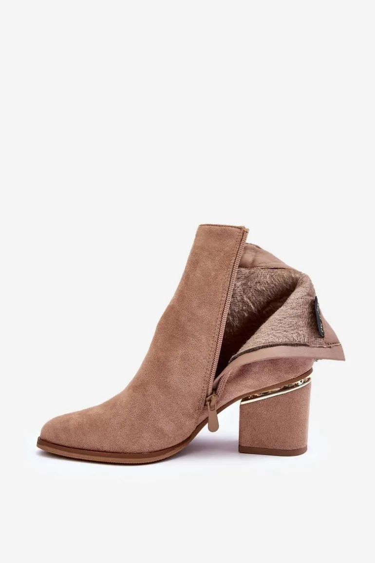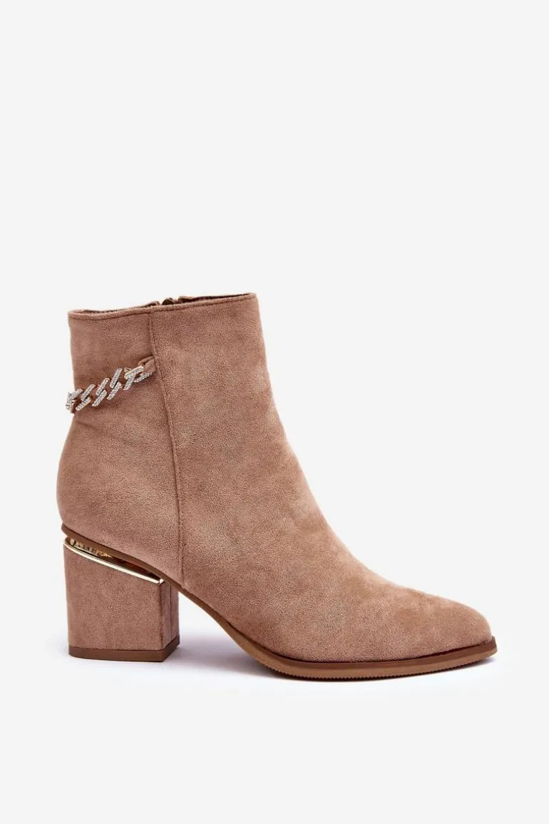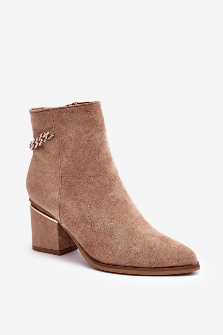 Eleganckie botki za kostkę zostały wykonane z miłego w dotyku eko zamszu. Osadzone na obcasie z lustrzanym elementem. Na cholewce biżuteryjna ozdoba. Model zapinany jest na suwak. Zapiętek usztywniony, wnętrze ocieplone kocem obuwniczym. Przy wyborze rozmiaru prosimy sugerować się tabelą rozmiarów.