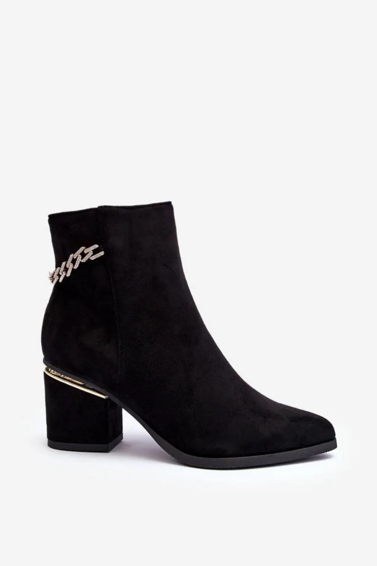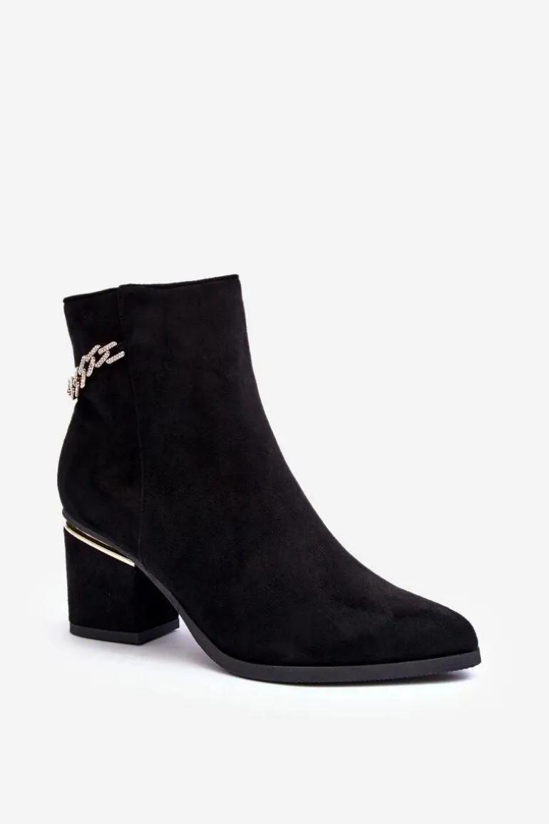 Eleganckie botki za kostkę zostały wykonane z miłego w dotyku eko zamszu. Osadzone na obcasie z lustrzanym elementem. Na cholewce biżuteryjna ozdoba. Model zapinany jest na suwak. Zapiętek usztywniony, wnętrze ocieplone kocem obuwniczym. Przy wyborze rozmiaru prosimy sugerować się tabelą rozmiarów.