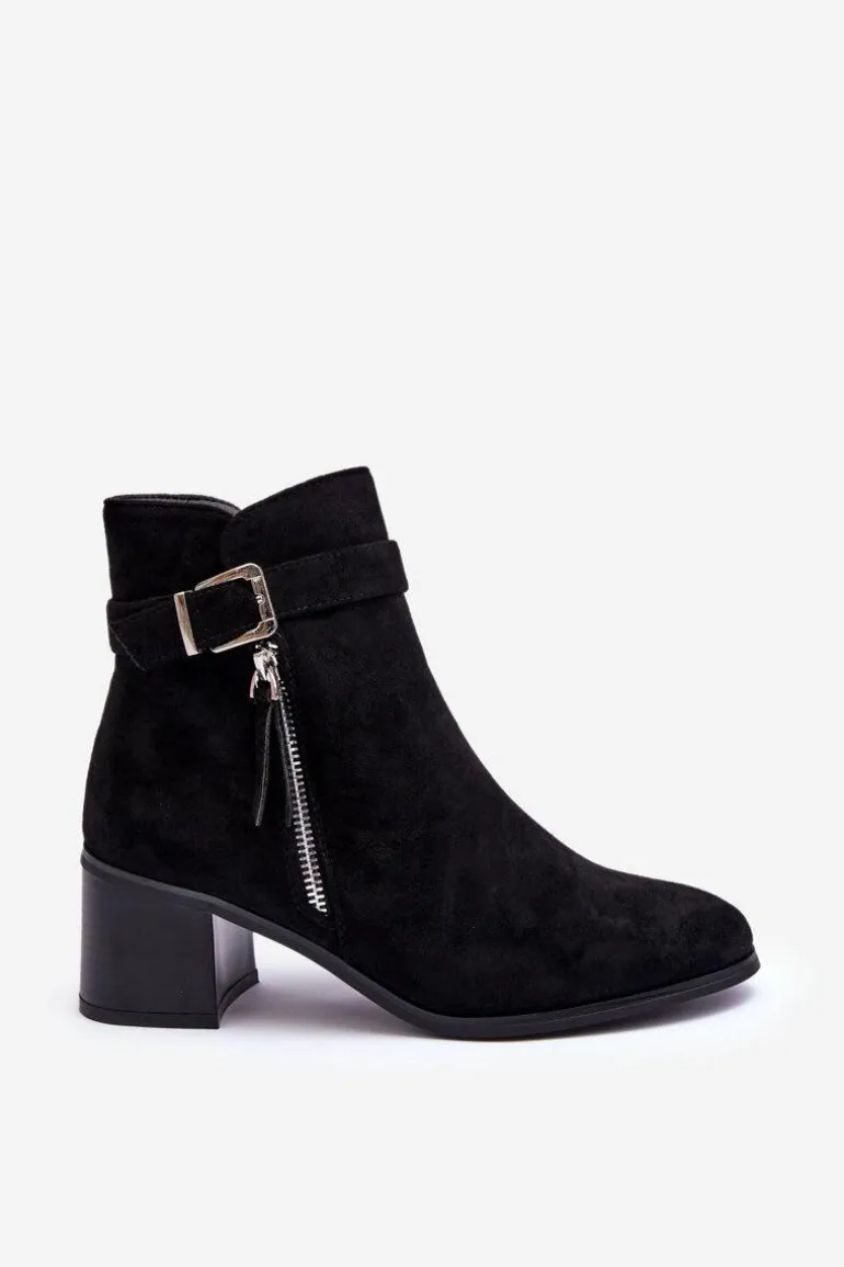 Botki damskie wykonane z miłego w dotyku eko zamszu. Zapinane na suwak. Cholewka ozdobiona cienkim paskiem z klamrą oraz dodatkowym suwakiem. Zapiętek w tym obuwiu jest usztywniony. Wnętrze ocieplone kocem obuwniczym. Idealne do wielu stylizacji! Koniecznie sprawdź także pozostałe modele botków dostępnych w naszej ofercie. Przy wyborze rozmiaru prosimy sugerować się tabelą rozmiarów.