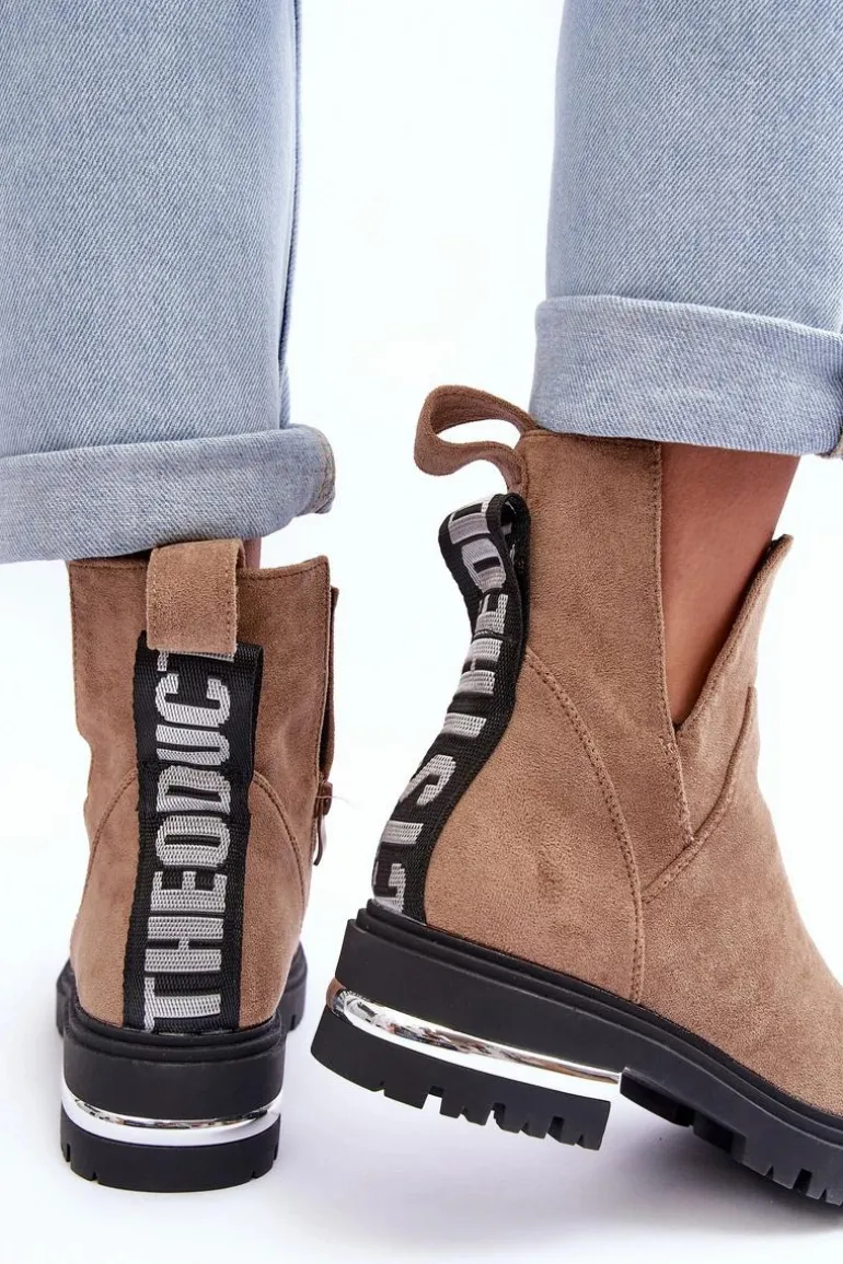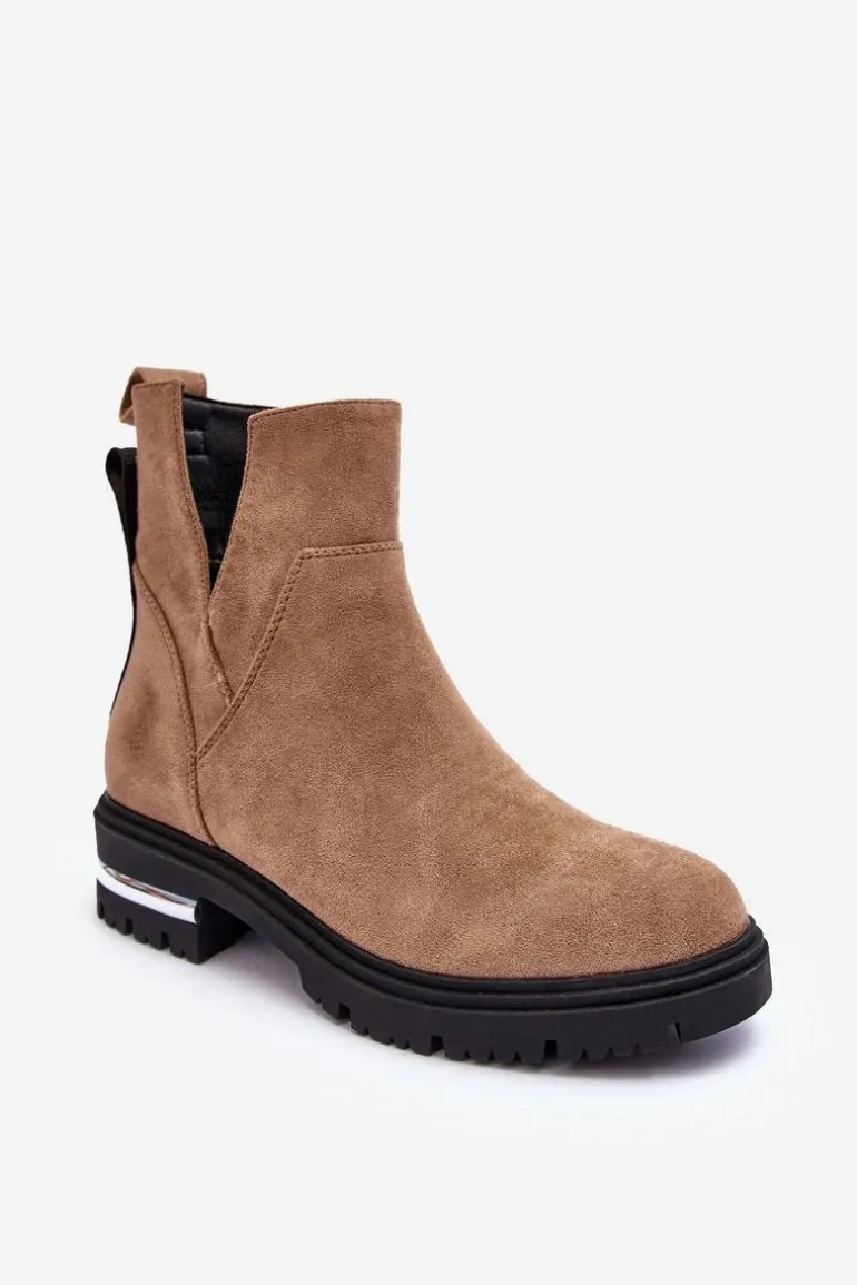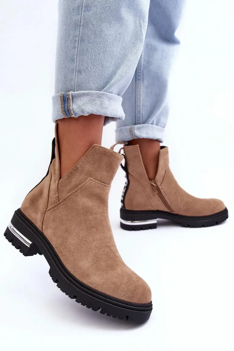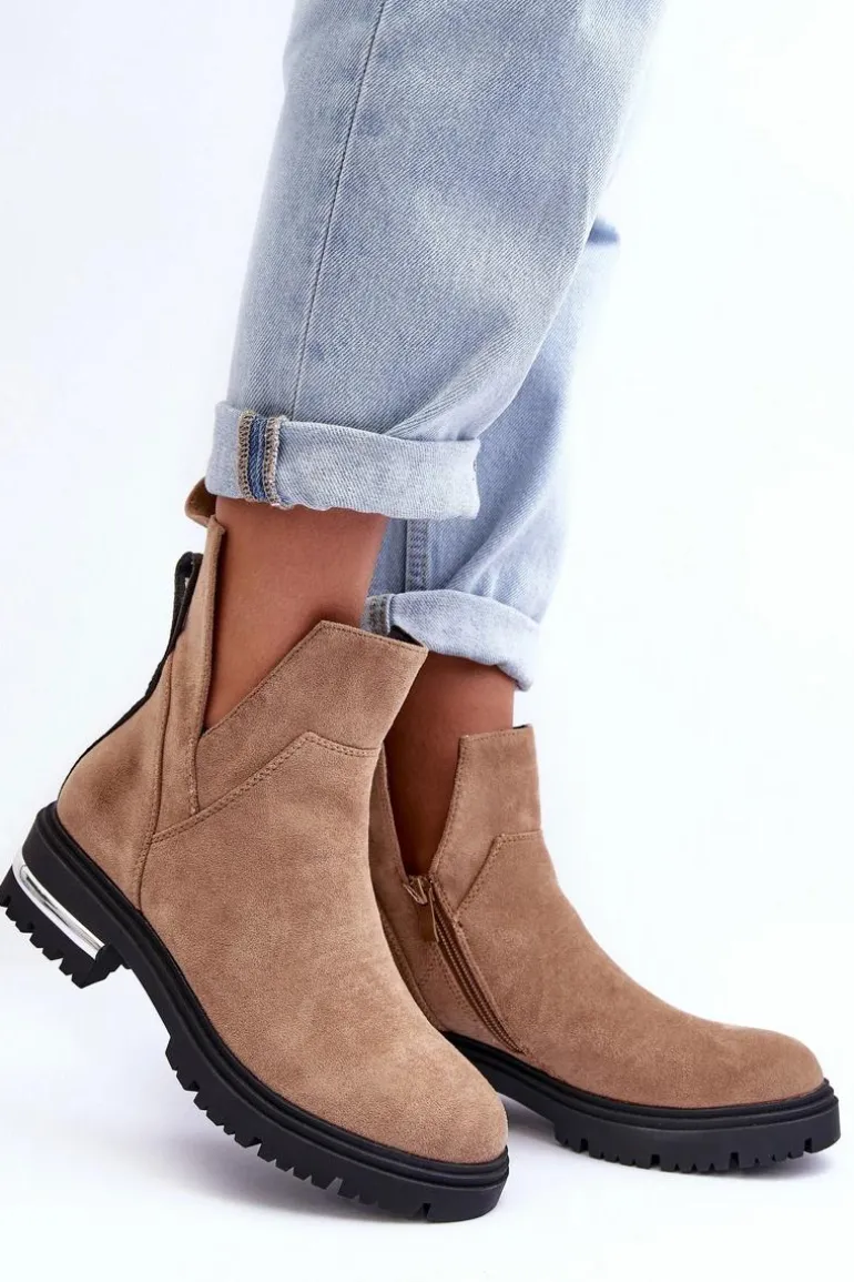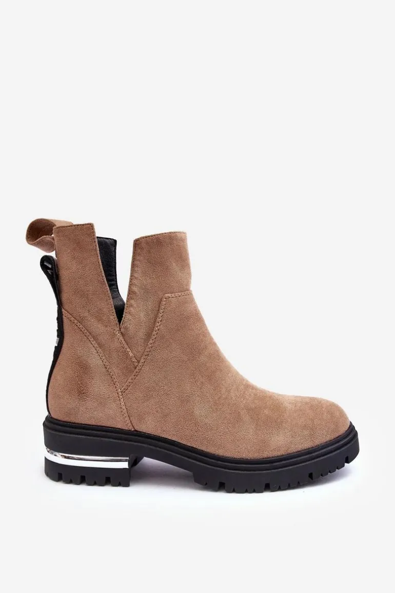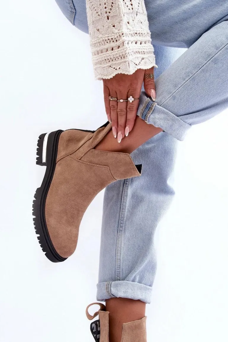Damskie botki z wycięciami. Wykonane z eko zamszu. Osadzone na obcasie z lustrzanym elementem. Zapinane na suwak. Środek ocieplony kocem obuwniczym. Z tyłu cholewki znajduje się napis. Nie czekaj aż znikną i kup już dziś! Przy wyborze rozmiaru prosimy sugerować się tabelą rozmiarów.