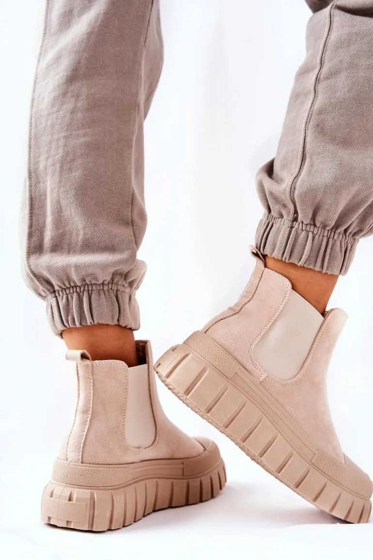 Botki zostały wykonane z eko zamszu. Gumy ściągające na wysokości cholewki zapewnią dopasowanie do nogi oraz wygodę. Wysoka platforma sprawia, że buty są komfortowe w noszeniu. Środek jest ocieplony delikatnym, przyjemnym w dotyku futerkiem. Botki posiadają wzmocnienie na przodzie w postaci gumy. Przy wyborze rozmiaru prosimy sugerować się tabelą rozmiarów.