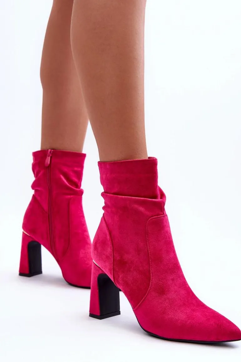 Eleganckie botki zostały wykonane z miłego w dotyku eko zamszu. Cholewka jest marszczona i zapinana na suwak. Model ten osadzony jest na obcasie w postaci słupka. Noski w szpic. Dodatkowo buty posiadają usztywniany zapiętek Przy wyborze rozmiaru prosimy sugerować się tabelą rozmiarów.