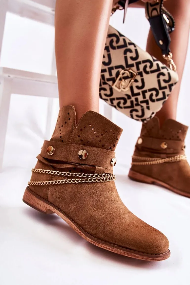 Botki na ukrytym koturnie i płaskim obcasie posiadają cholewką za kostkę, która jest delikatnie perforowana. Model wsuwany, wykonany z eko zamszu. Miękka wkładka z eko skóry pozwala na wygodne użytkowanie. Zapiętek usztywniany. Idealne na sezon wiosenno-jesienny. Botki posiadają osobno ściągane paseczki i łańcuszek, dlatego możesz je nosić razem z ozdobami lub bez. Przy wyborze rozmiaru prosimy sugerować się tabelą rozmiarów.