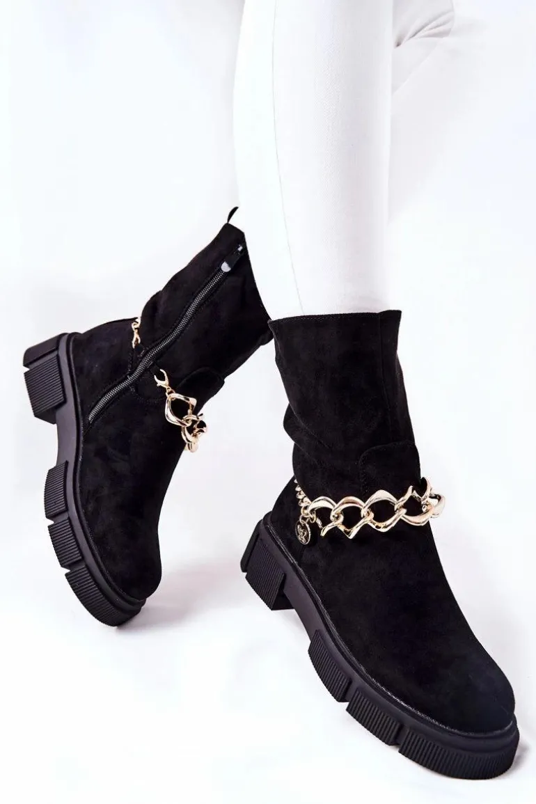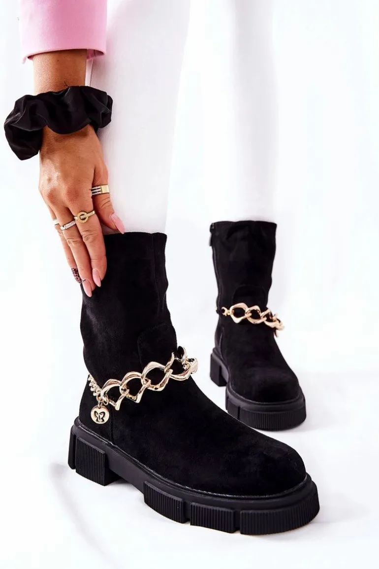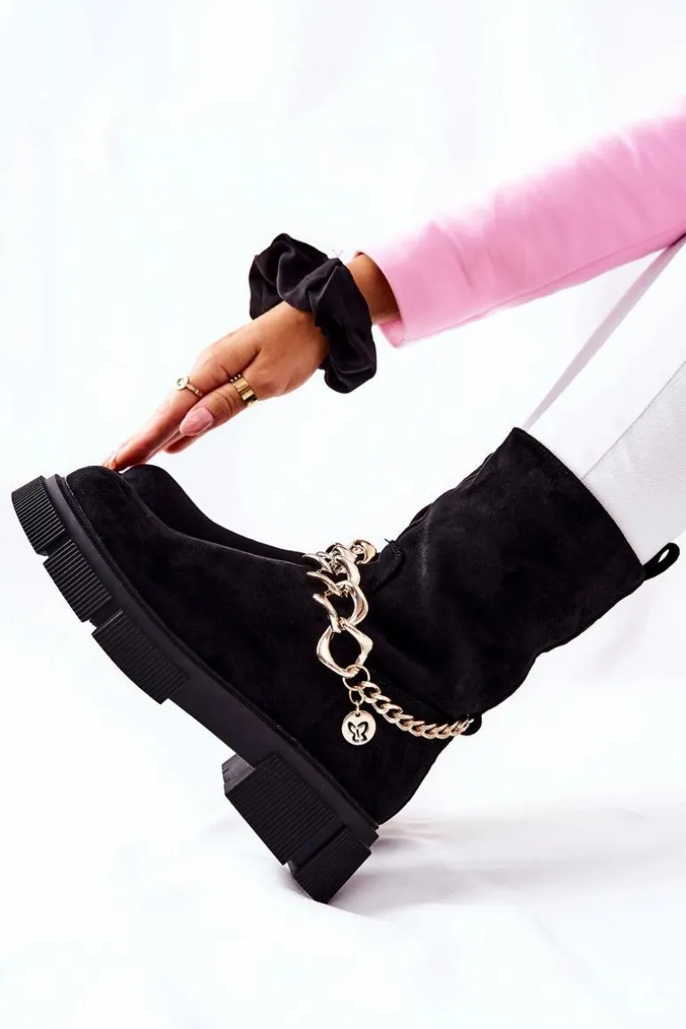 Piękne botki wykonane z eko zamszu będą idealne do wielu stylizacji. Gruba podeszwa sprawia, że botki są stabilne. Ozdobny łańcuch sprawia, że wyglądają bardzo stylowo. Zapinane na suwak. Środek ocieplany delikatnym futerkiem. Nie przegap okazji i kup je już dziś!Przy wyborze rozmiaru prosimy sugerować się tabelą rozmiarów.