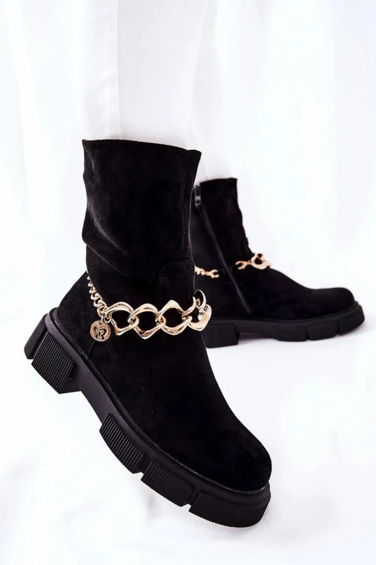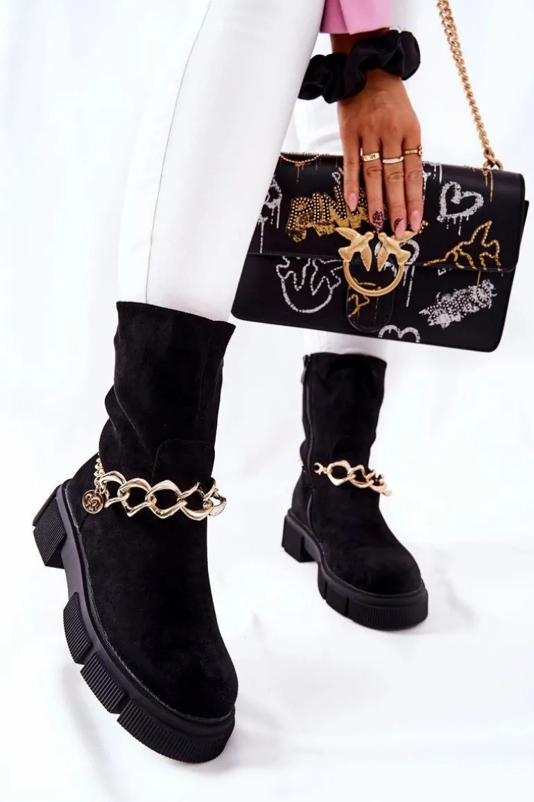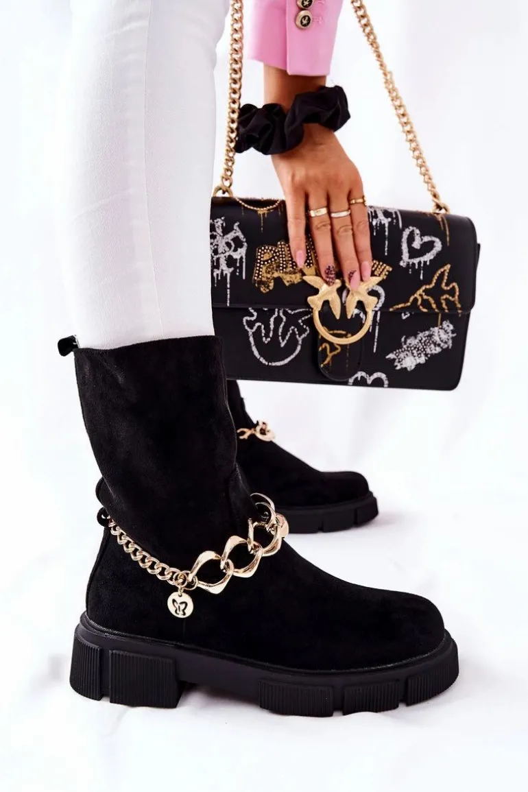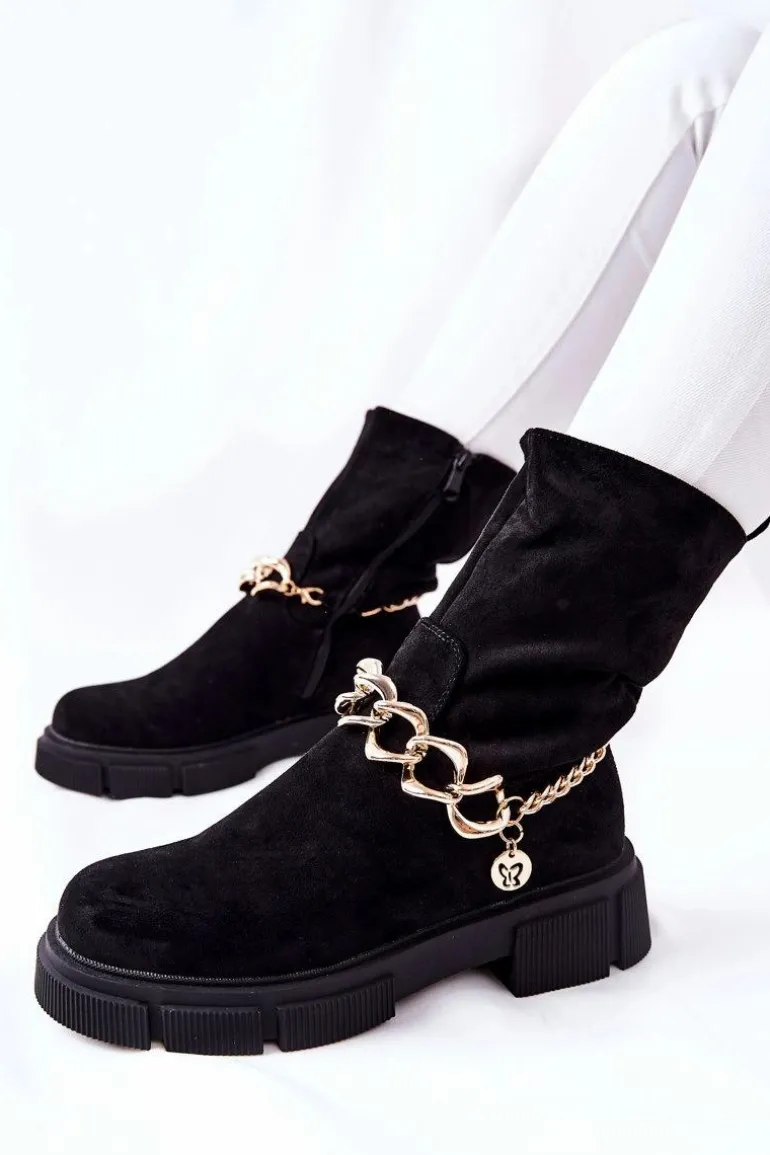 Piękne botki wykonane z eko zamszu będą idealne do wielu stylizacji. Gruba podeszwa sprawia, że botki są stabilne. Ozdobny łańcuch sprawia, że wyglądają bardzo stylowo. Zapinane na suwak. Środek ocieplany delikatnym futerkiem. Nie przegap okazji i kup je już dziś!Przy wyborze rozmiaru prosimy sugerować się tabelą rozmiarów.