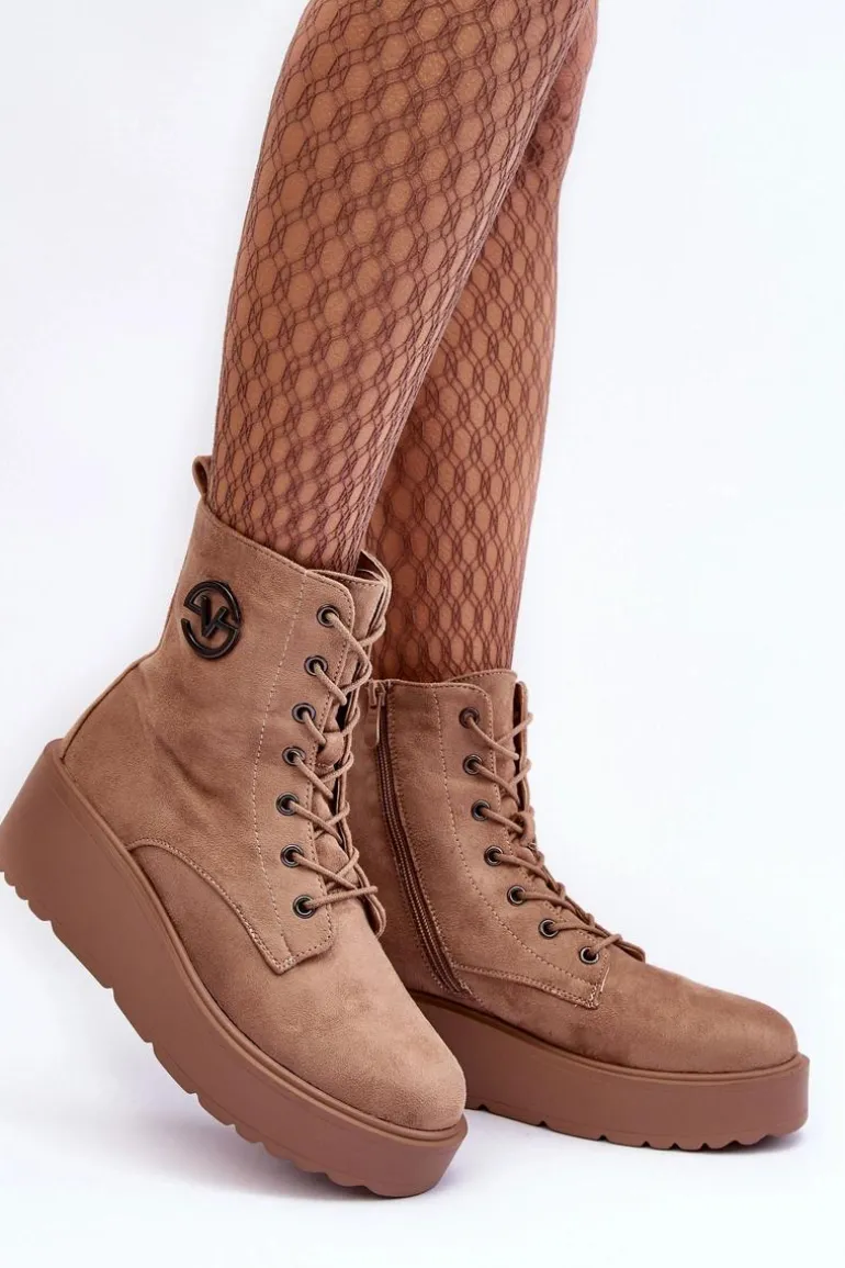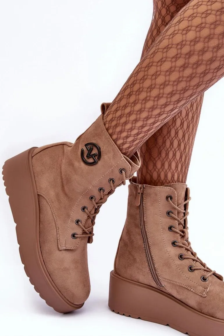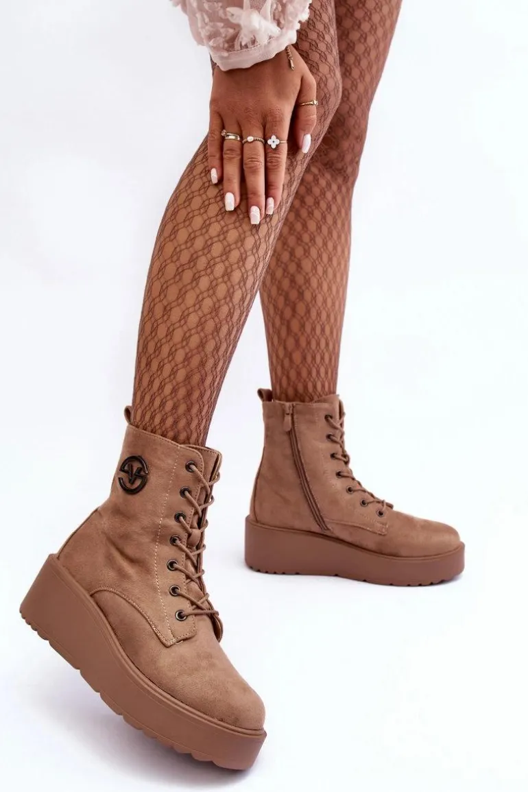 Botki wykonane z eko zamszu. Osadzone na platformie i koturnie. Model zapinany na suwak z boku oraz dodatkowo posiada sznurowanie. Środek ocieplony kocem obuwniczym. Noski zaokrąglone, zapiętek usztywniony. Cholewka z boku posiada ozdobny element. Model ten na pewno sprawdzi się w wielu stylizacjach! Przy wyborze rozmiaru prosimy kierować się tabelą rozmiarów