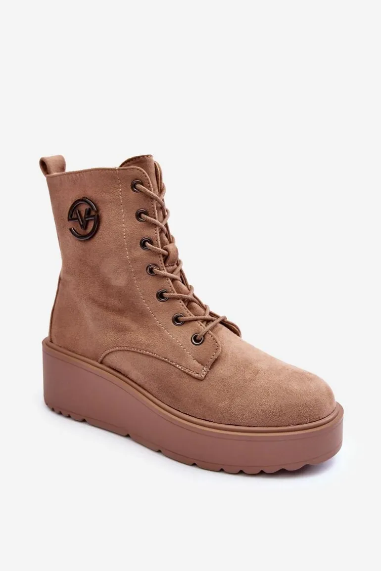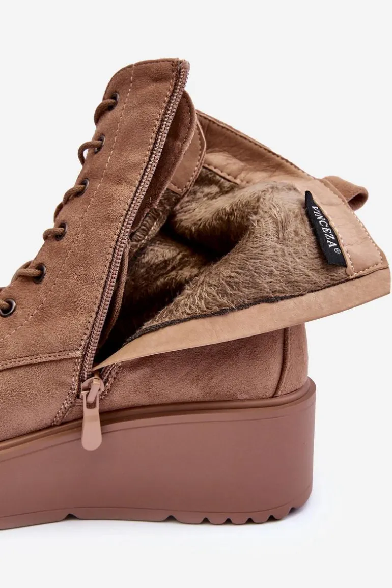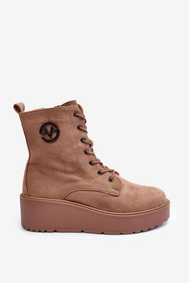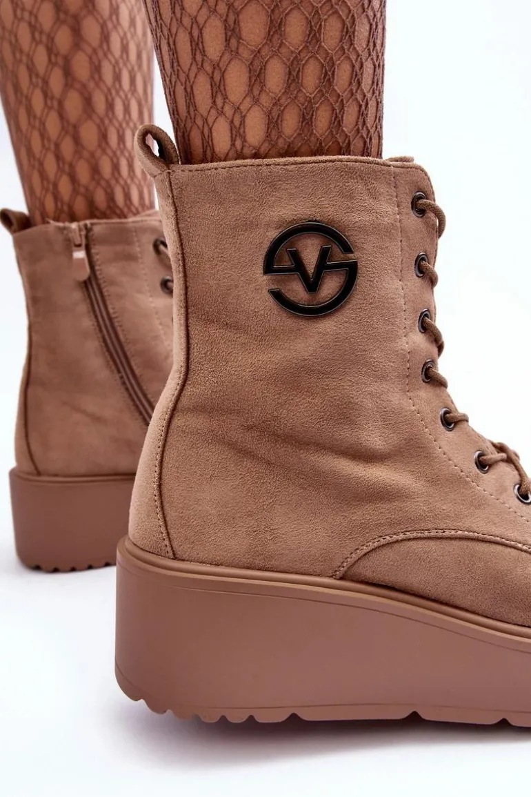 Botki wykonane z eko zamszu. Osadzone na platformie i koturnie. Model zapinany na suwak z boku oraz dodatkowo posiada sznurowanie. Środek ocieplony kocem obuwniczym. Noski zaokrąglone, zapiętek usztywniony. Cholewka z boku posiada ozdobny element. Model ten na pewno sprawdzi się w wielu stylizacjach! Przy wyborze rozmiaru prosimy kierować się tabelą rozmiarów