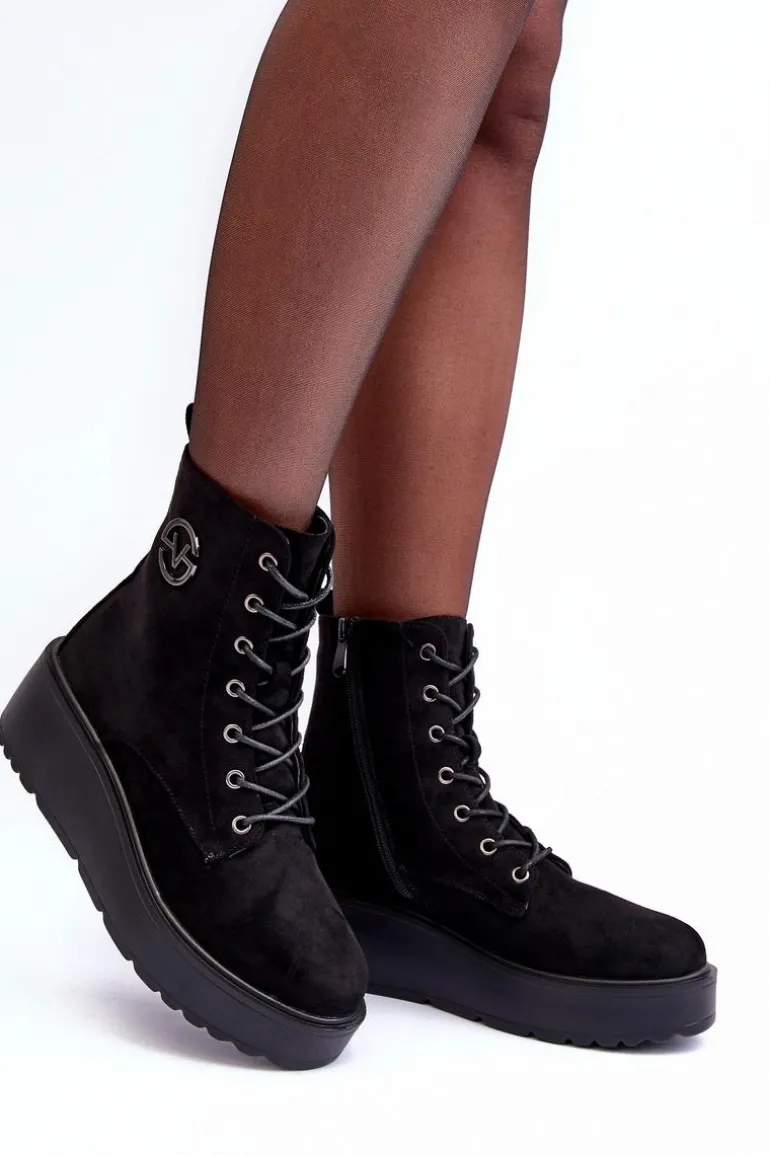 Botki wykonane z eko zamszu. Osadzone na platformie i koturnie. Model zapinany na suwak z boku oraz dodatkowo posiada sznurowanie. Środek ocieplony kocem obuwniczym. Noski zaokrąglone, zapiętek usztywniony. Cholewka z boku posiada ozdobny element. Model ten na pewno sprawdzi się w wielu stylizacjach! Przy wyborze rozmiaru prosimy kierować się tabelą rozmiarów