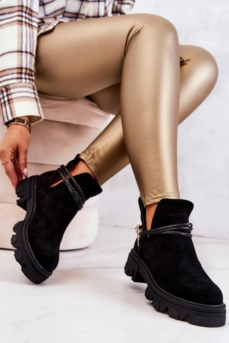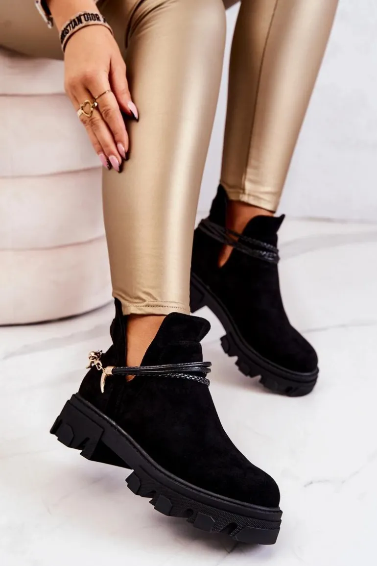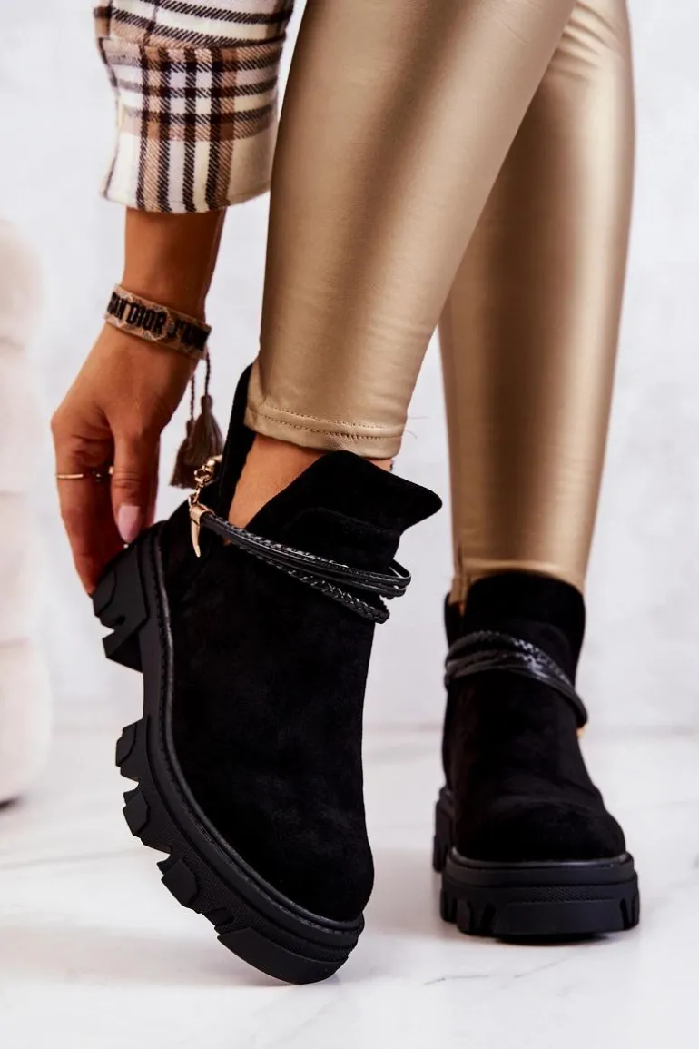 Botki z wycięciami wykonane z eko zamszu. Posiadają masywną podeszwę chroniącą przed zimnym podłożem. Plecione, dekoracyjne paski posiadają dodatkowo zawieszkę w postaci gwiazdy z cyrkoniami. Można je odpiąć. Wycięcia na kostkę sprawiają, że te botki wyglądają bardzo efektownie. Przy wyborze rozmiaru prosimy sugerować się tabelą rozmiarów.