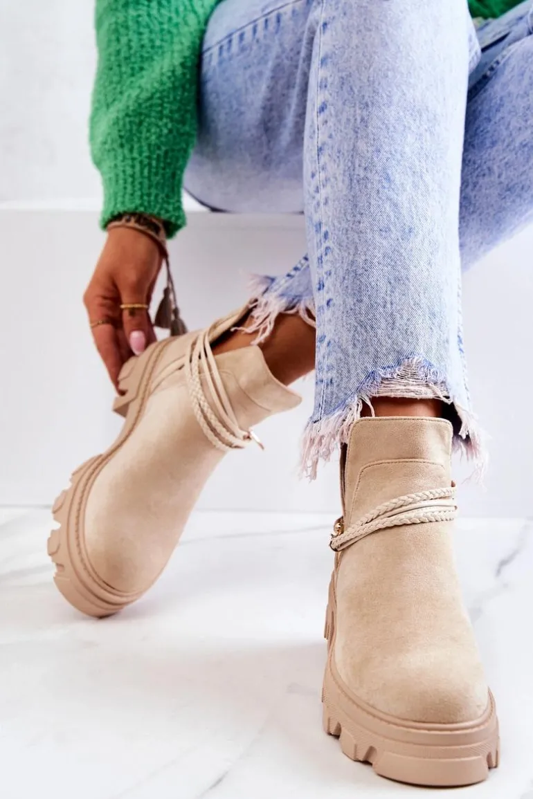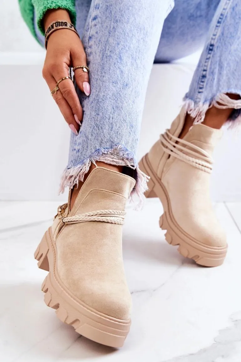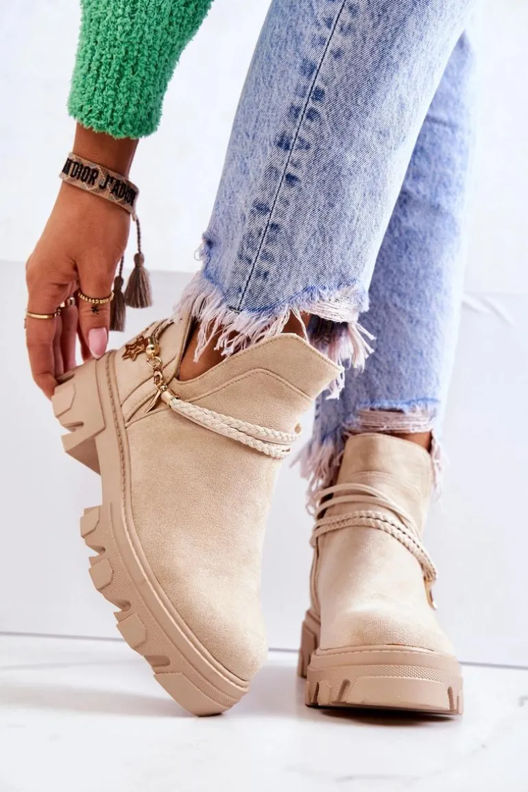 Botki z wycięciami wykonane z eko zamszu. Posiadają masywną podeszwę chroniącą przed zimnym podłożem. Plecione, dekoracyjne paski posiadają dodatkowo zawieszkę w postaci gwiazdy z cyrkoniami. Można je odpiąć. Wycięcia na kostkę sprawiają, że te botki wyglądają bardzo efektownie. Przy wyborze rozmiaru prosimy sugerować się tabelą rozmiarów.
