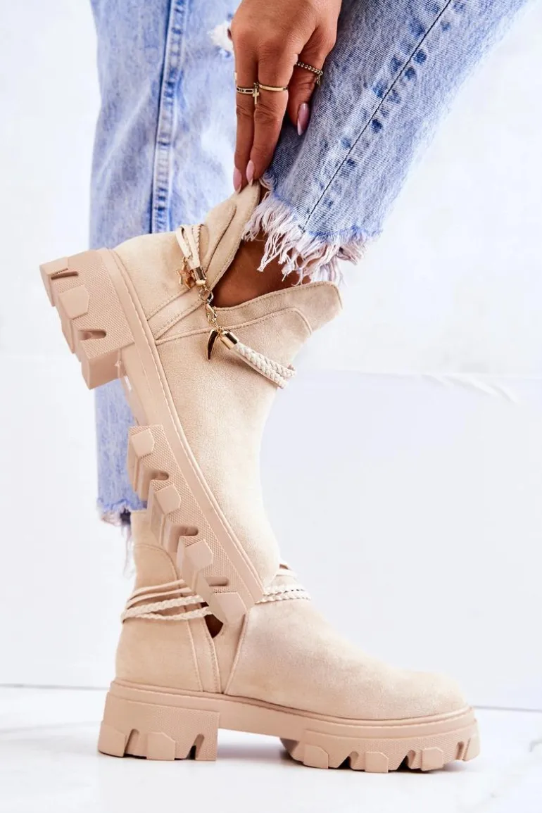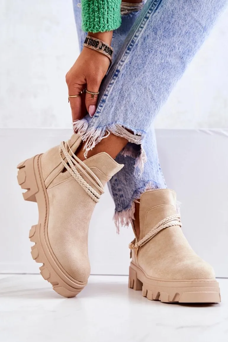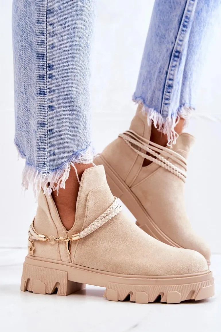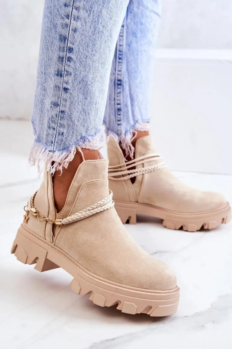 Botki z wycięciami wykonane z eko zamszu. Posiadają masywną podeszwę chroniącą przed zimnym podłożem. Plecione, dekoracyjne paski posiadają dodatkowo zawieszkę w postaci gwiazdy z cyrkoniami. Można je odpiąć. Wycięcia na kostkę sprawiają, że te botki wyglądają bardzo efektownie. Przy wyborze rozmiaru prosimy sugerować się tabelą rozmiarów.