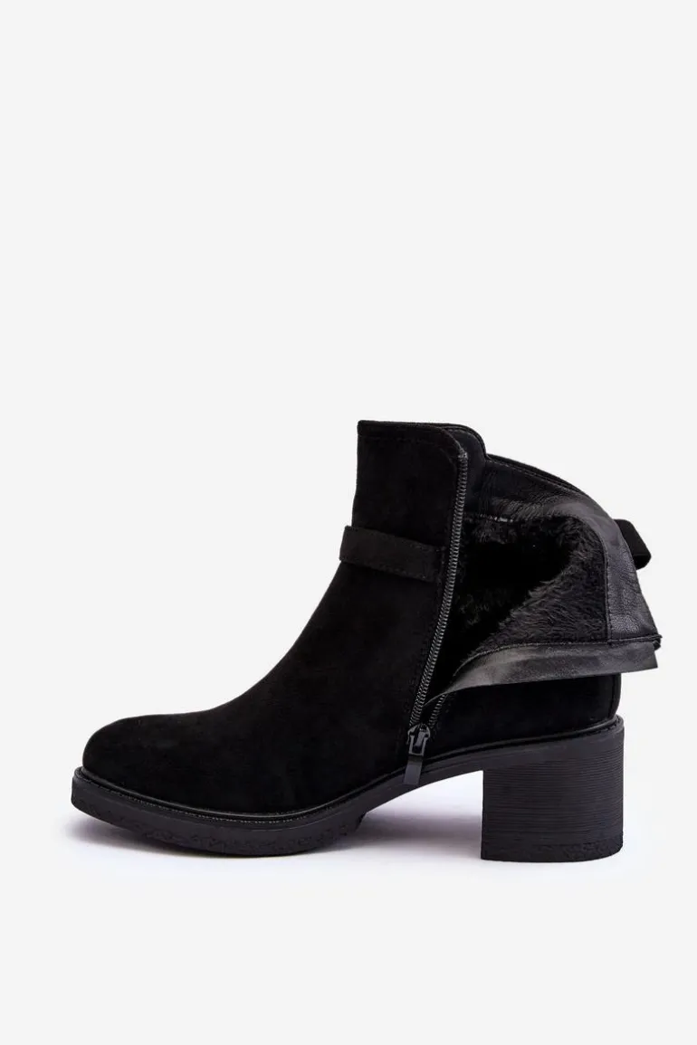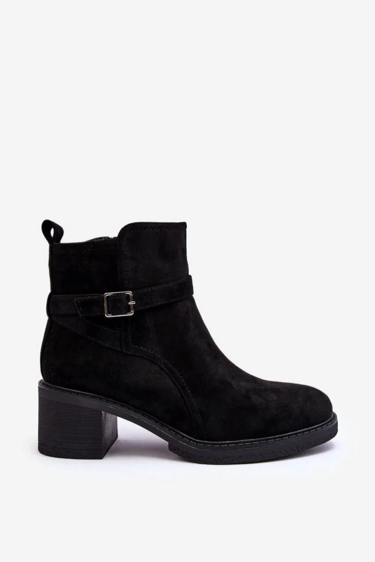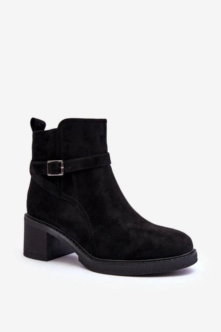 Klasyczne botki wykonane z eko zamszu. Osadzone na obcasie w postaci klocka. Wnętrze ocieplone kocem obuwniczym. Z boku cholewki znajduje się pasek z klamrą. Modny fason sprawia, że możesz założyć je do wielu stylizacji. Nosek zaokrąglony. Buty posiadają także usztywniany zapiętek. W tych botkach jesienne dni nie będą już takie straszne! Przy wyborze rozmiaru prosimy sugerować się tabelą rozmiarów.