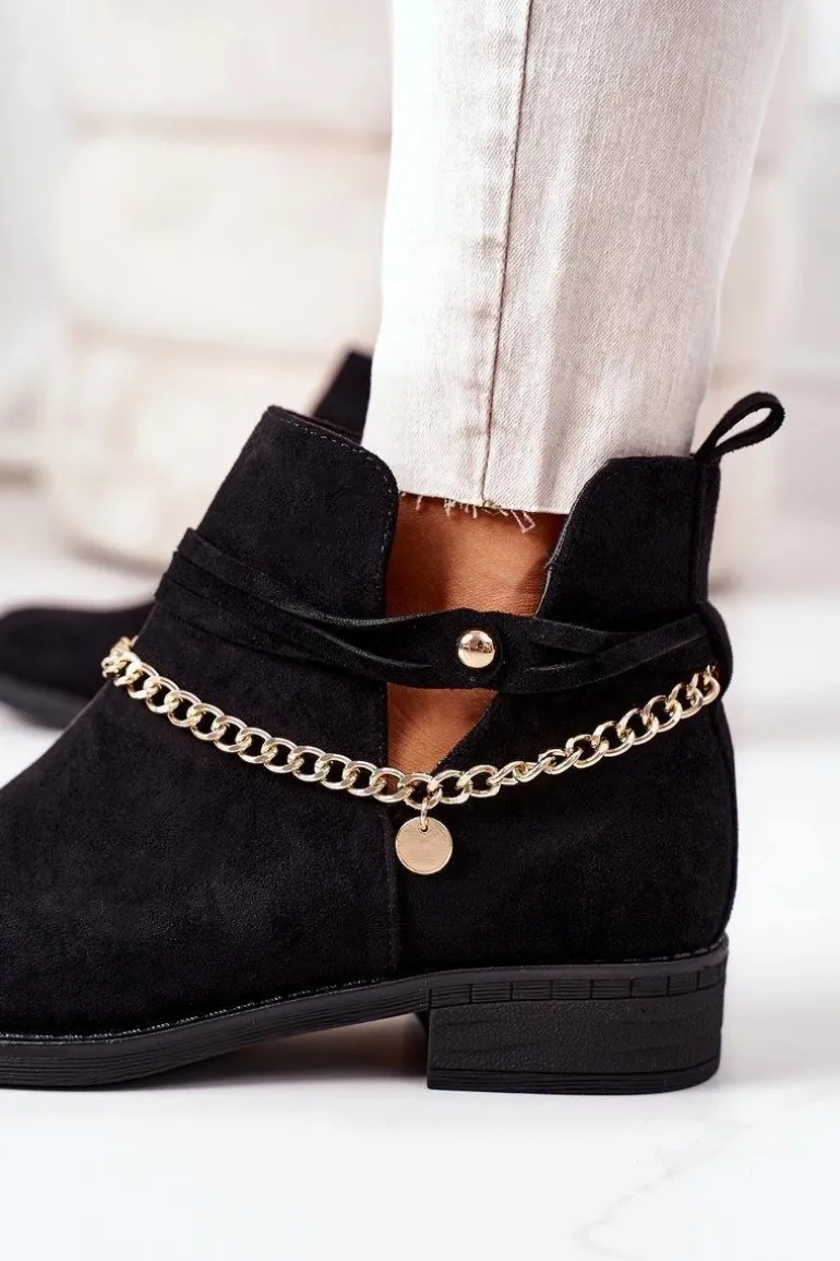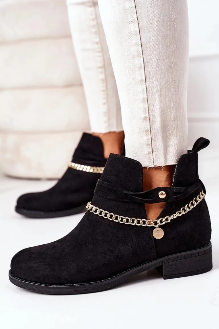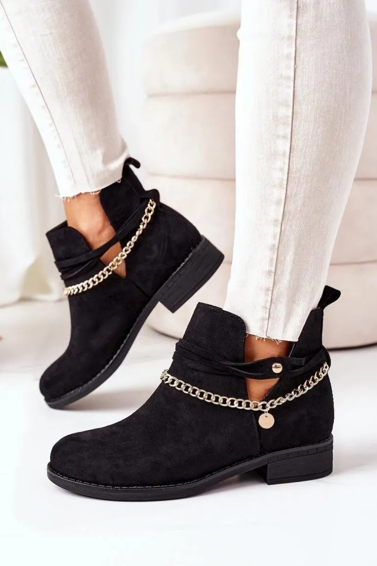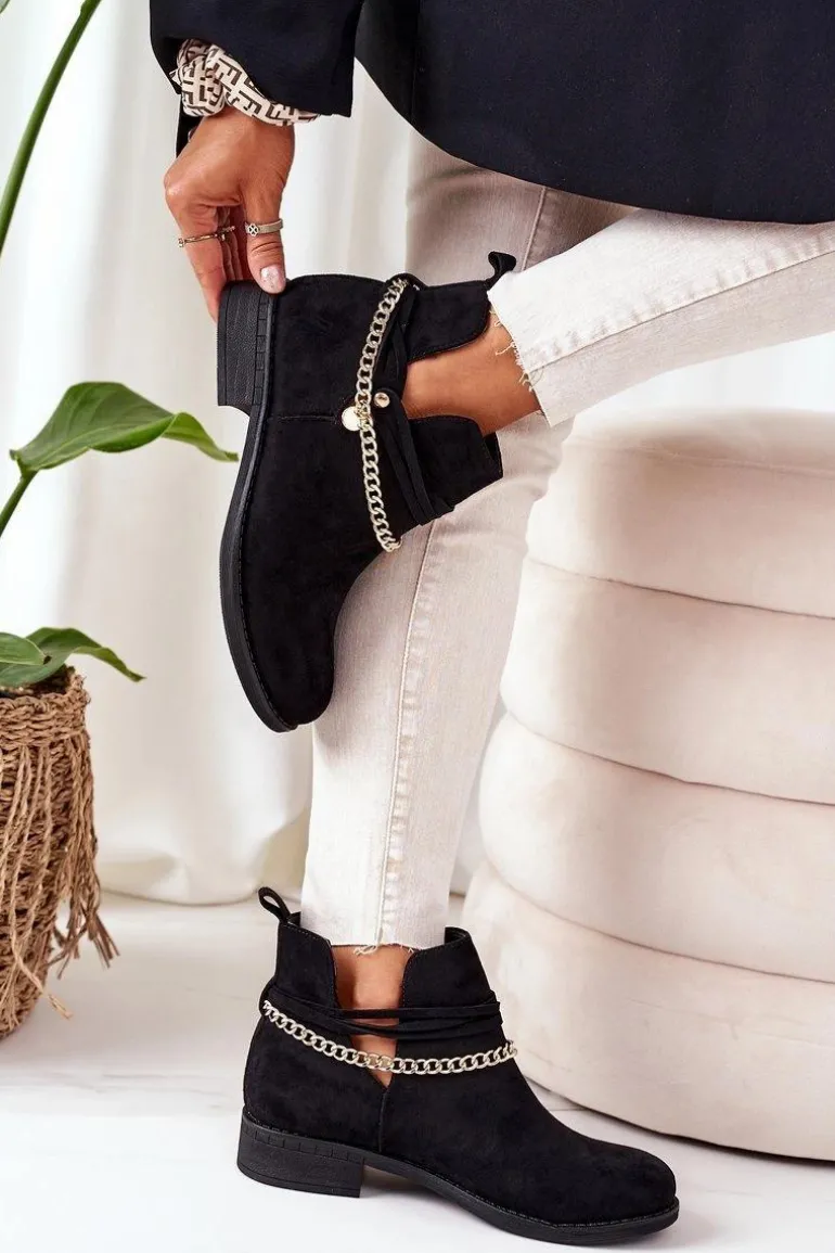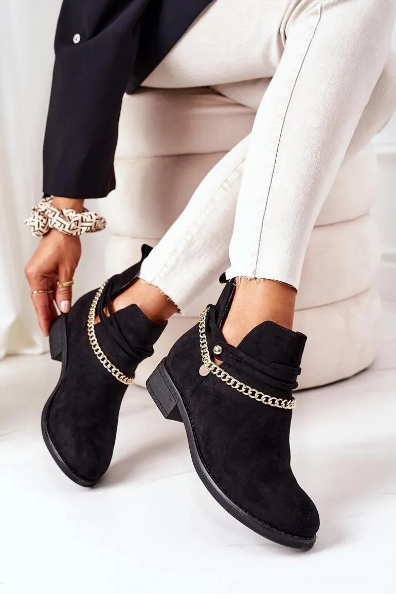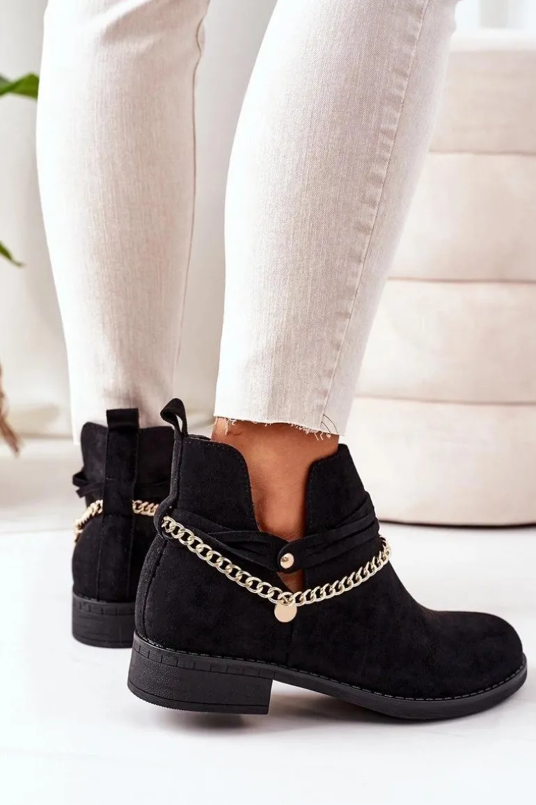 Botki damskie wykonane z eko zamszu ozdobione złotym łańcuszkiem. Przy wyborze rozmiaru prosimy sugerować się tabelą rozmiarów.