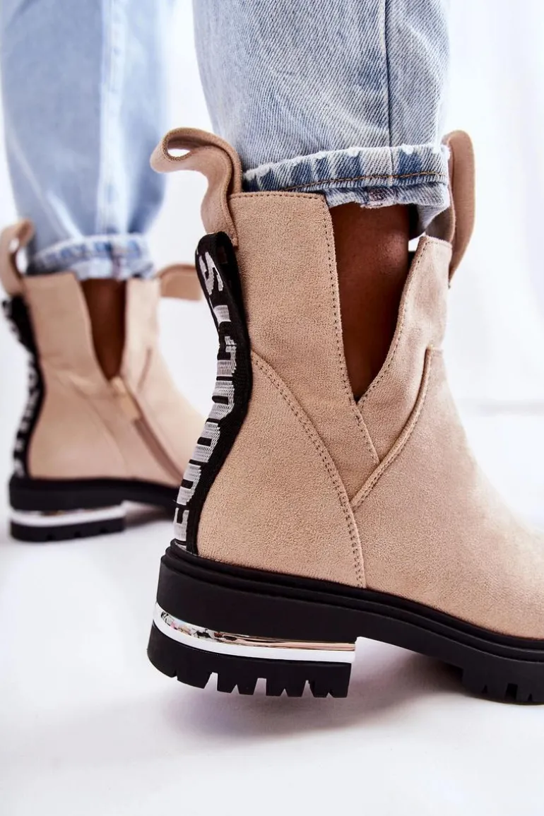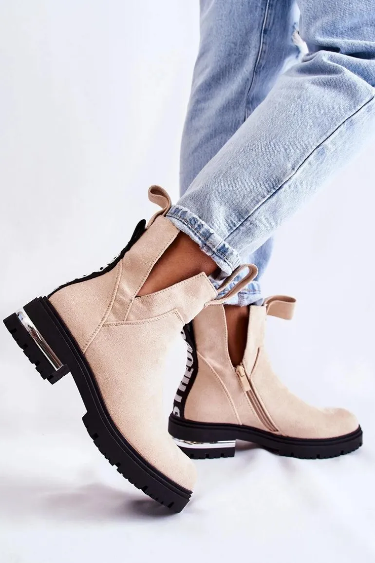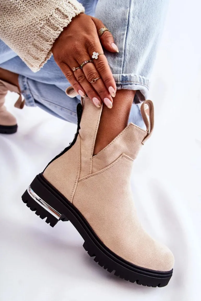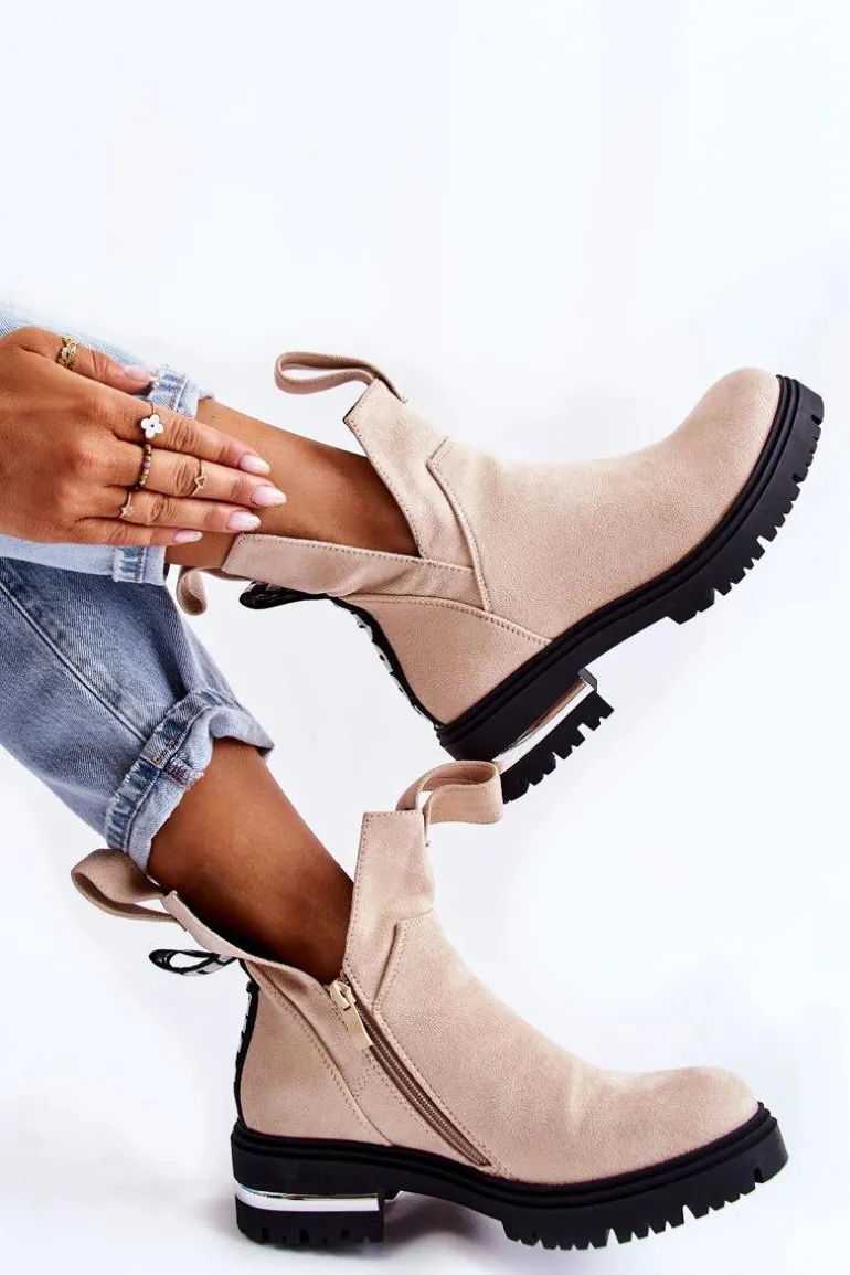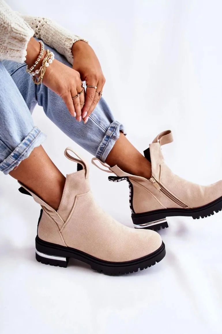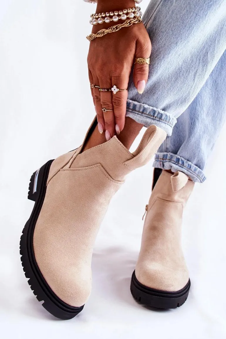 Damskie botki posiadają efektowne wycięcia po bokach cholewki. Z przodu oraz z tyłu posiadają pętelki ułatwiające zakładanie obuwia. Dodatkowo z boku cholewki znajduje się suwak. Botki zostały wykonane z miłego w dotyku eko zamszu. Posiadają usztywniany zapiętek. W środku ocieplone kocem obuwniczym. Osadzone na płaskim obcasie i niewysokiej platformie.Przy wyborze rozmiaru prosimy sugerować się tabelą rozmiarów.