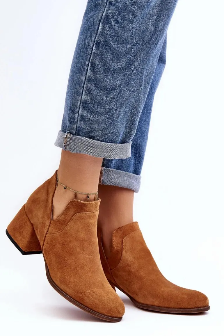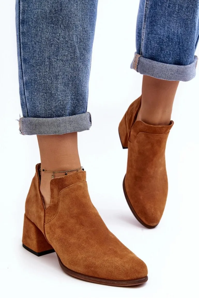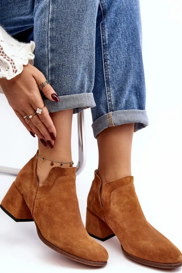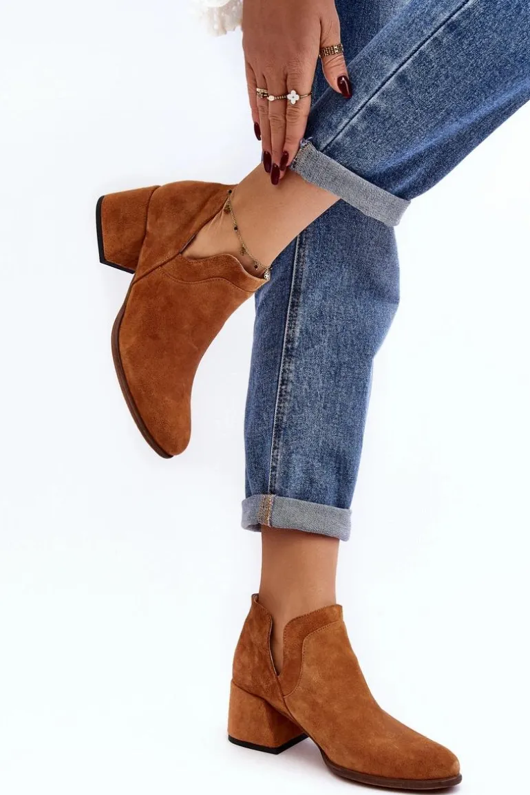 Zamszowe Botki Z Wycięciami Na Obcasie Camel Dalros