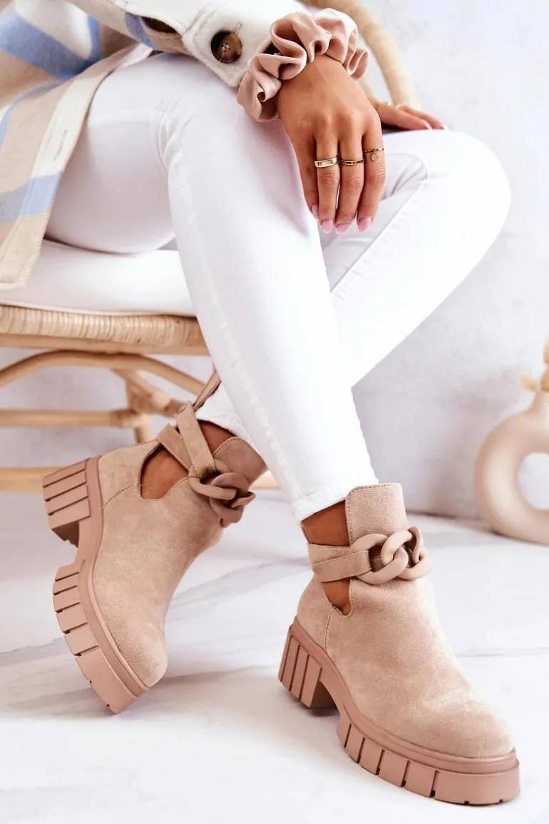 Botki z wycięciem z pewnością podkreślą Twój styl! Wykonane zostały z eko zamszu. Idealne na sezon wiosenno-letni! Model wsuwany. Botki będą pasować do wielu stylizacji. Płaski obcas i masywna podeszwa świetnie będą izolować od zimnego, nierównego podłoża. Pasek z ozdobnym łańcuchem jest zapinany na napę i można go zdjąć. Sprawdź także inne modele botków! Przy wyborze rozmiaru prosimy sugerować się tabelą rozmiarów.