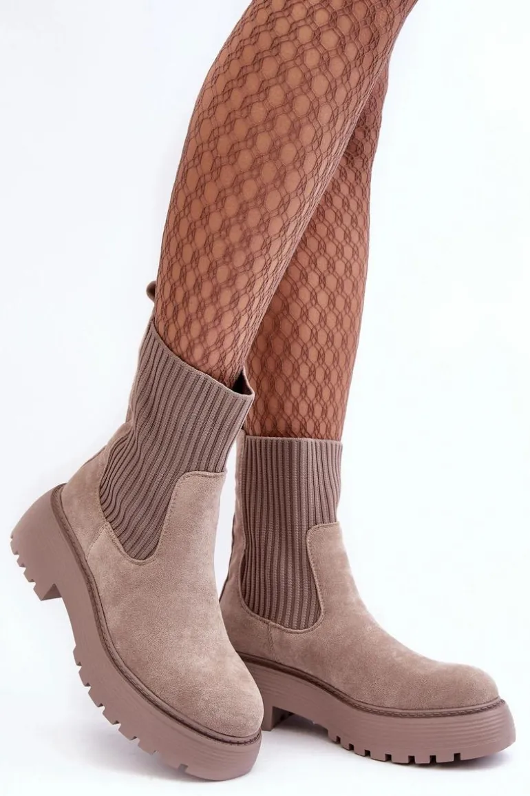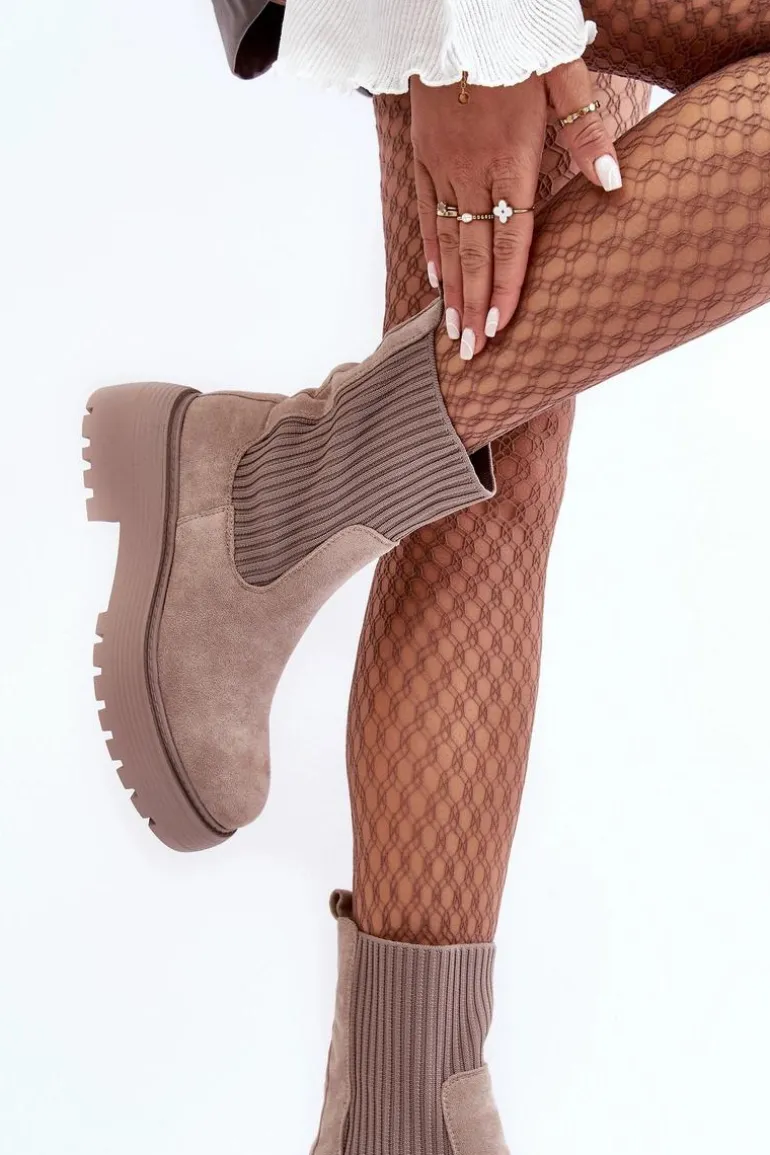 Zamszowe Botki Ze Skarpetą Na Platformie I Płaskim Obcasie Ciemnobeżowe Rewam